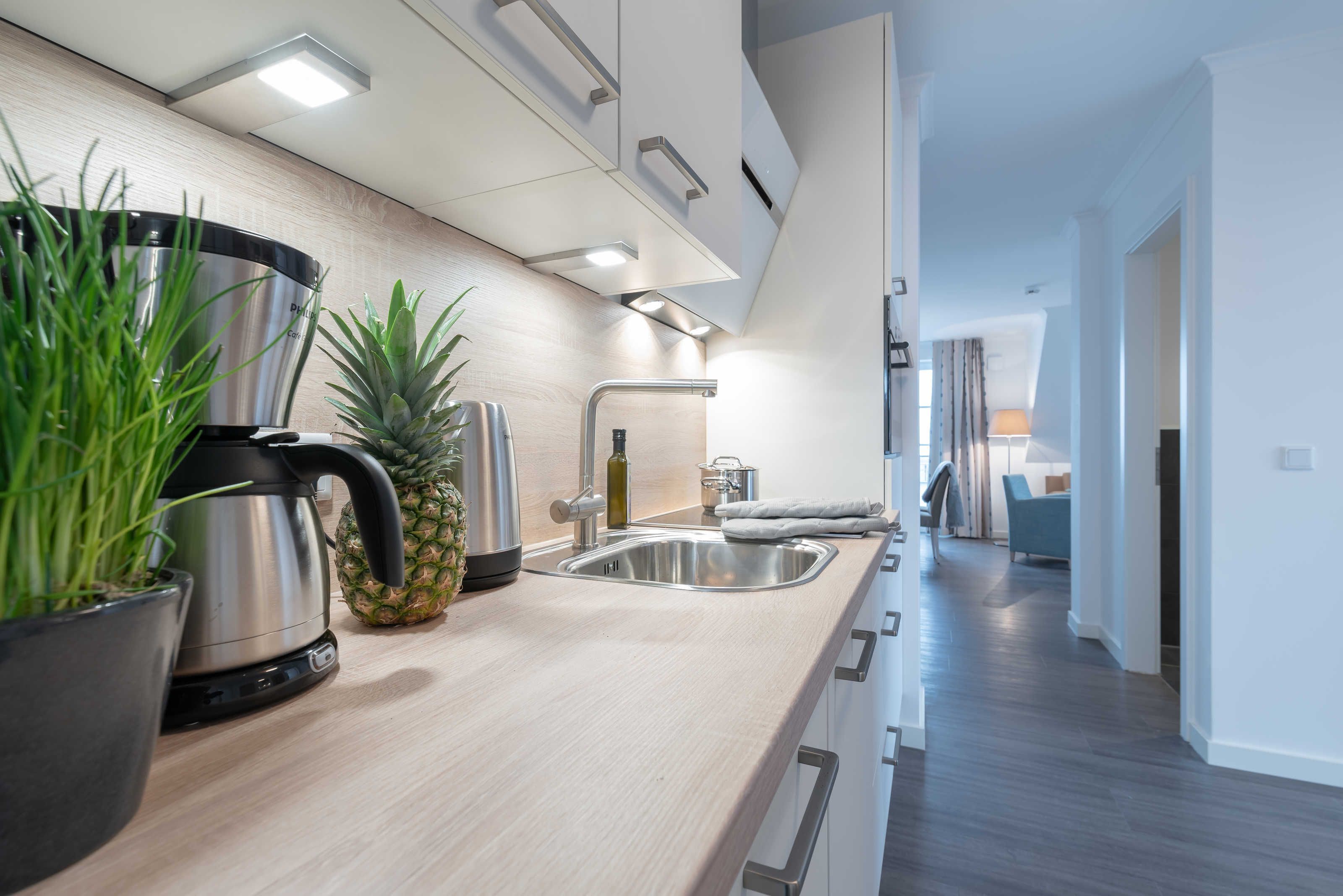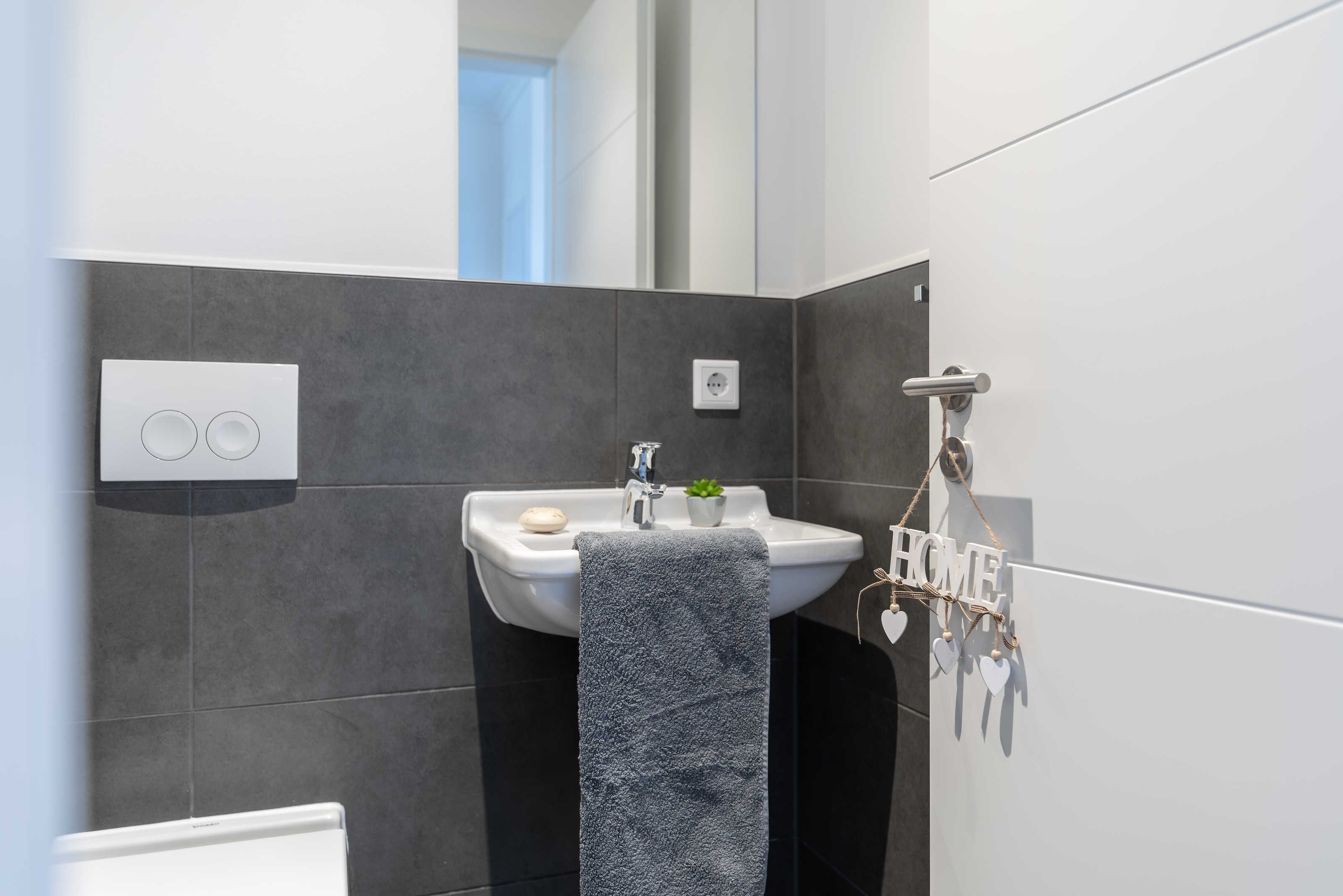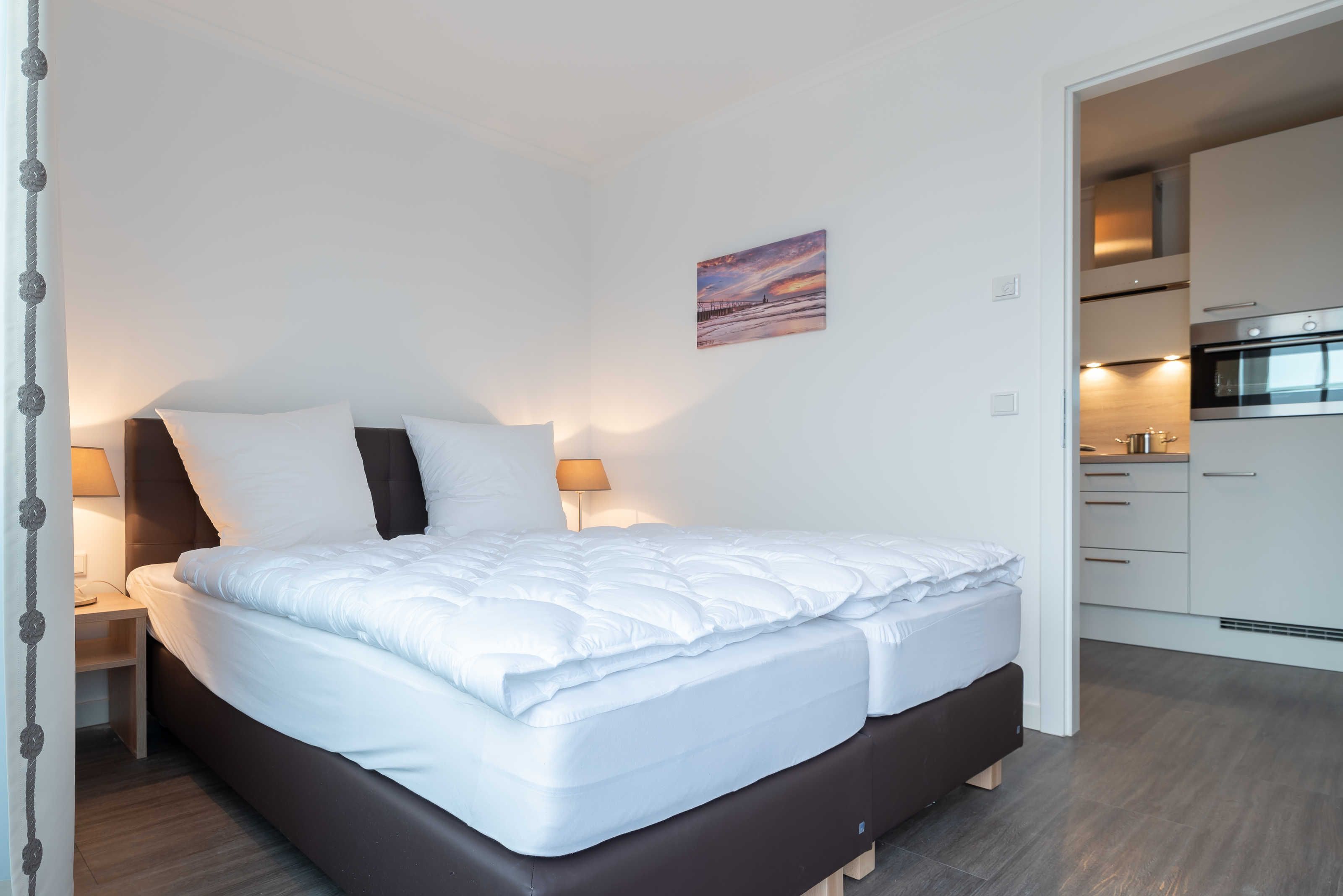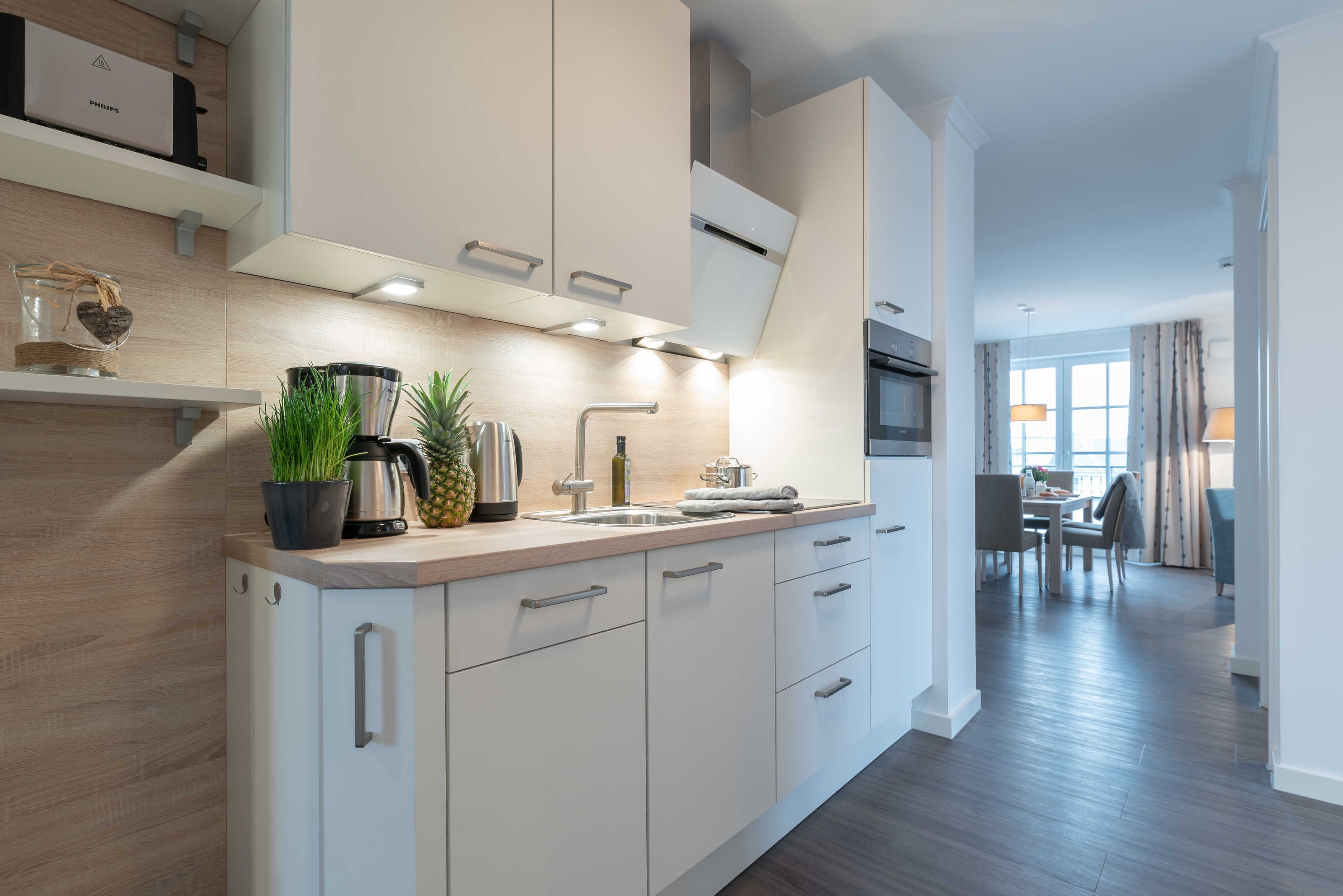 Herzstück der Wohnung ist der offene Wohn- und Essbereich. Eine gemütliche Sitzecke mit Eckcouch (inkl. Schlaffunktion), zwei Sessel und ein Flat-TV laden zum Relaxen ein. In der hellen Wohnküche finden Sie alles, was Sie zum Kochen benötigen inklusive einem Herd mit Glaskeramik-Kochfeld und Backofen, einer Kühl-Gefrierkombi, einem Geschirrspüler, modernen Küchengeräten und hochwertigem Geschirr. Der große Esstisch mit sechs Stühlen ist der ideale Platz für ausgiebiges Schlemmen und Zusammensitzen. Bodentiefe Fenster sorgen für viel Licht und führen auf einen der beiden Balkone mit Meerblick. Dort erwarten Sie komfortable Terrassenmöbel. Frühstücken Sie mit traumhaftem Ausblick oder lassen Sie den Tag bei einem Glas Wein am Abend Revue passieren was kann es Schöneres geben? Zwei Schlafzimmer sorgen für erholsame Träume. Jedes Zimmer verfügt über einen großen Kleiderschrank für Ihr Urlaubsgepäck. Kommen Sie an und fühlen Sie sich wie zu Hause. Besonderen Komfort bietet das größere Schlafzimmer mit einem Boxspringbett mit Bandscheiben-Federkernmatratzen (1,80 x 2,00 m), einem weiteren Flat-TV sowie dem Zugang zum zweiten Meerblick-Balkon. Zusätzlich zum Hauptbad mit bodentiefer Dusche, einem großen Waschtisch, Wandspiegel und Fön steht den Gästen ein zusätzliches separates WC zur Verfügung.
