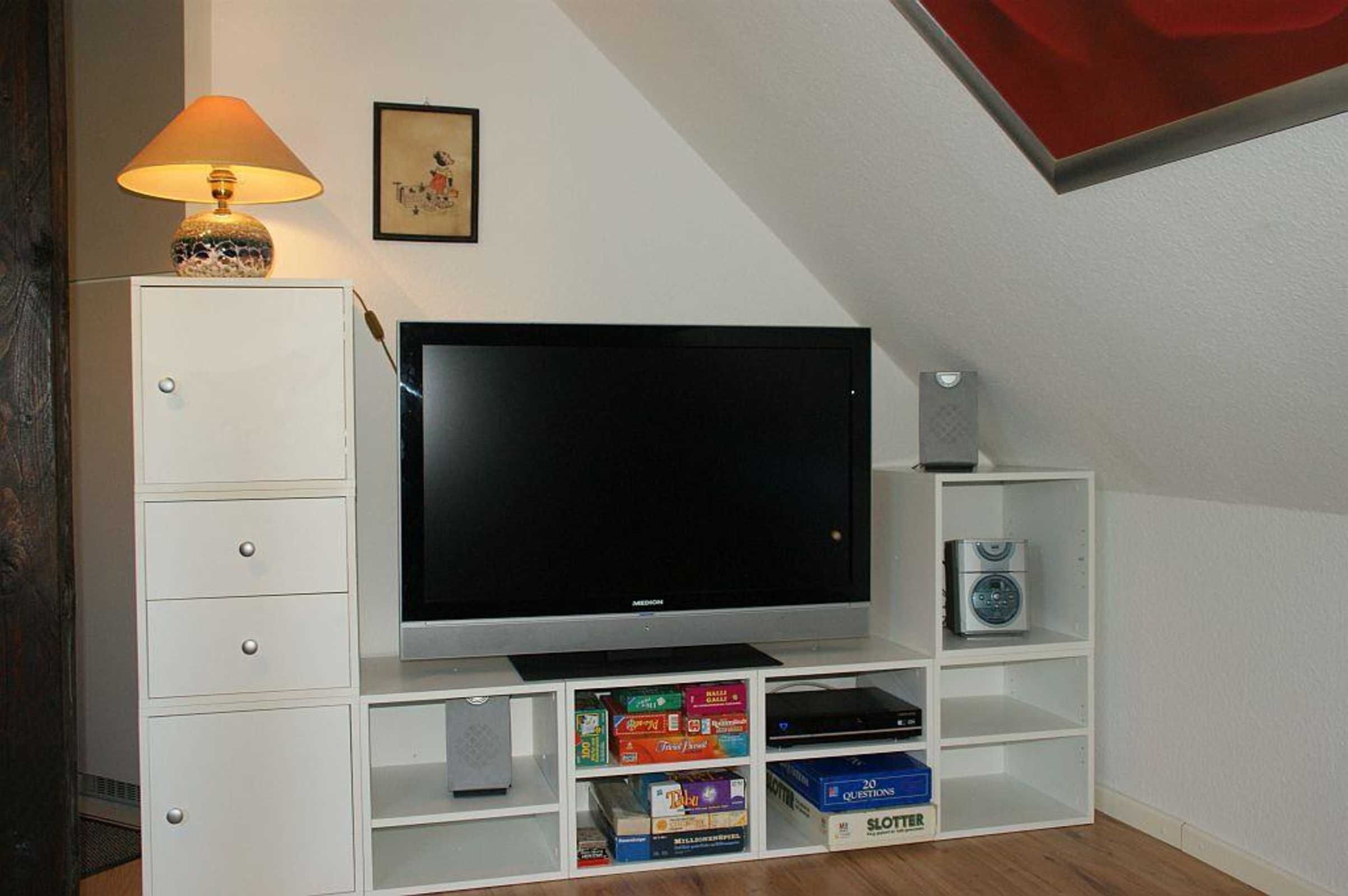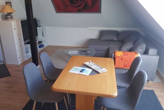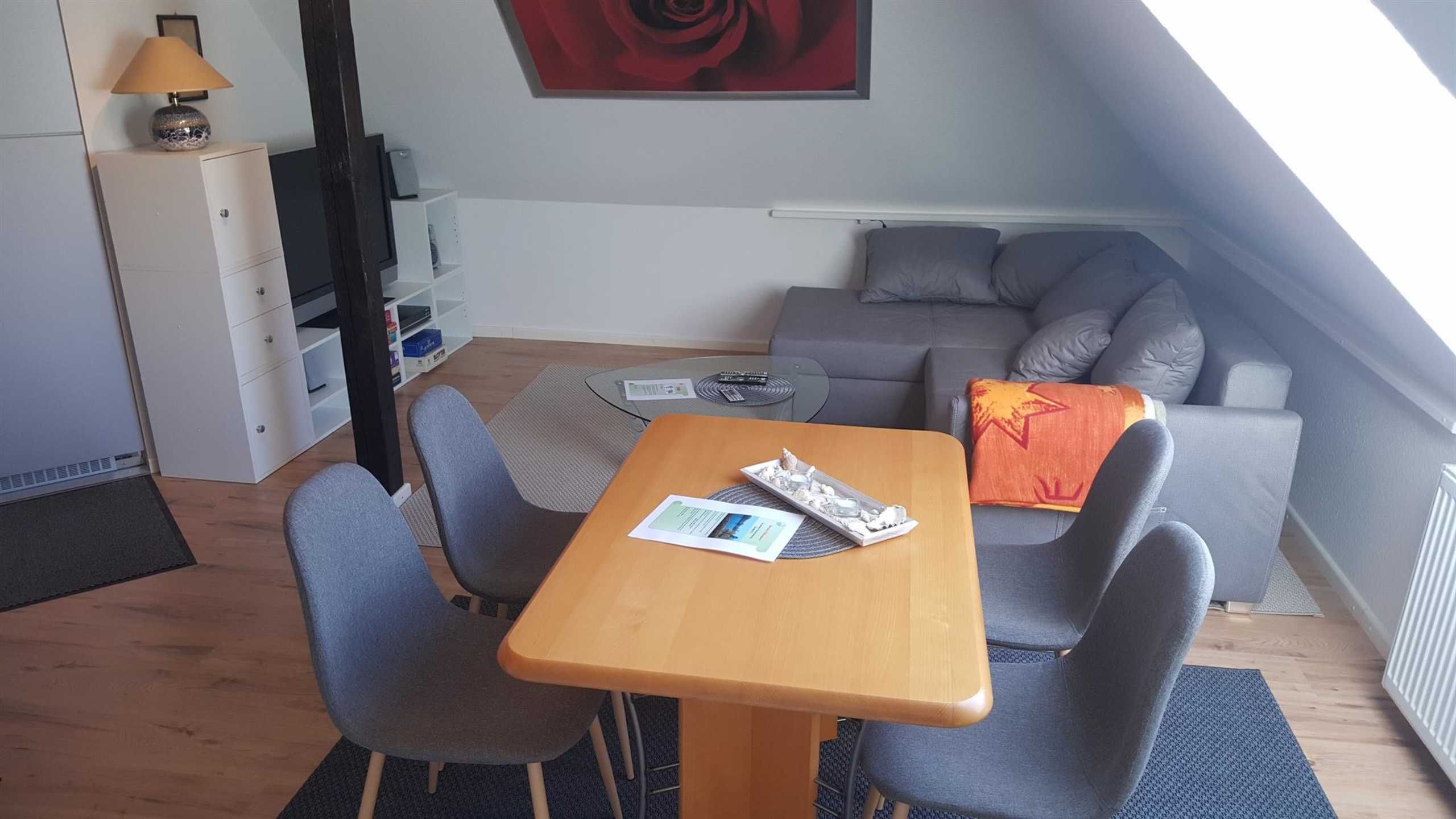 Im zweiten Zimmer befindet sich der Wohnbereich. Der beinhaltet ein Französisches Bett 1,40 m x 2,00 m, eine Polster Rundecke mit einem Wohnzimmertisch welcher zu einem entspannten Spiele- oder Fernsehabend einlädt. Im Zimmer ebenfalls vorhanden ist ein Fernseher, SAT-Anlage, Receiver, Radio und ein Esstisch mit 4 Stühlen.