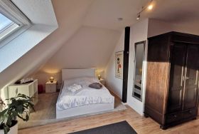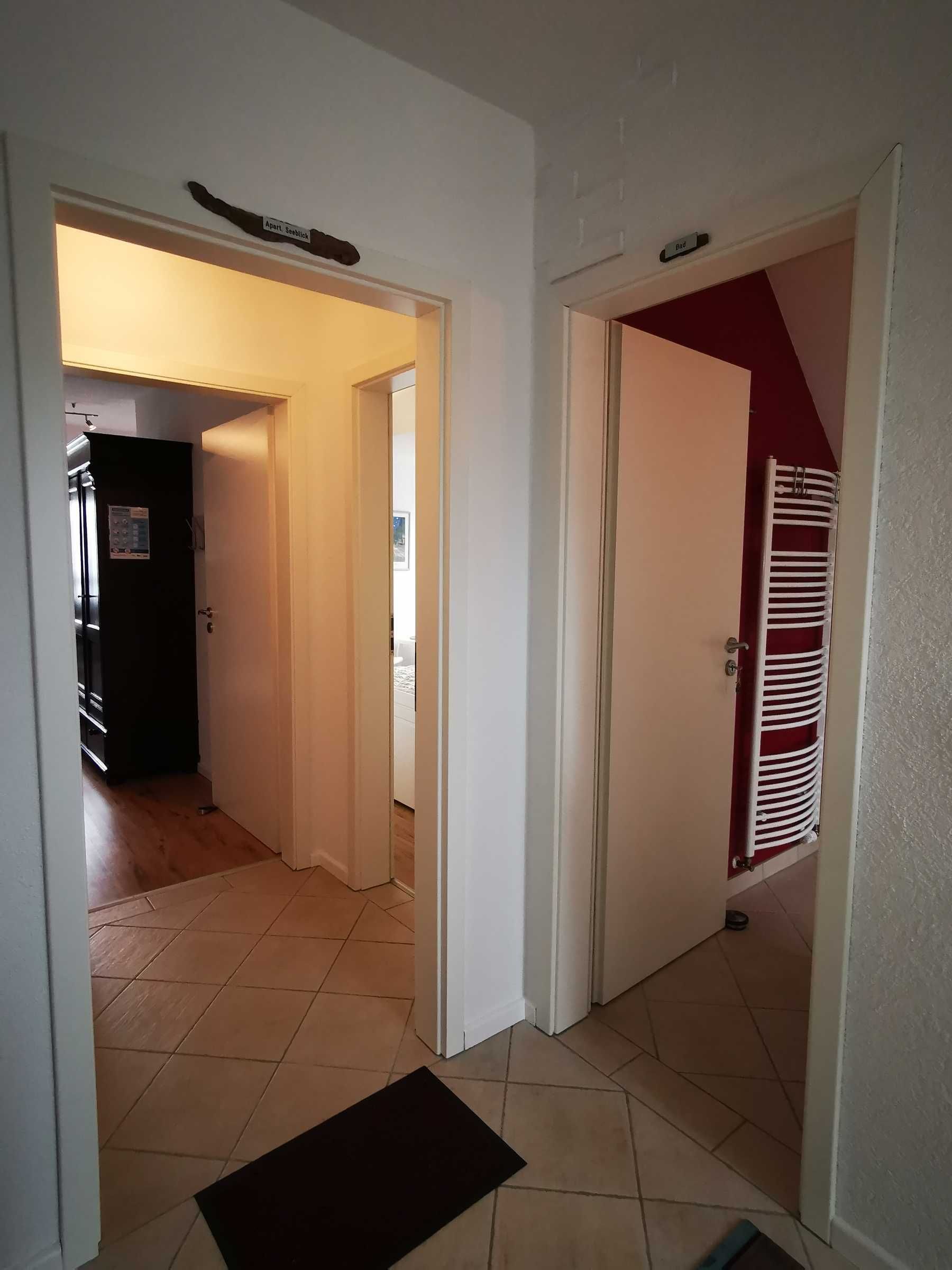 Das gesamte Appartement hat eine Größe von 52 qm und befindet sich im Obergeschoss des Wohnhauses. Durch einen gemeinsamen Hauseingang gerlangen Sie in den Flur. Unser Wohnbereich wird durch eine zusätzliche Zwischentür abgetrennt. Über eine Treppe gelangen Sie ins Obergeschoss, der mit einen Vorflur und einer kleinen Infoecke versehen ist.