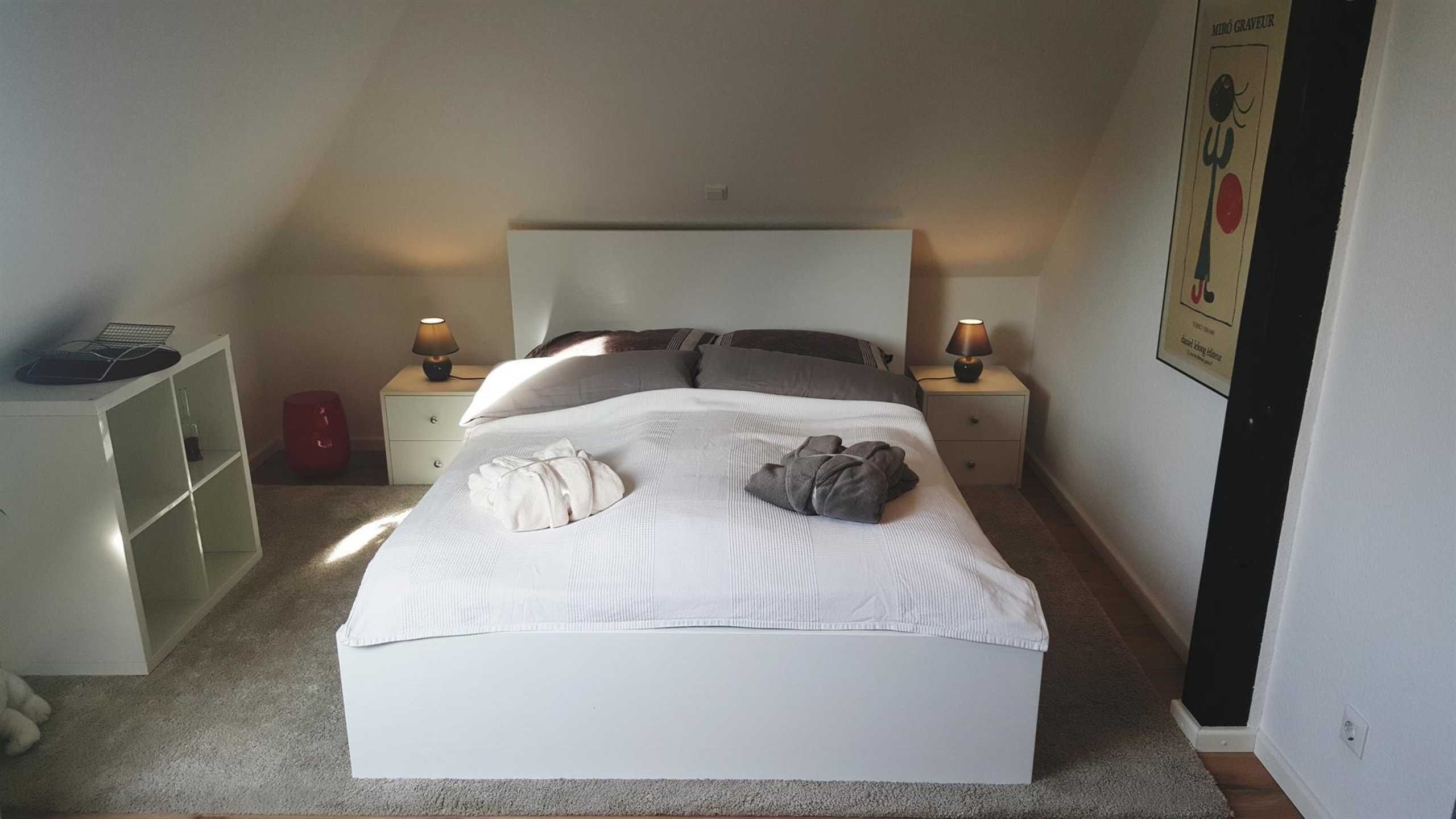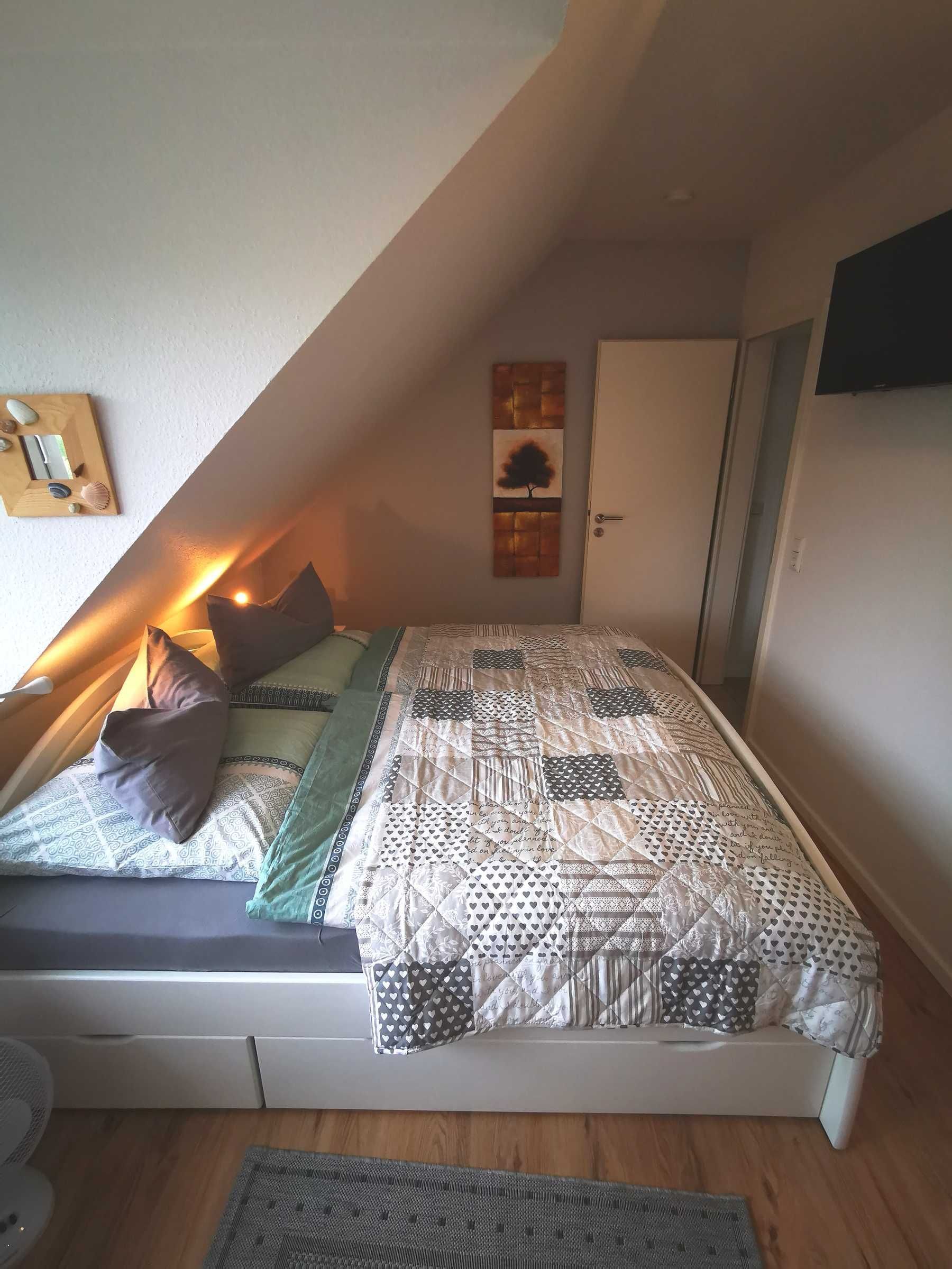 Ein gemütliches Schlafzimmer in der Größe von 10 qm. Ein Doppelbett in der Größe von 1,80 m x 2,00 m, ein Kleiderschrank mit Bügel und Regale, eine kleine Sitzmöglichkeit sowie ein Smart TV, runden den extra Schlafbereich ab.