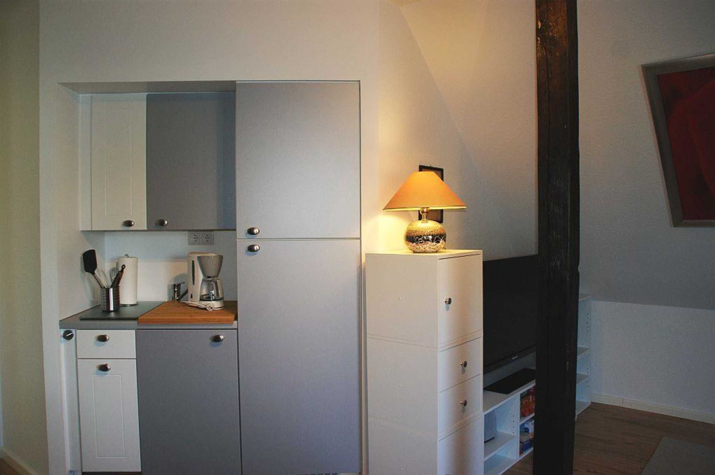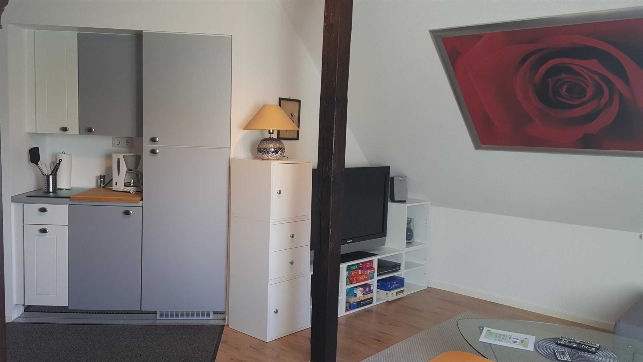 Der Küchenbreich besteht aus einer kleinen Pantryküche. Diese verfügt über einen Einbaukühlschrank mit Gefrierfach, 2-Platten Ceranfeld, Mikrowelle mit integrierter Grill- und Backfunktion, Kaffeemaschine, Toaster, Eierkocher und Wasserkocher sowie Geschirr, Besteck, Kochtöpfe, Pfanne und Schneideunterlage.