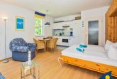 Dieses modern und liebevoll gestaltete Einraumappartement ist sehr gut geeignet für einen entspannten Ostseeurlaub mit zwei Personen. Das große Schrankbett (200 x 160 m) nimmt am Tag keinen Platz weg und die moderne Küchenzeile mit Backofen bietet beste Voraussetzungen zur Selbstbeköstigung.