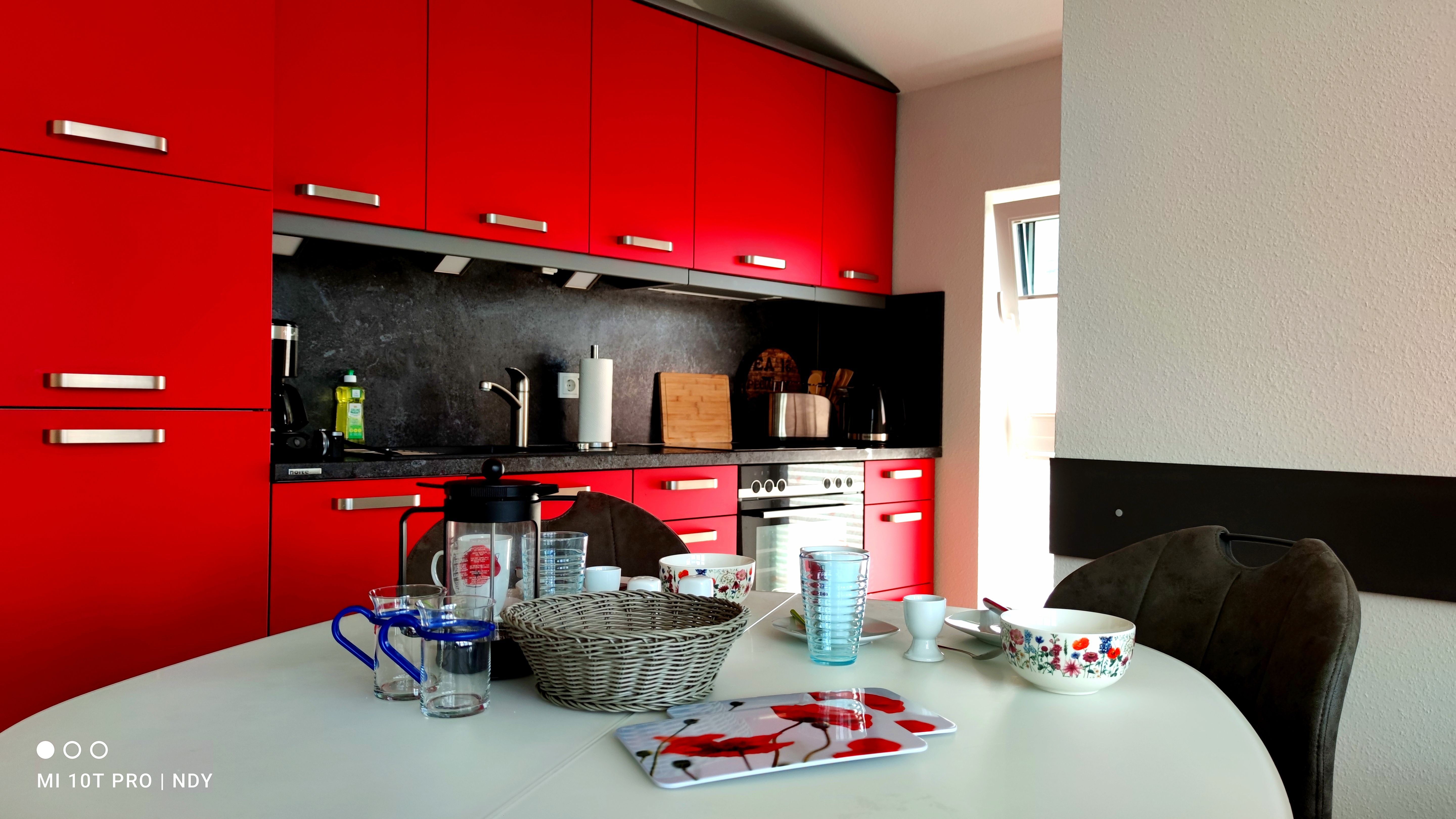 Küche mit Spülmaschine, Herd mit Backofen, Kühlschrank, Mikrowelle