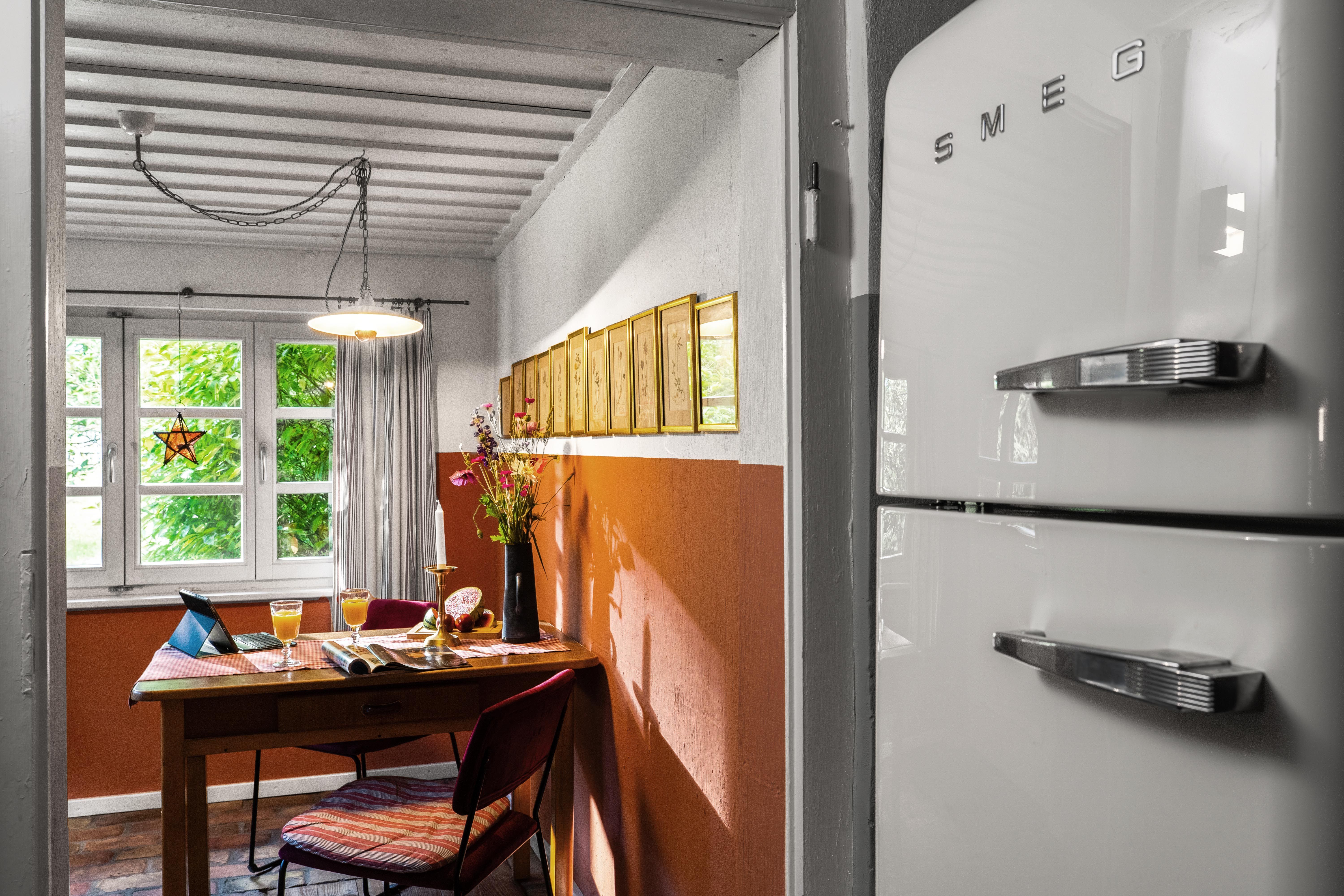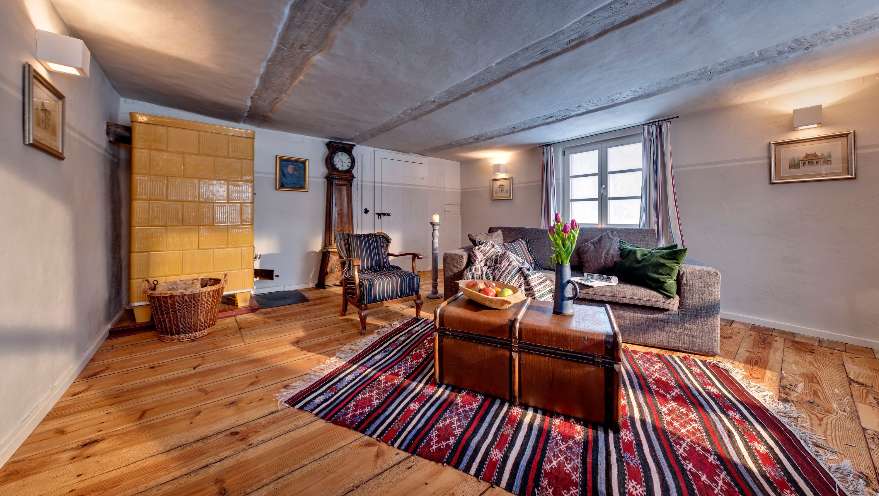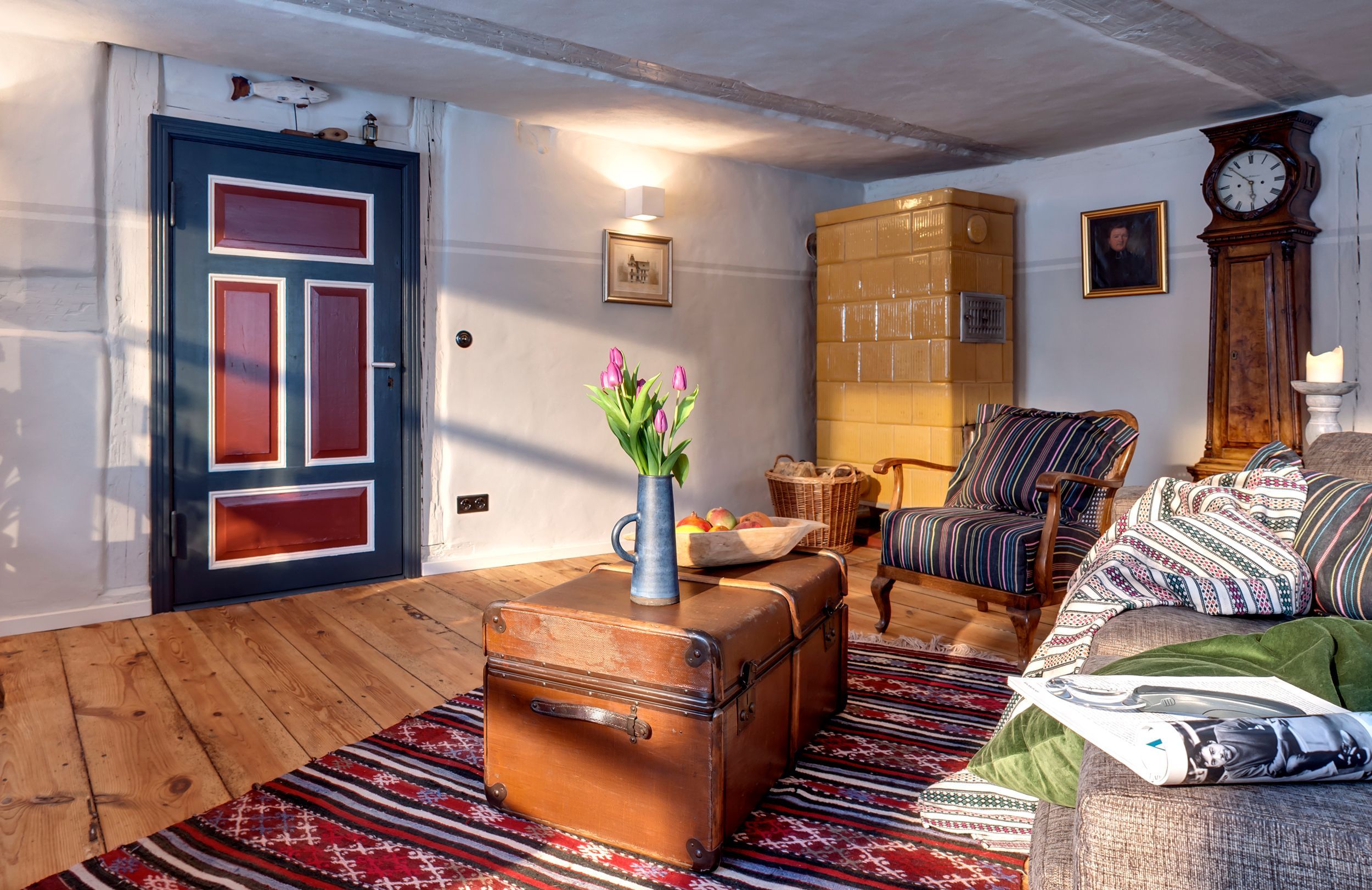 Auf 90 m² erwarten Sie heute ein Wohnraum mit Kachelofen, Flachbild-TV, DVD, Stereo-Anlage, ein Esszimmer mit Essplatz, eine vollausgestattete Küche mit Spülmaschine, Backofen, Keramikkochfeld und Kühlschrank, die Küche als architektonische Besonderheit integriert in der historischen Esse des Hauses. Weiterhin gibt es ein Schlafzimmer mit Doppelbett, ein Bad mit WC, Waschbecken, Dusche, Waschvollautomat. Entdecken Sie die für diesen Gebäudestil typischen Lehmwände, welche mit Lehmfarben veredelt wurden und eine besonders positive Wirkung auf das Raumklima entfalten. Zum Teil noch erhaltene Originalmöbel des Hauses wurden liebevoll restauriert und mit passenden antiken Möbeln ergänzt.