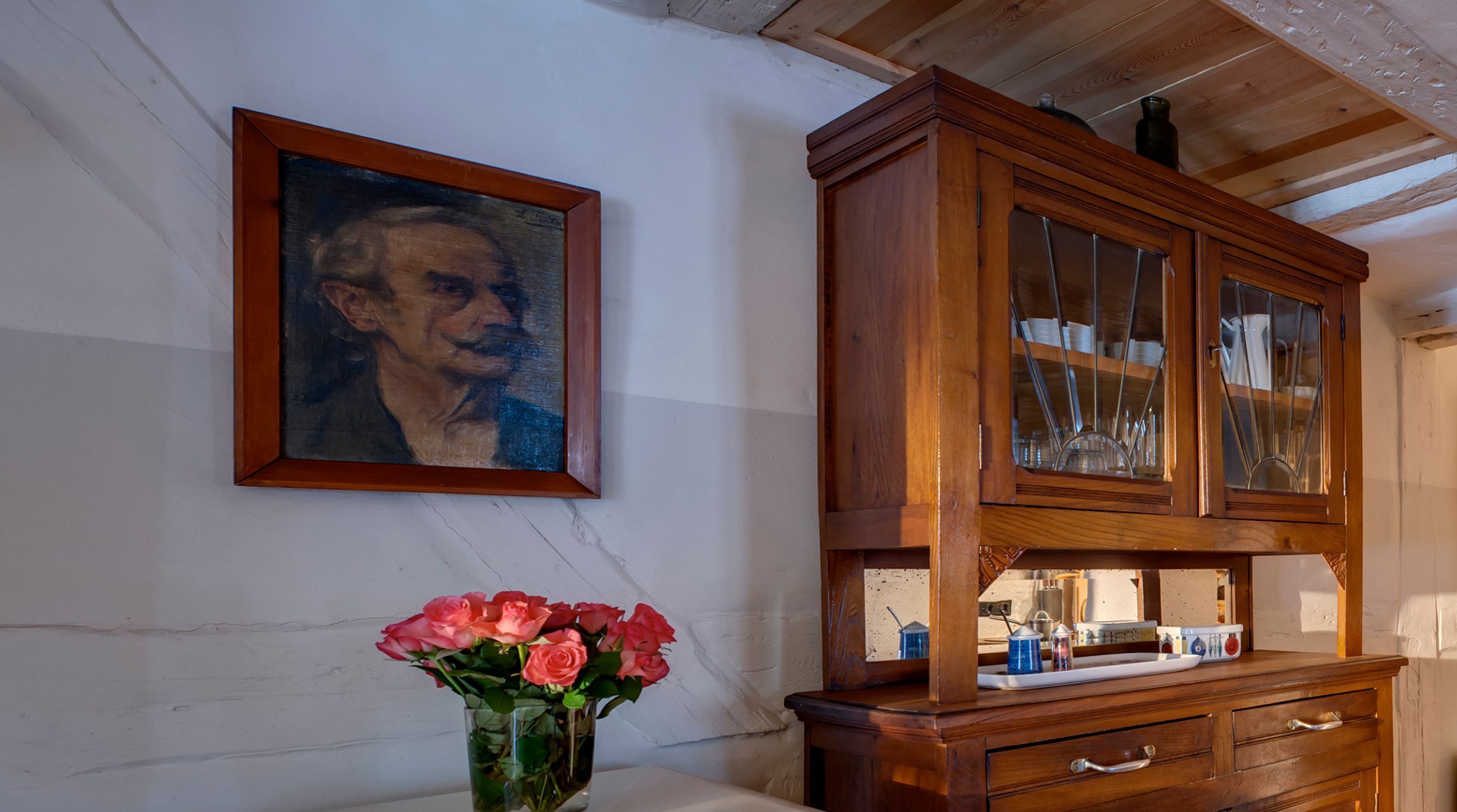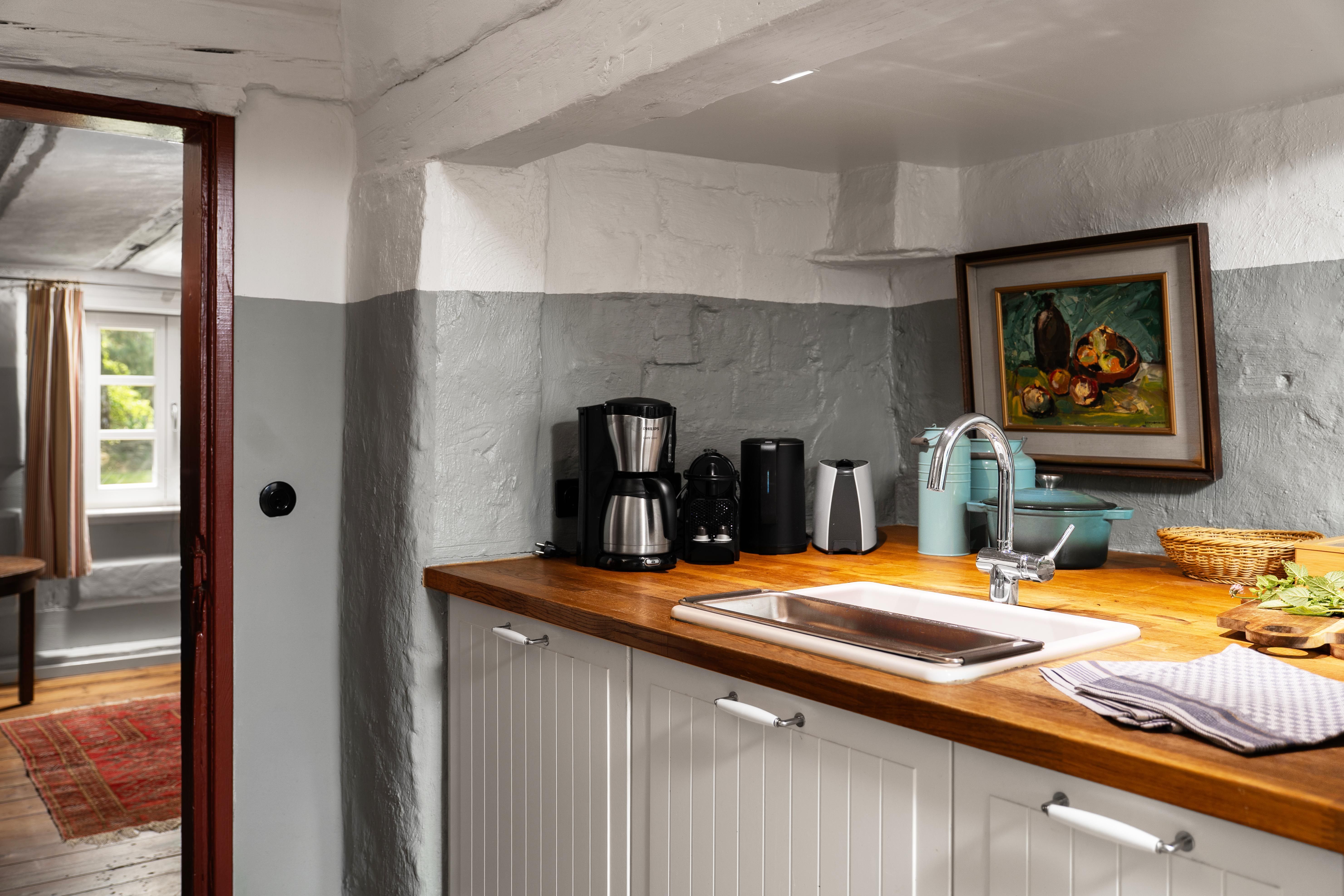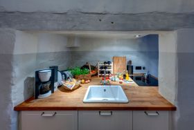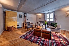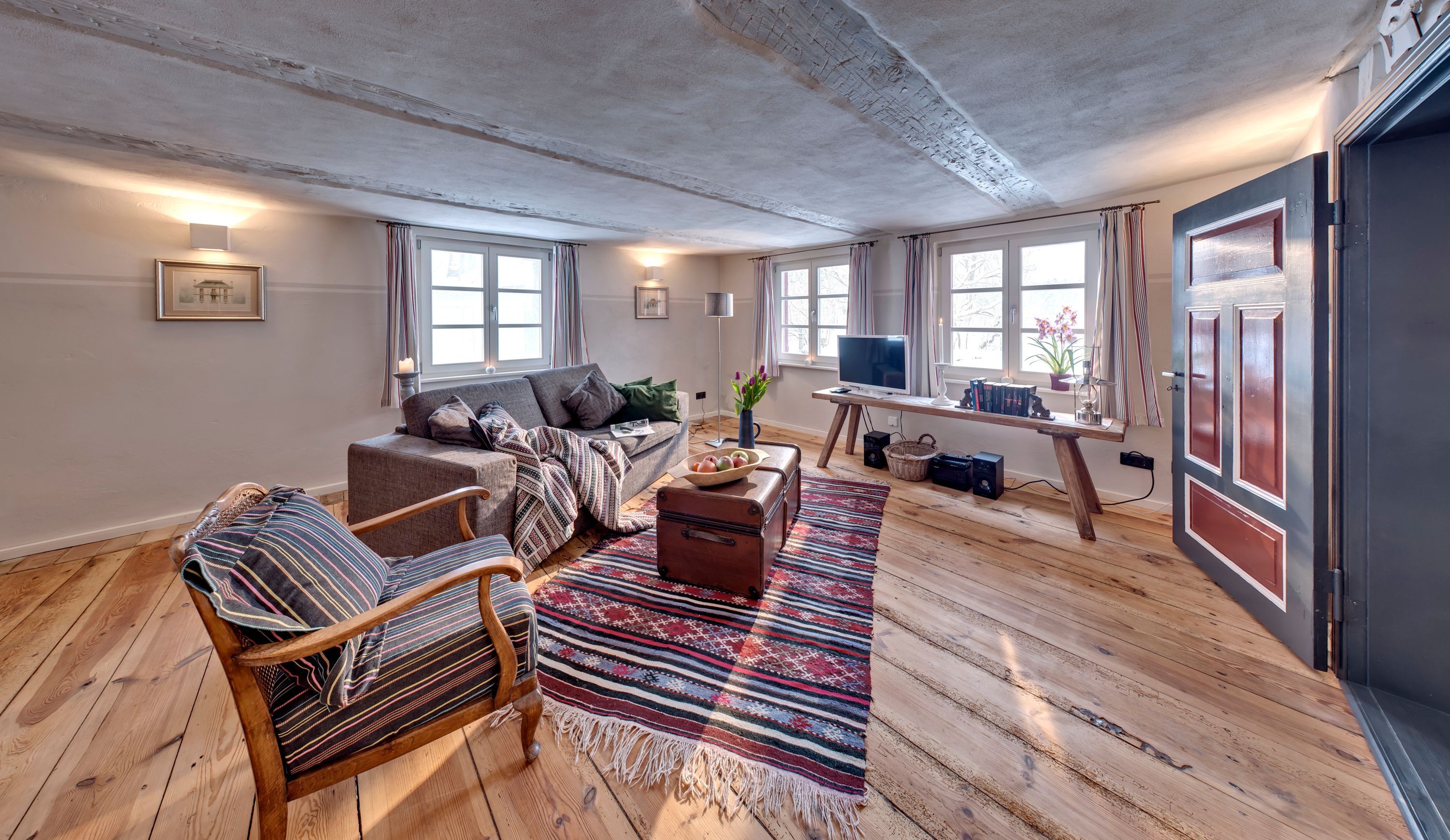 Auf 90 m² erwarten Sie heute ein Wohnraum mit Kachelofen, Flachbild-TV, DVD, Stereo-Anlage, ein Esszimmer mit Essplatz, eine vollausgestattete Küche mit Spülmaschine, Backofen, Keramikkochfeld und Kühlschrank, die Küche als architektonische Besonderheit integriert in der historischen Esse des Hauses. Weiterhin gibt es ein Schlafzimmer mit Doppelbett, ein Bad mit WC, Waschbecken, Dusche, Waschvollautomat. Entdecken Sie die für diesen Gebäudestil typischen Lehmwände, welche mit Lehmfarben veredelt wurden und eine besonders positive Wirkung auf das Raumklima entfalten. Zum Teil noch erhaltene Originalmöbel des Hauses wurden liebevoll restauriert und mit passenden antiken Möbeln ergänzt.