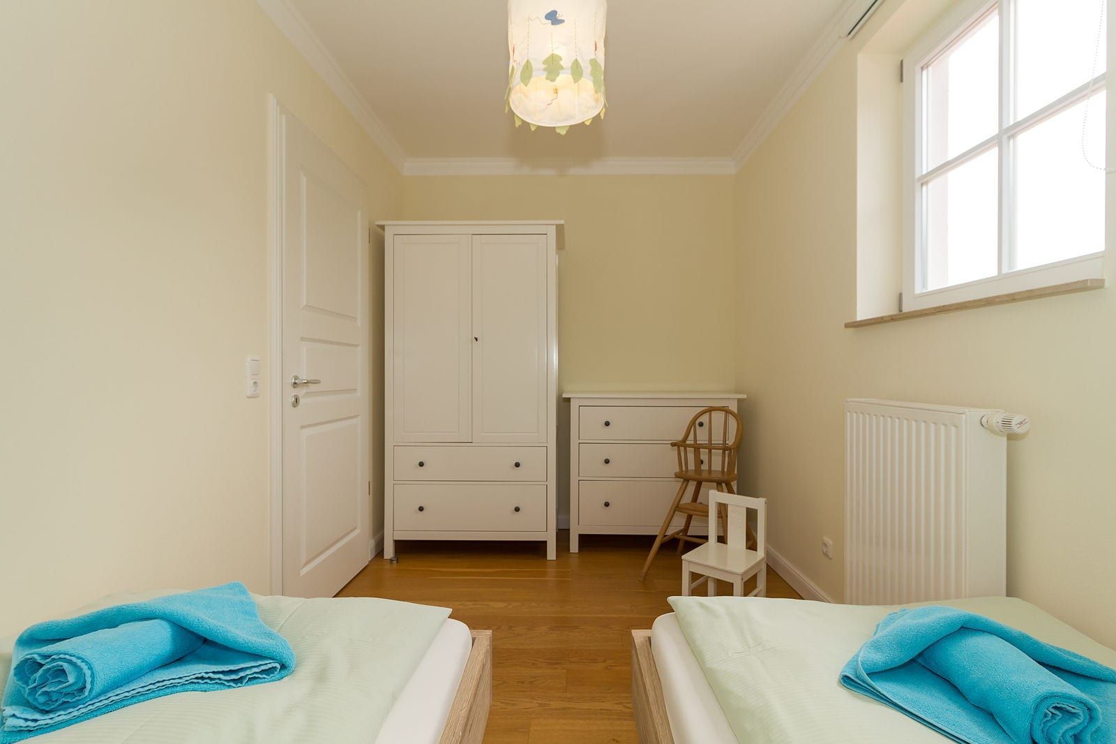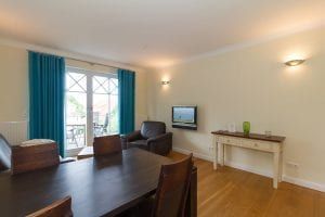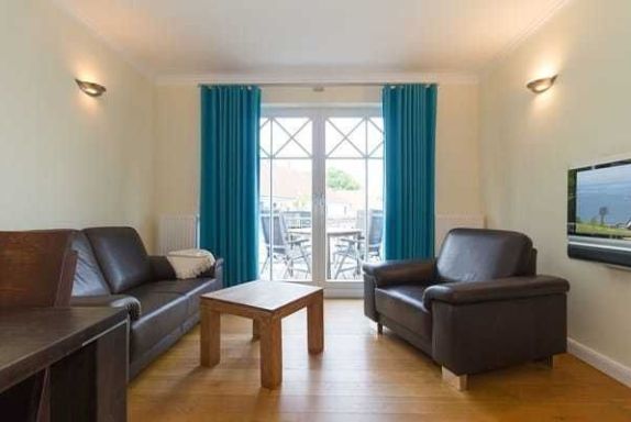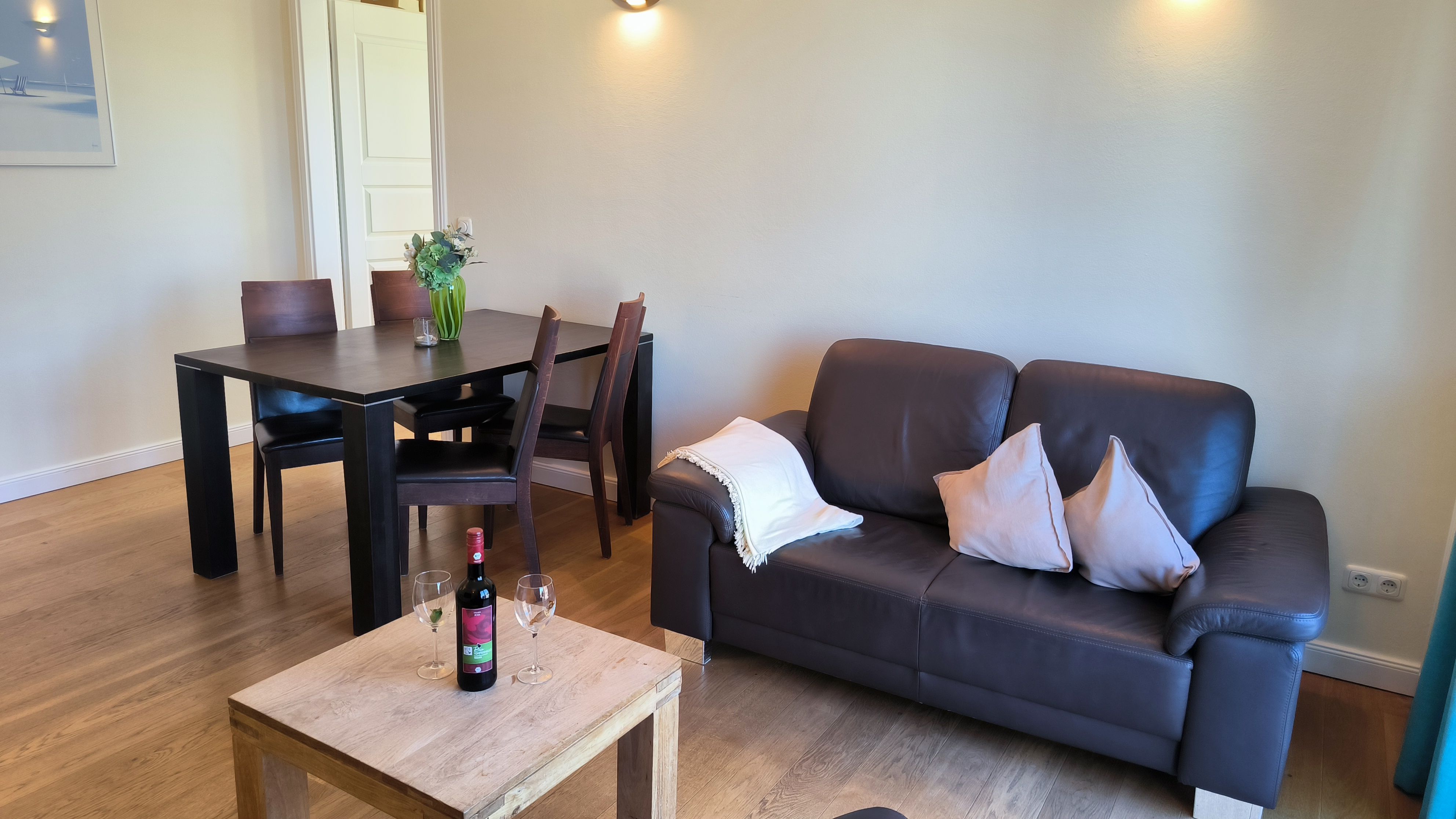 Der gesamte Wohnbereich, Küche und Schlafzimmer sind mit einem hochwertigen Dielenholzfußboden ausgestattet. Das Badezimmer ist gefliest. Auf den beiden Balkonen wurde Bangkirai Holz verlegt. Das Wohnzimmer bietet ein Ledersofa mit passendem Sessel und einen modernen LCD Fernseher. Wenn Sie lieber den Sonnenuntergang betrachten möchten, treten Sie einfach auf den Balkon und genießen Sie die Aussicht. Im Essbereich stehen 4 Stühle und ein großer Tisch zur Verfügung, ein Kinderhochstuhl ist ebenfalls vorhanden. Auf Freunde von Espresso oder Latte Macchiato wartet in der Küche eine Krups Espresso Maschine.