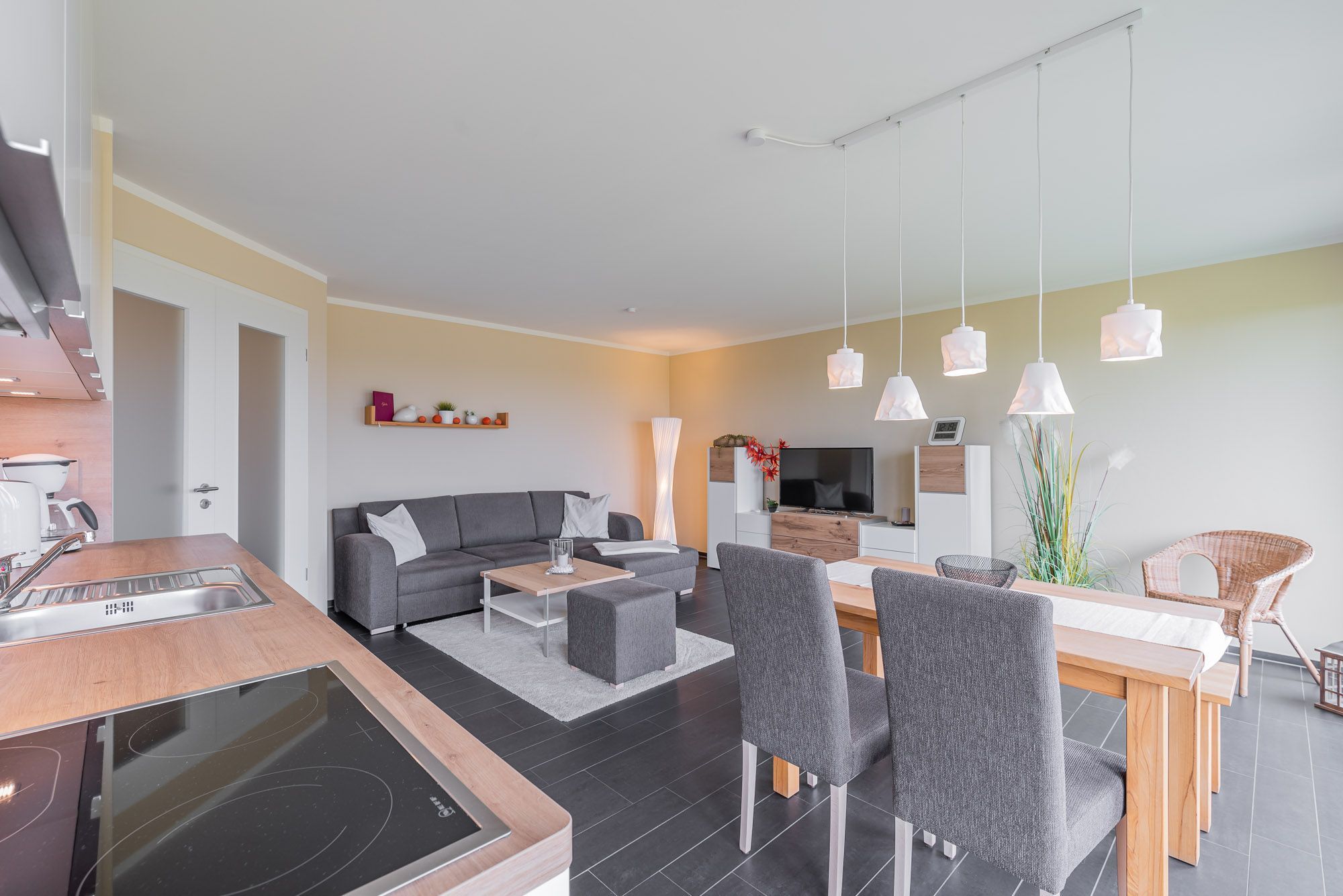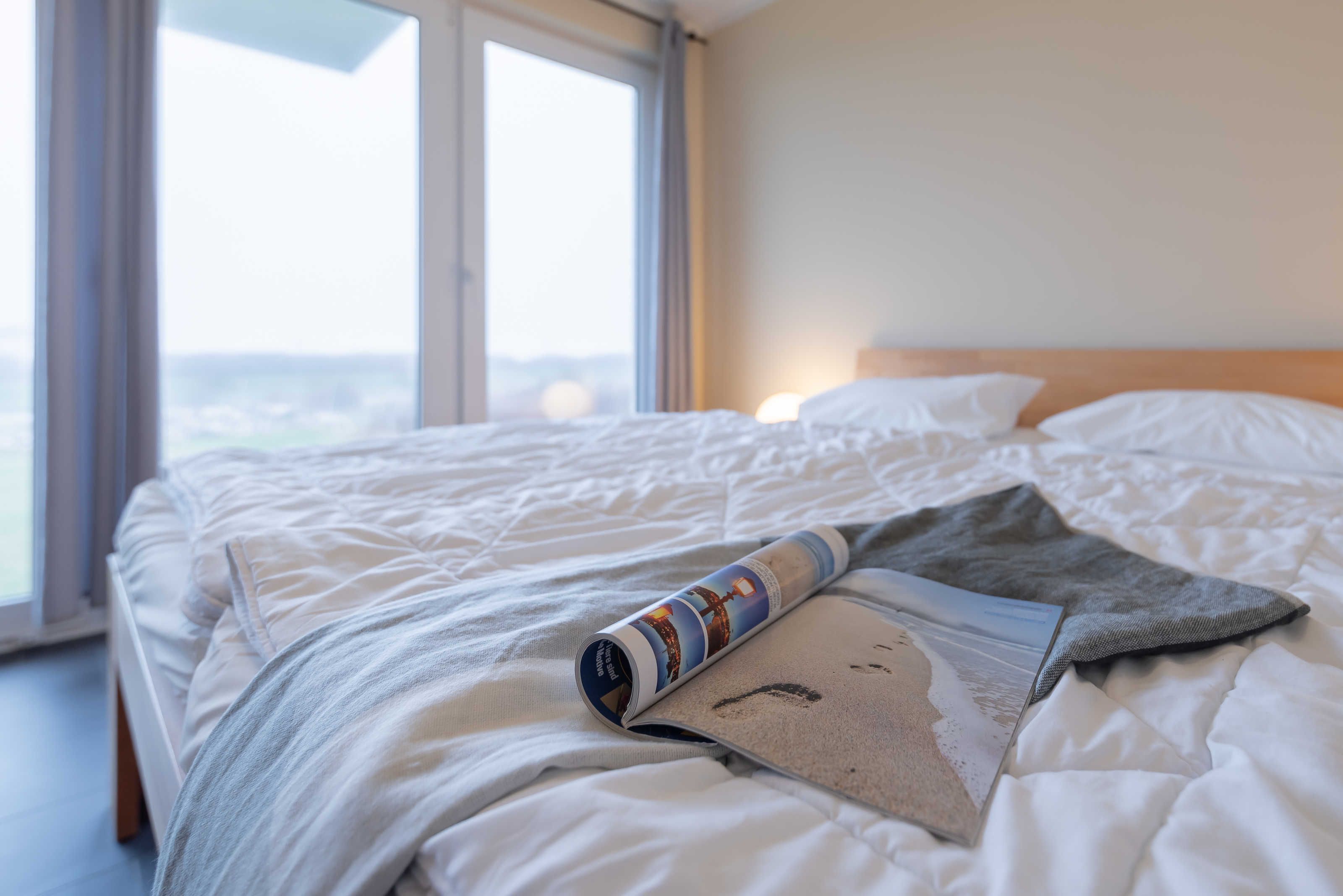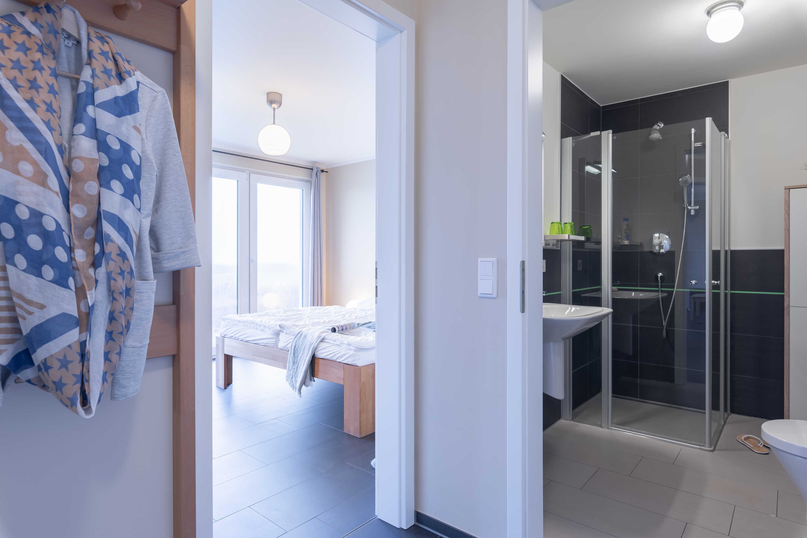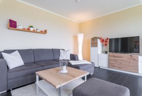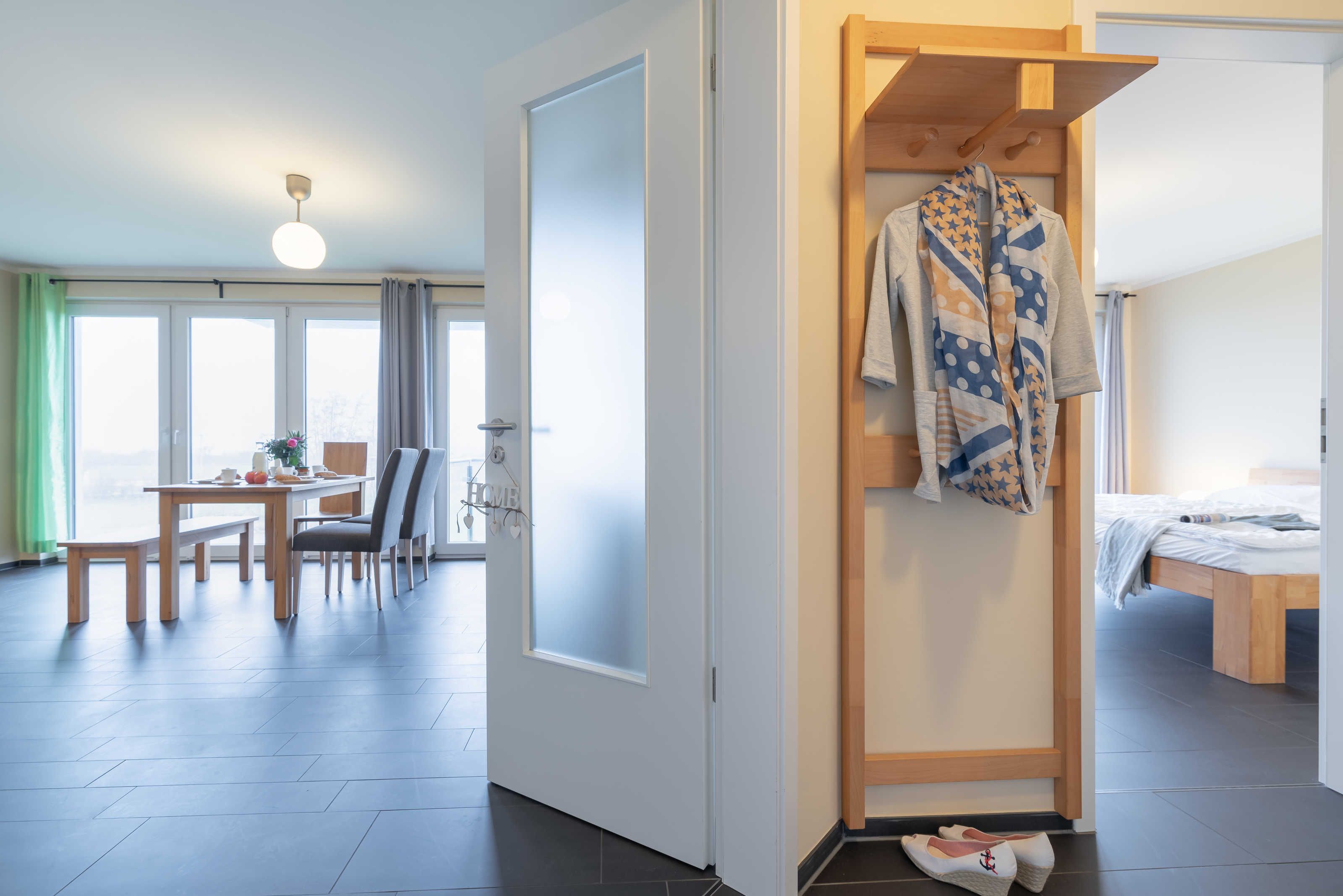 Im Flur der Ferienwohnung befindet sich genügend Platz für die Ablage von Strandutensilien. Der gemütliche Couchbereich (ausziehbar 1,6 x 2,0 m) mit Fernseher im offenen Wohn- und Kochbereich lädt zu erholsamen Abenden und zum Träumen mit Blick auf den Deich ein. Die offene Küche mit großzügigem Essbereich, ist komfortabel ausgestattet für kleine Kochabende. Geschirrspüler und verschiedenes Koch- und Esszubehör sind vorhanden. Der kleine Balkon in Nordausrichtung ist perfekt für das Frühstücken im Sommer geeignet. Das Schlafzimmer besitzt ein großes Bett (2,0 x 1,8 m / getrennte Matratzen) und einen geräumigen Kleiderschrank. In dem modernen Badezimmer befinden sich eine ebene Dusche sowie ein großer Spiegel und ein Haartrockner für die perfekte Föhnwelle.