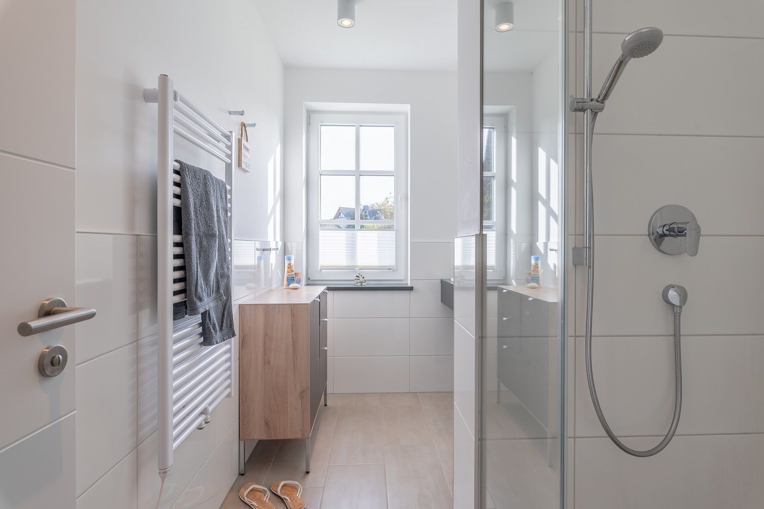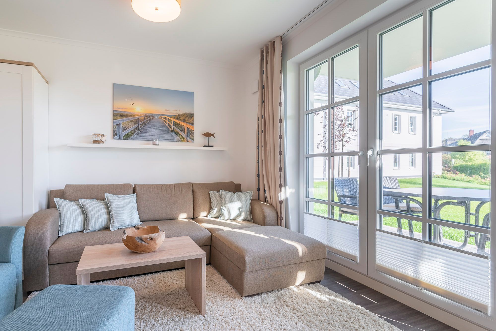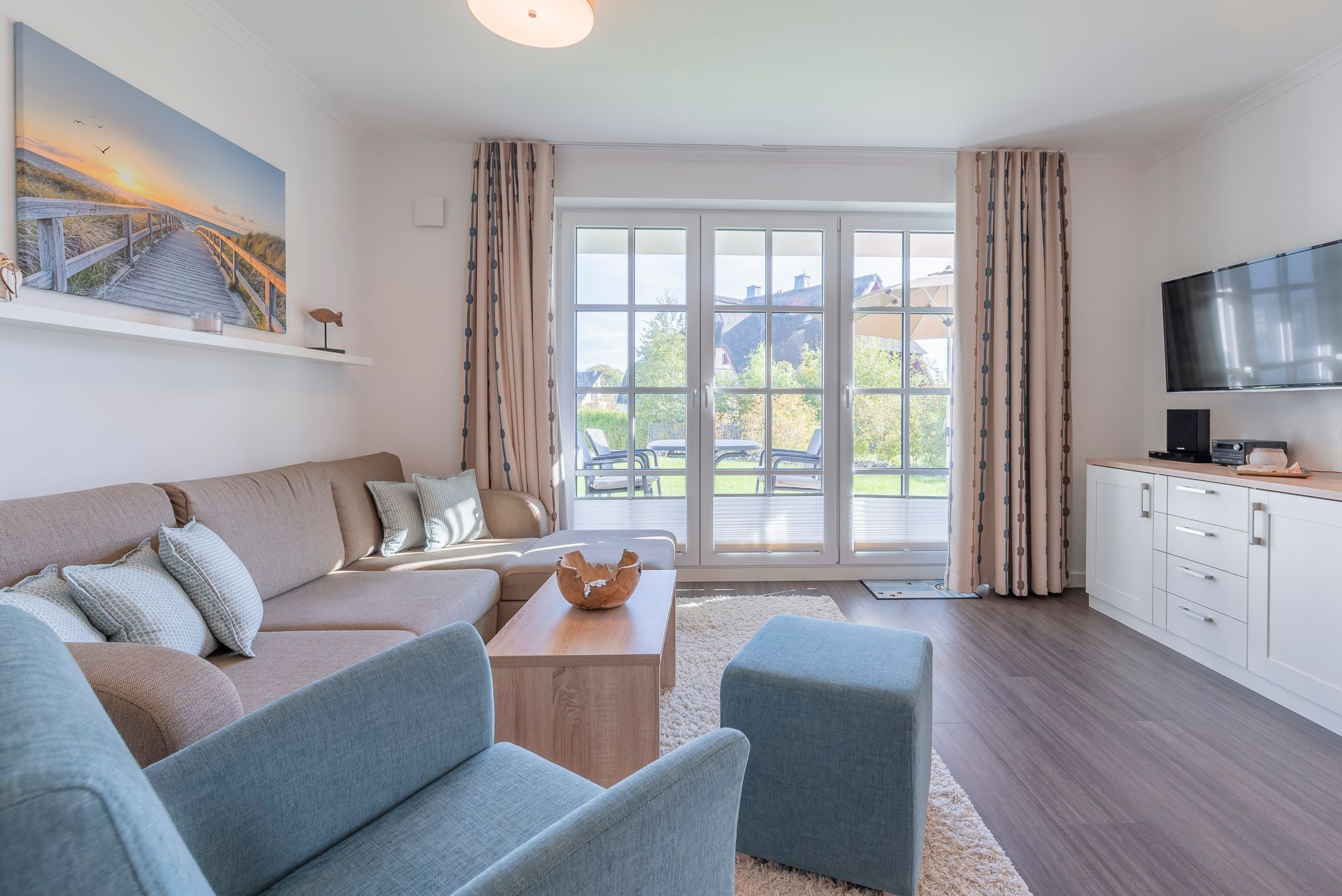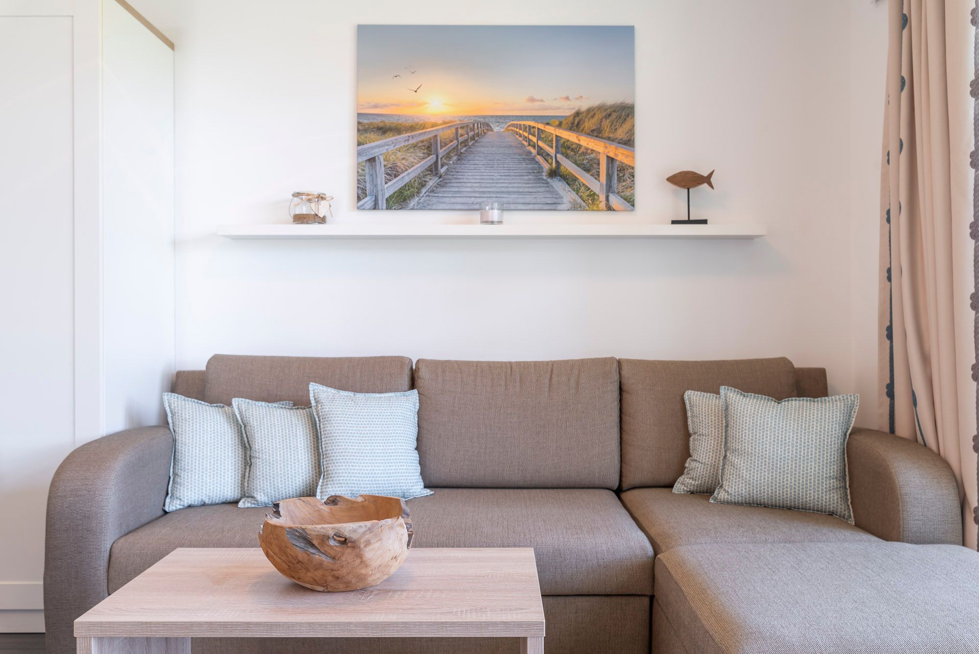 Die moderne Küche bietet jeden Komfort. Sie ist mit hochwertigen Geräten ausgestattet, dazu gehören Backofen, Ceran-Kochfeld, Kaffeemaschine, Toaster, Wasserkocher und Kühlschrank inklusive Gefrierfach. Der helle Essbereich eignet sich perfekt zum gemütlichen Beisammensein in kleiner Runde. Die zwei Schlafzimmer sind mit bequemen Boxspringbetten und ausreichend Stauraum für Ihre Mitbringsel ausgestattet. Im modernen Wohnzimmer bietet die Couch neben gemütlichen Abenden vor dem Fernseher einen zusätzlichen Schlafplatz für die fünfte Person. Das Bad verfügt über eine ebenerdige Dusche, einen Waschtisch mit großem Spiegel und ein zusätzliches Sideboard. Vom Wohnbereich gelangen Sie auf die schön angelegte Terrasse (Ostseite) mit Blick ins Grüne. So lässt es sich früh morgens mit der Sonne am Frühstückstisch starten. Die Grünanlage auf der Südseite mit schönem Blick auf modern gedeckten Reetdachhäuser und den zugehörigen Sonnenliegen ruft anschließend zum Sonnenbaden.