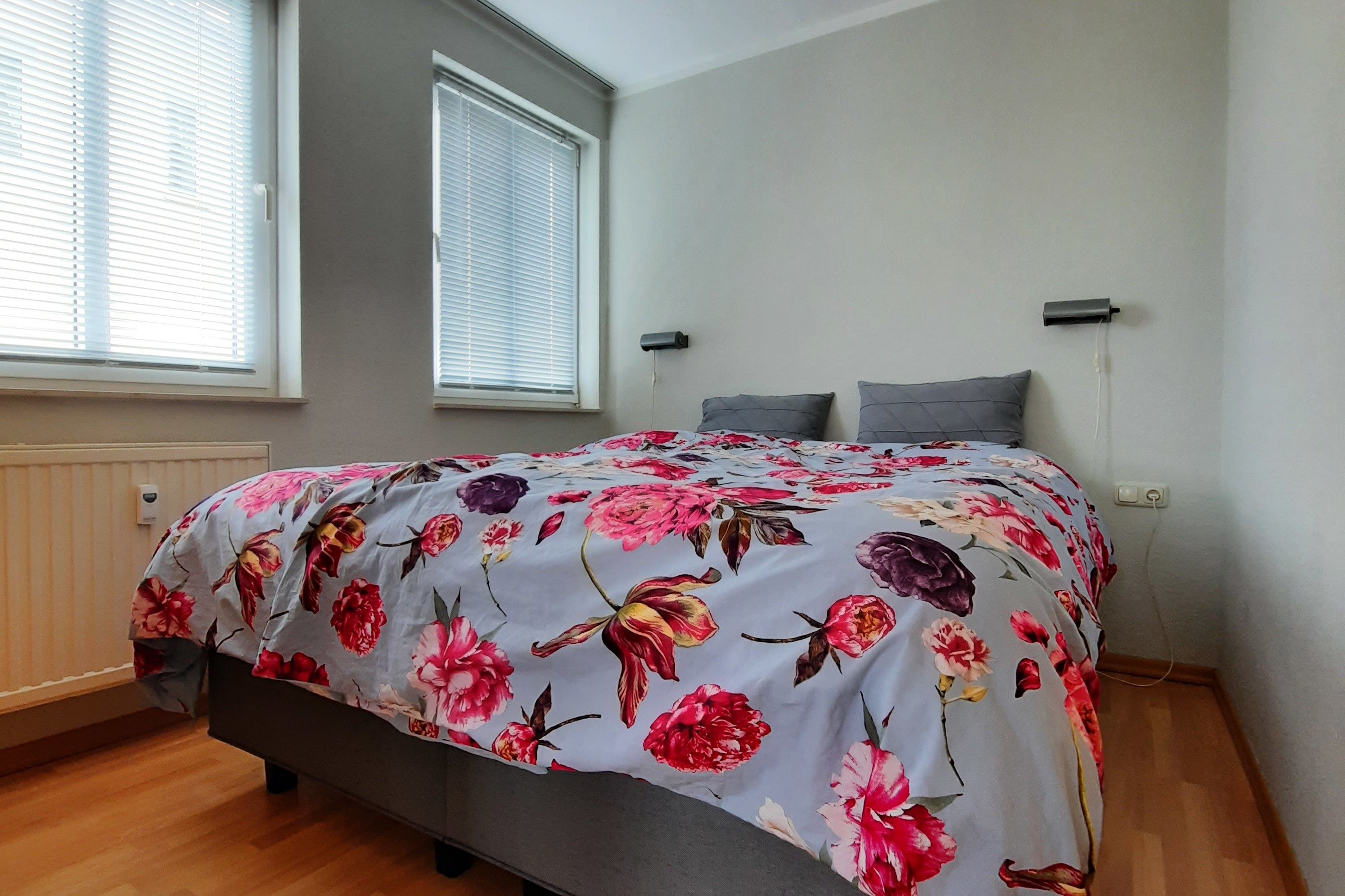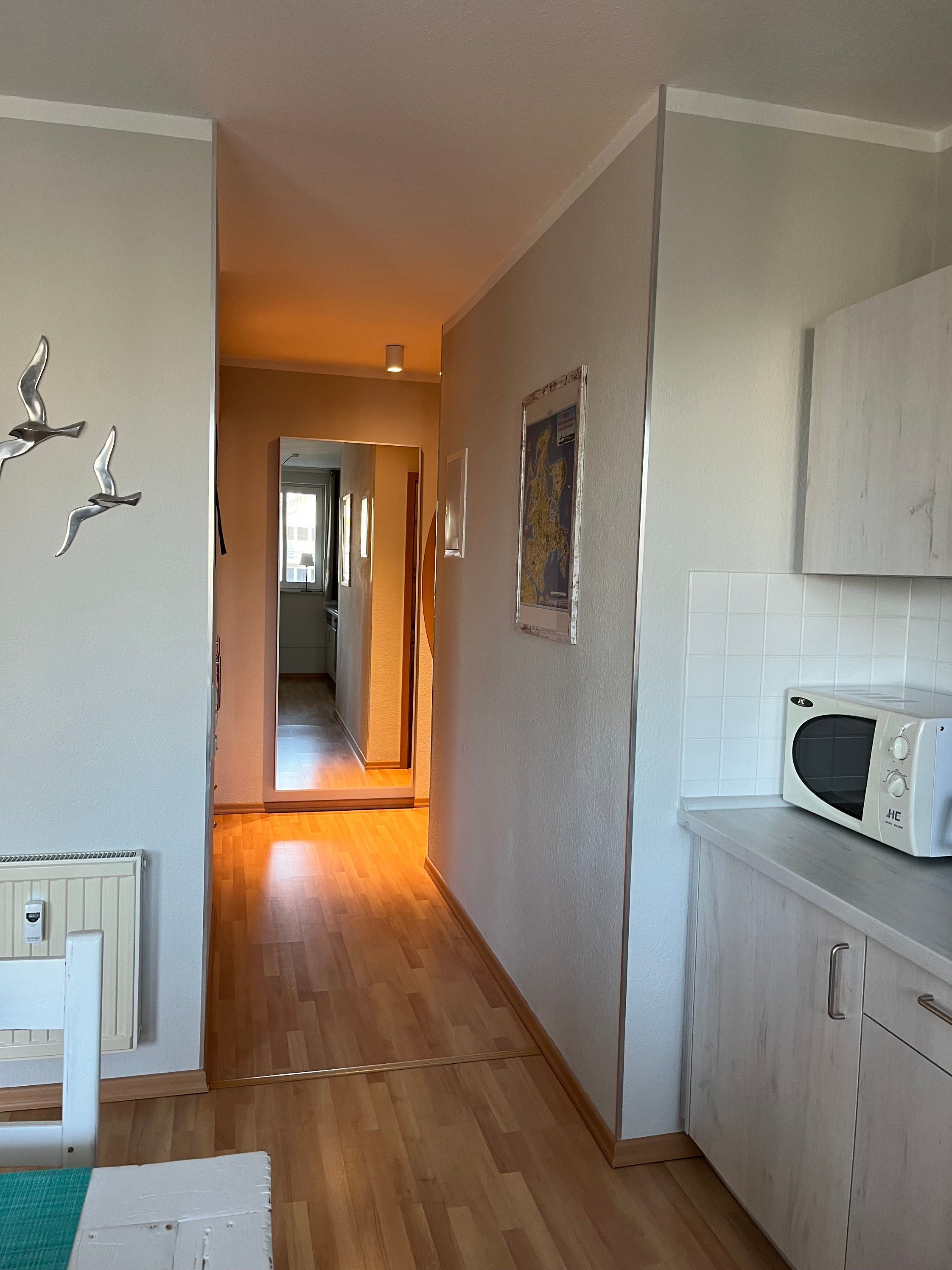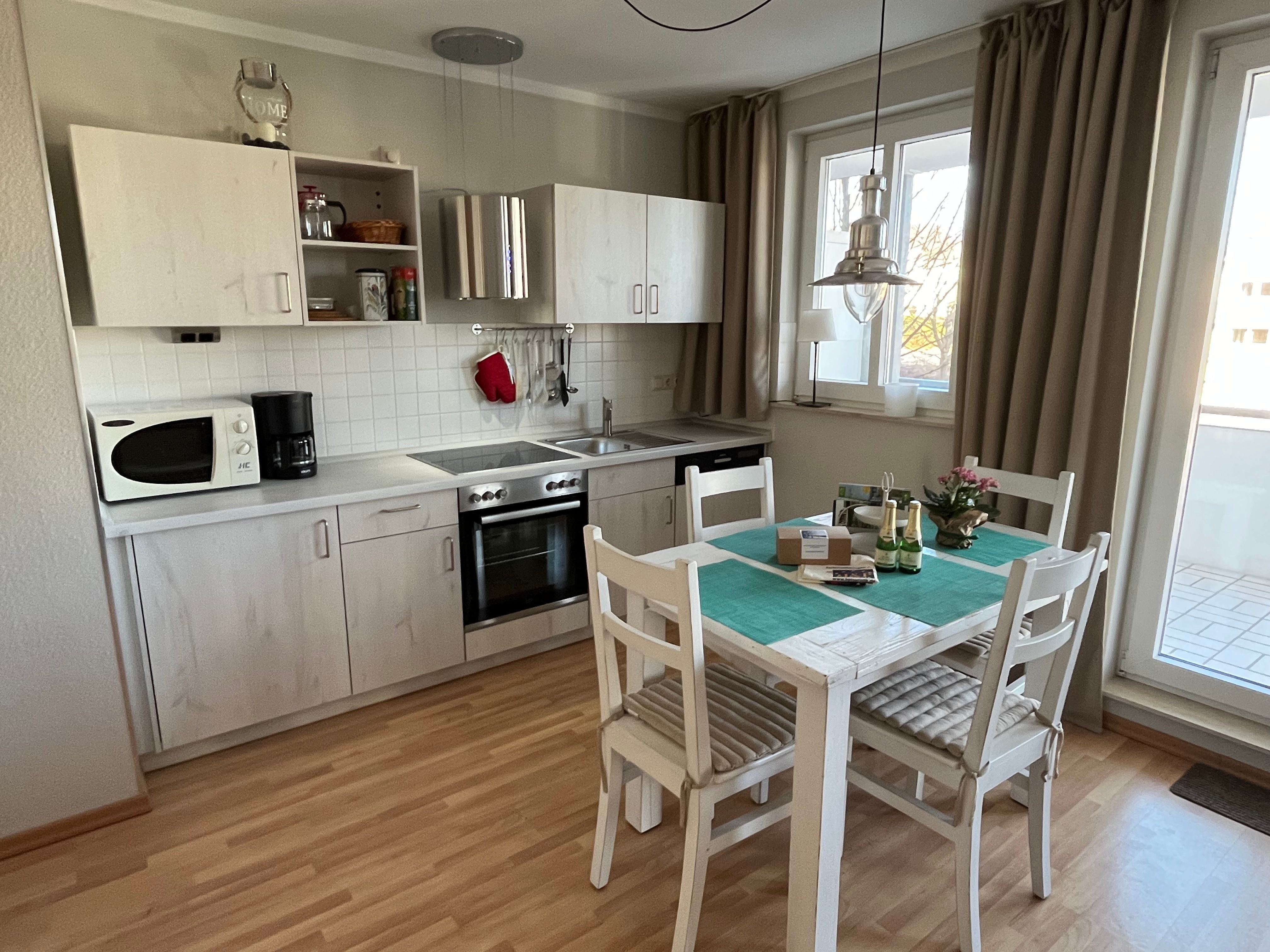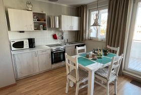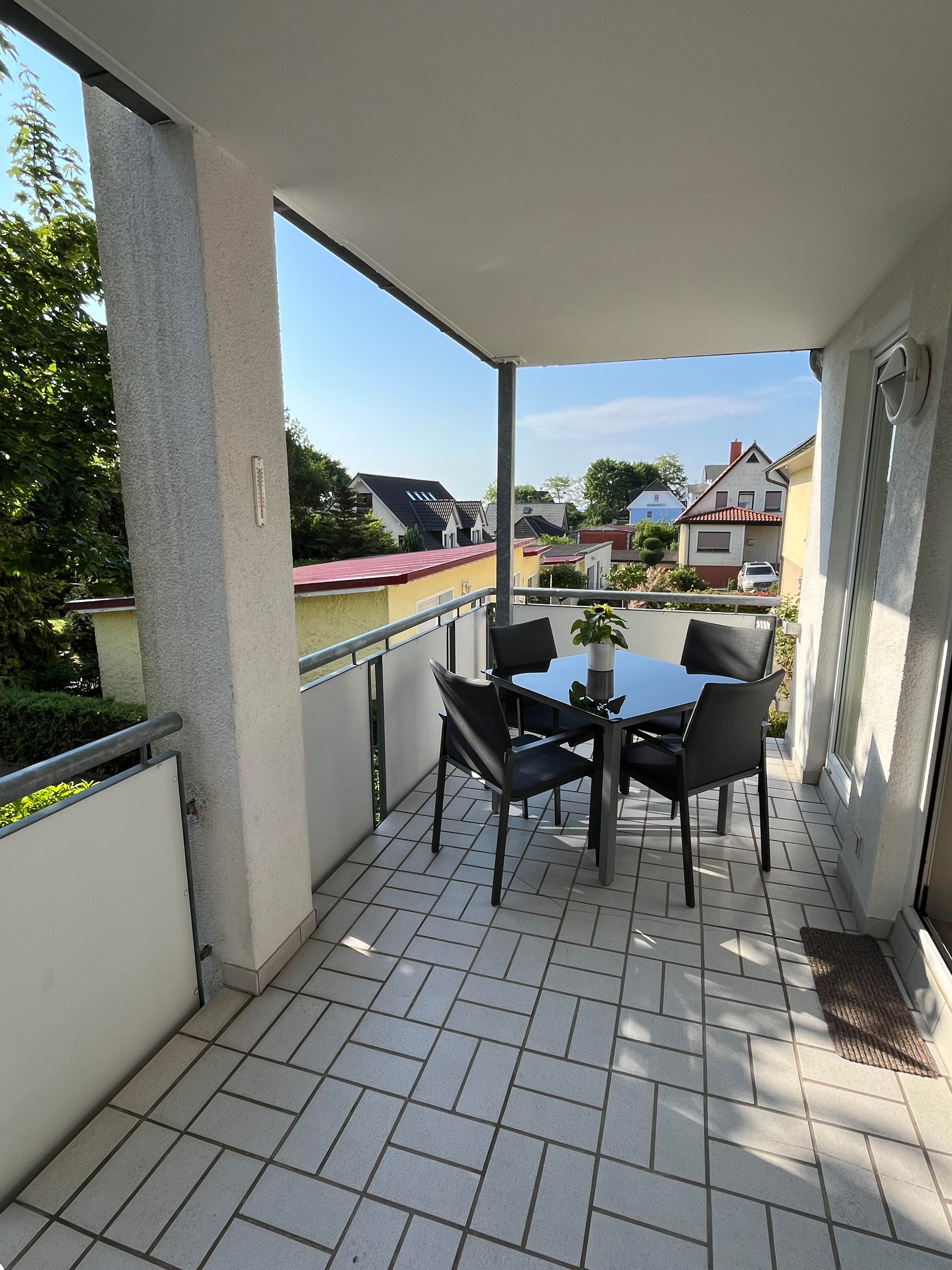 Die Wohnung ist ebenerdig zu erreichen, befindet sich wegen der Hanglageaber in der 1.Etage. Der Fußboden der gesamten Wohnung ist mit Laminat ausgelegt, das Bad hell gefliest. Selbstverständlich sind Waschmaschine,Kabel-TV und WLAN vorhanden. Im Schlafzimmer steht ein Boxspringbett von der Firma Vispring, im Wohnbereich eine hochwertige, ausziehbare Doppelbettcouch. In der Küche finden Sie neben der guten Ausstattung ein Mikrowellengerät, einen Kühlschrank mit Gefrierfach und einen Geschirrspüler. Die bequemen Möbel auf dem großen Balkon laden zumEntspannen ein. Ein reservierter, kostenloser Autostellplatz befindet sich direkt am Haus.