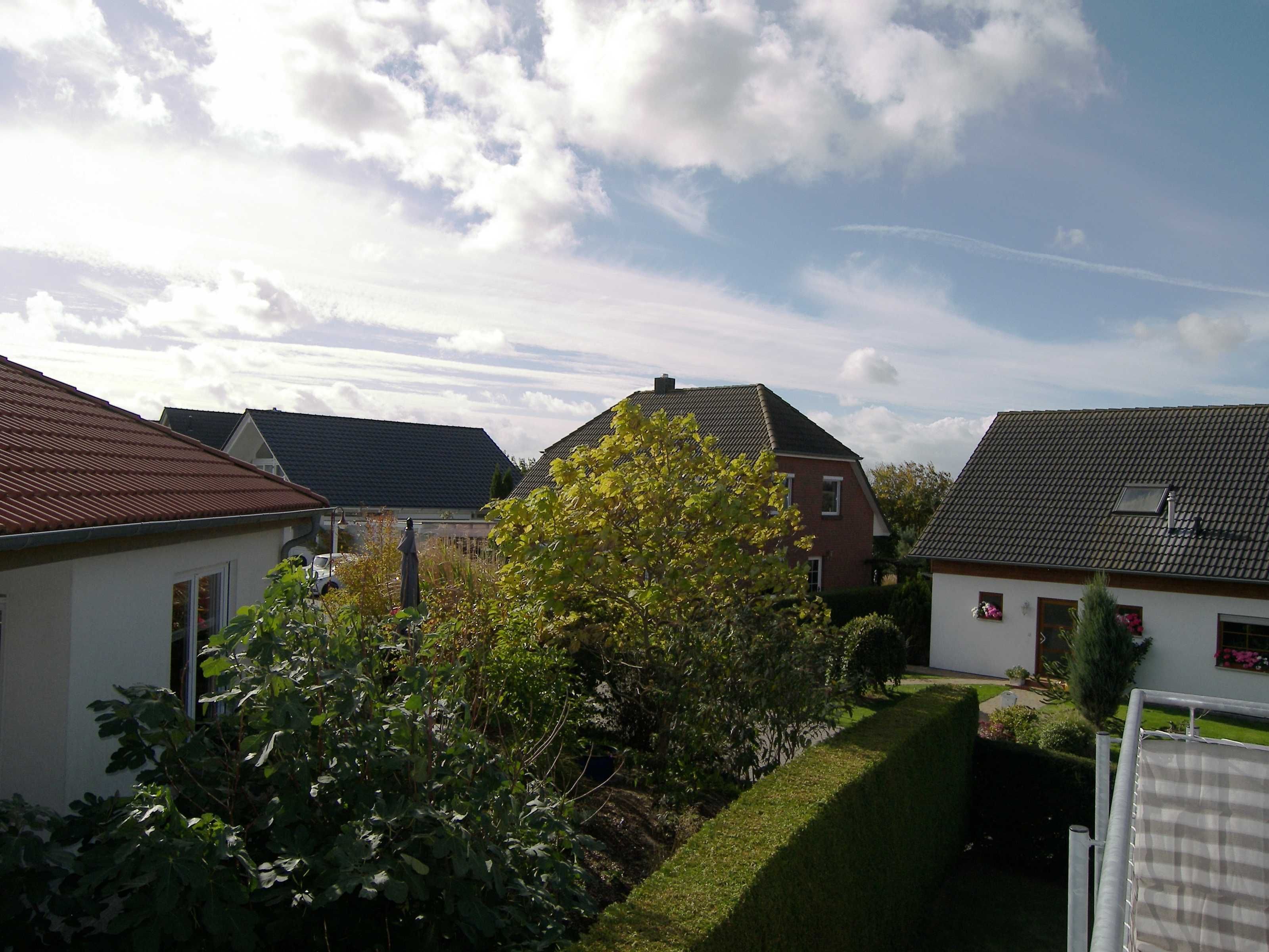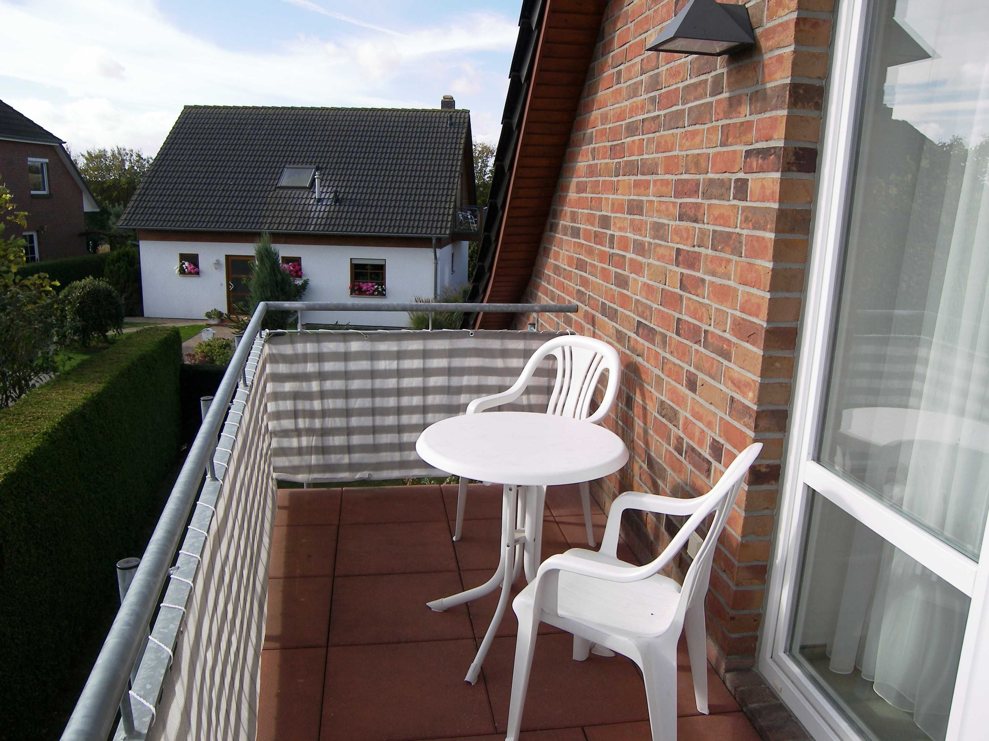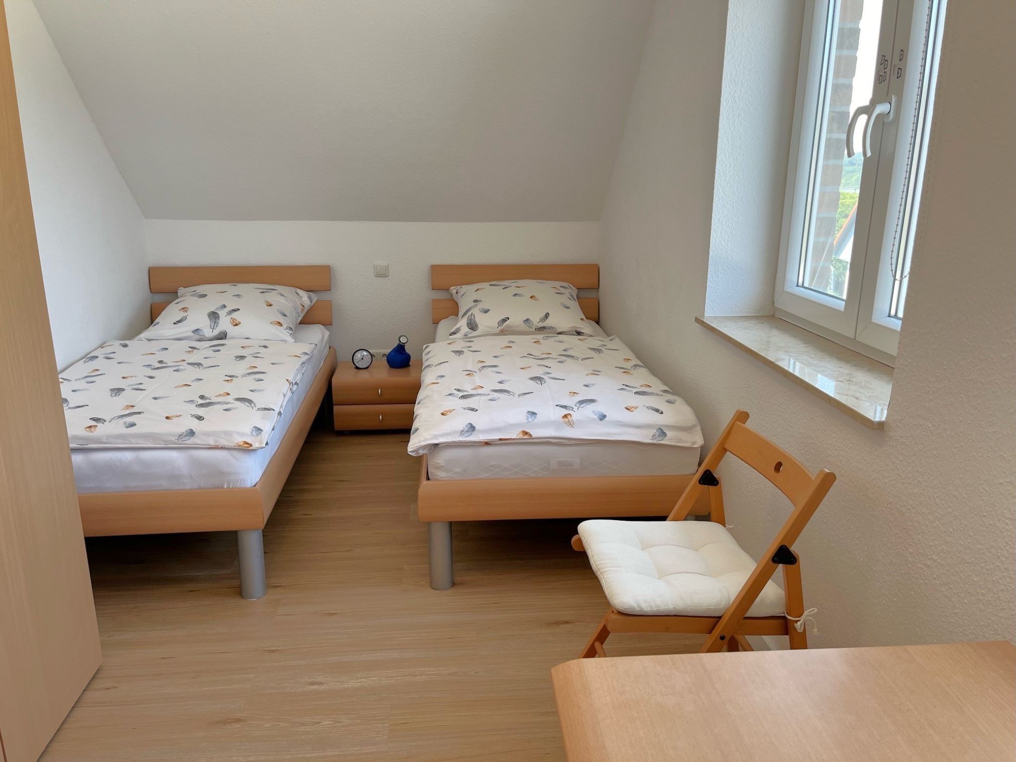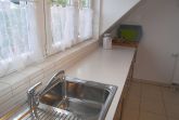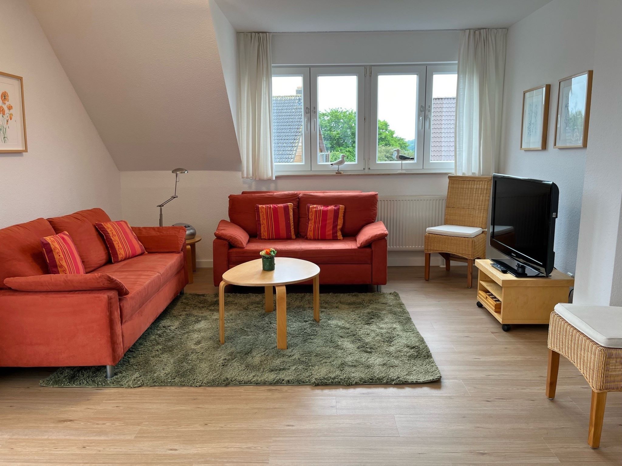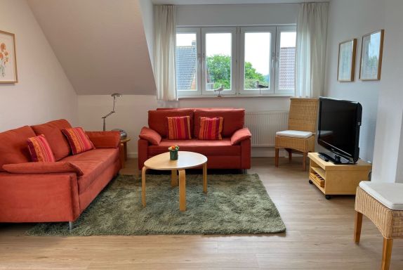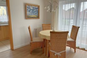 Die Wohnung befindet sich im 1. Obergeschoss/Dachgeschoss des Einfamilienhauses und hat teils Dachschrägen. Das Wohnzimmer ist ausgestattet mit einem Smart-TV, einer Sitzecke, Radio mit Kassetten-u. CD-Player, einem runden Holzesstisch mit weißer Lackplatte und 6 Rattan Stühlen.