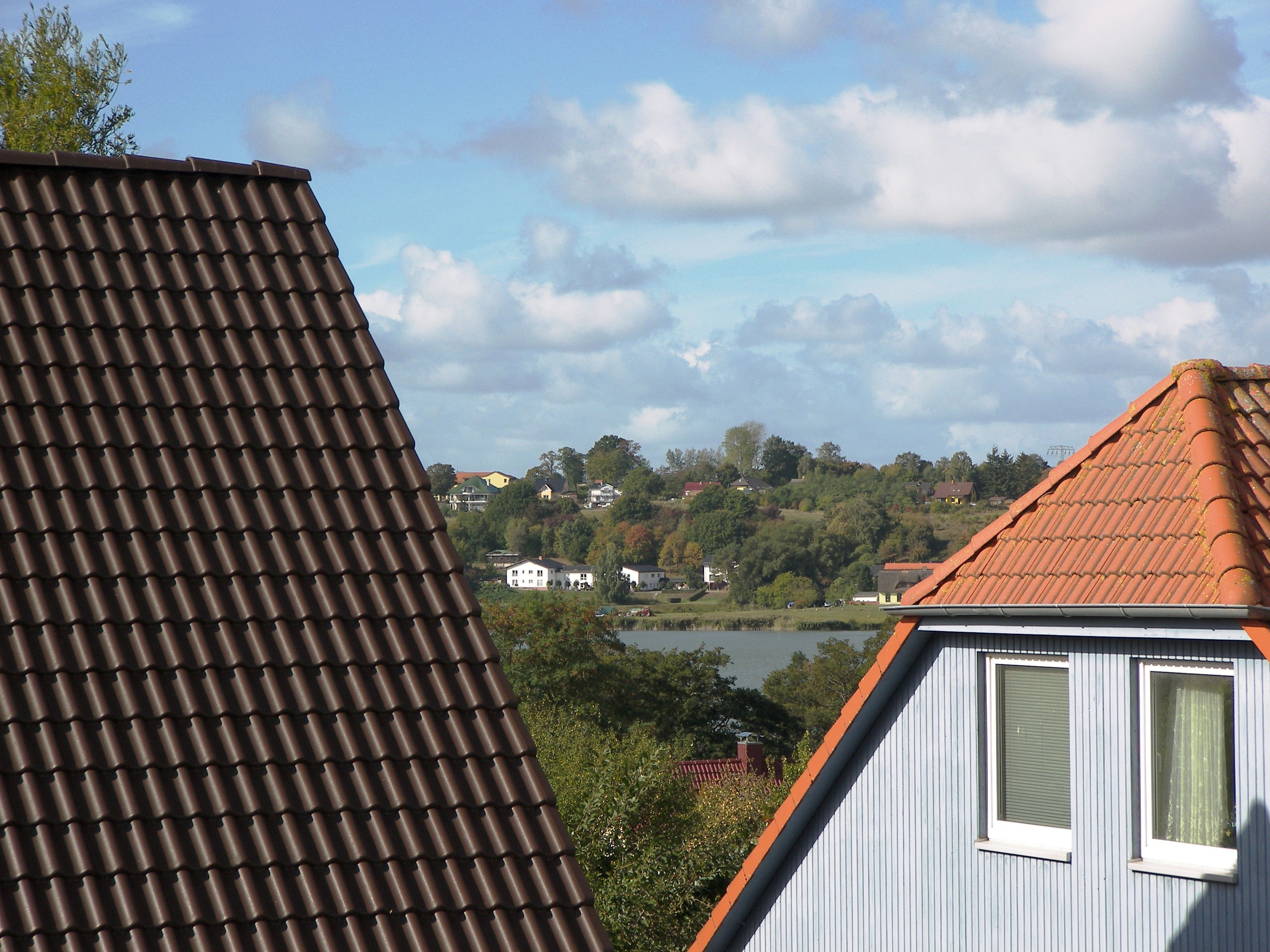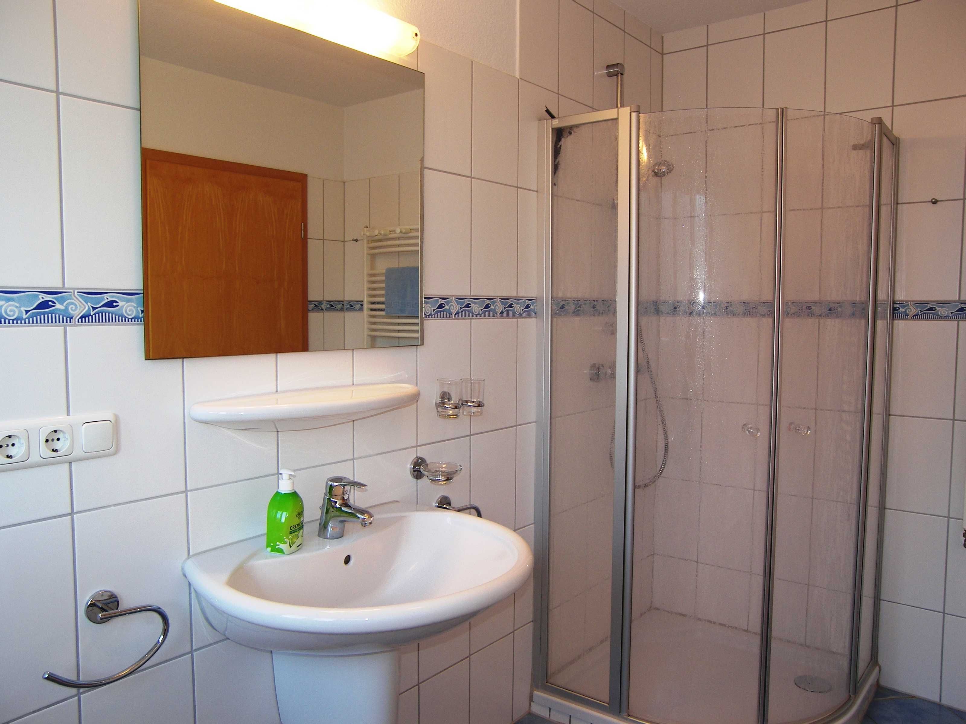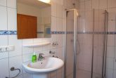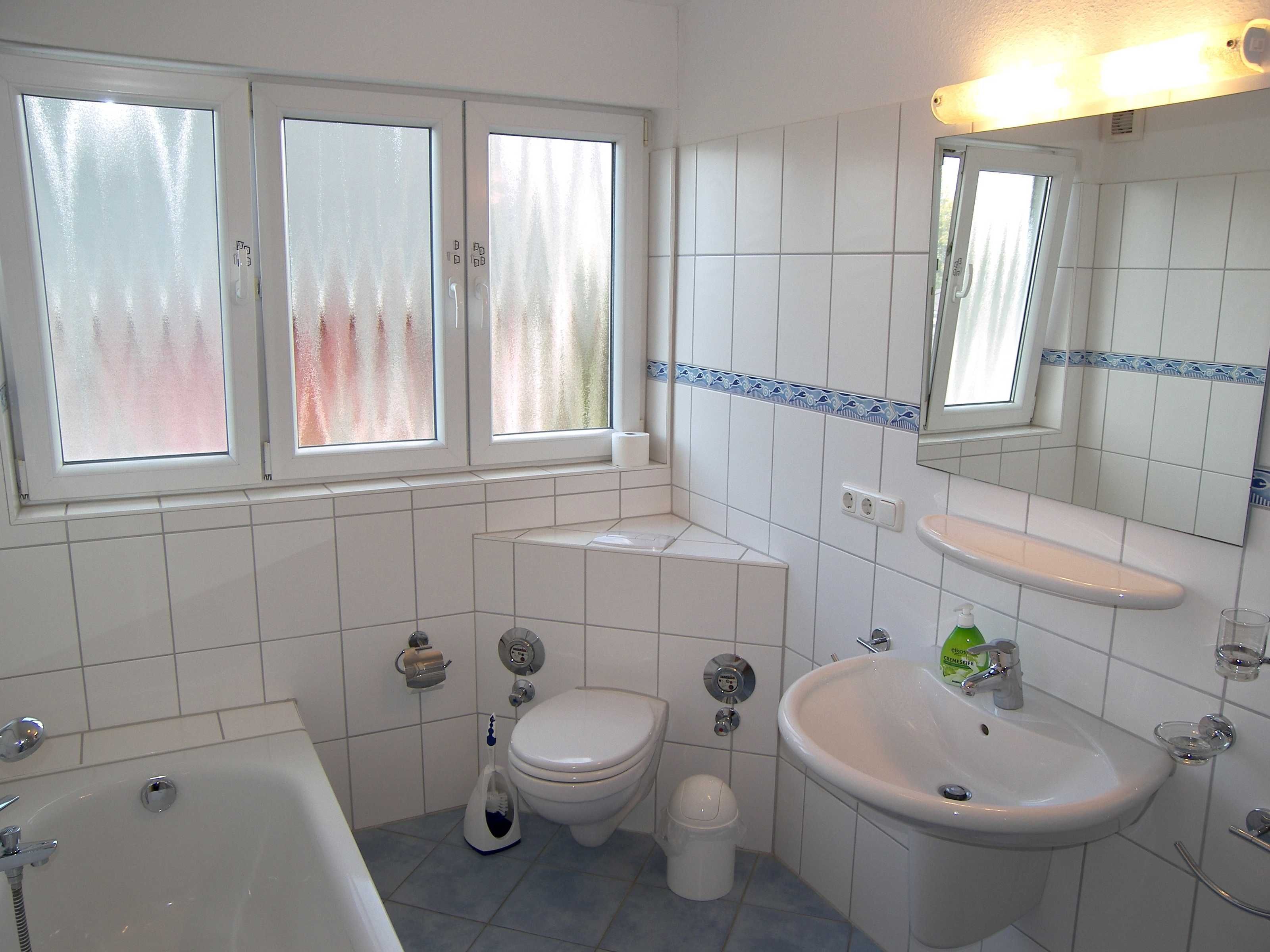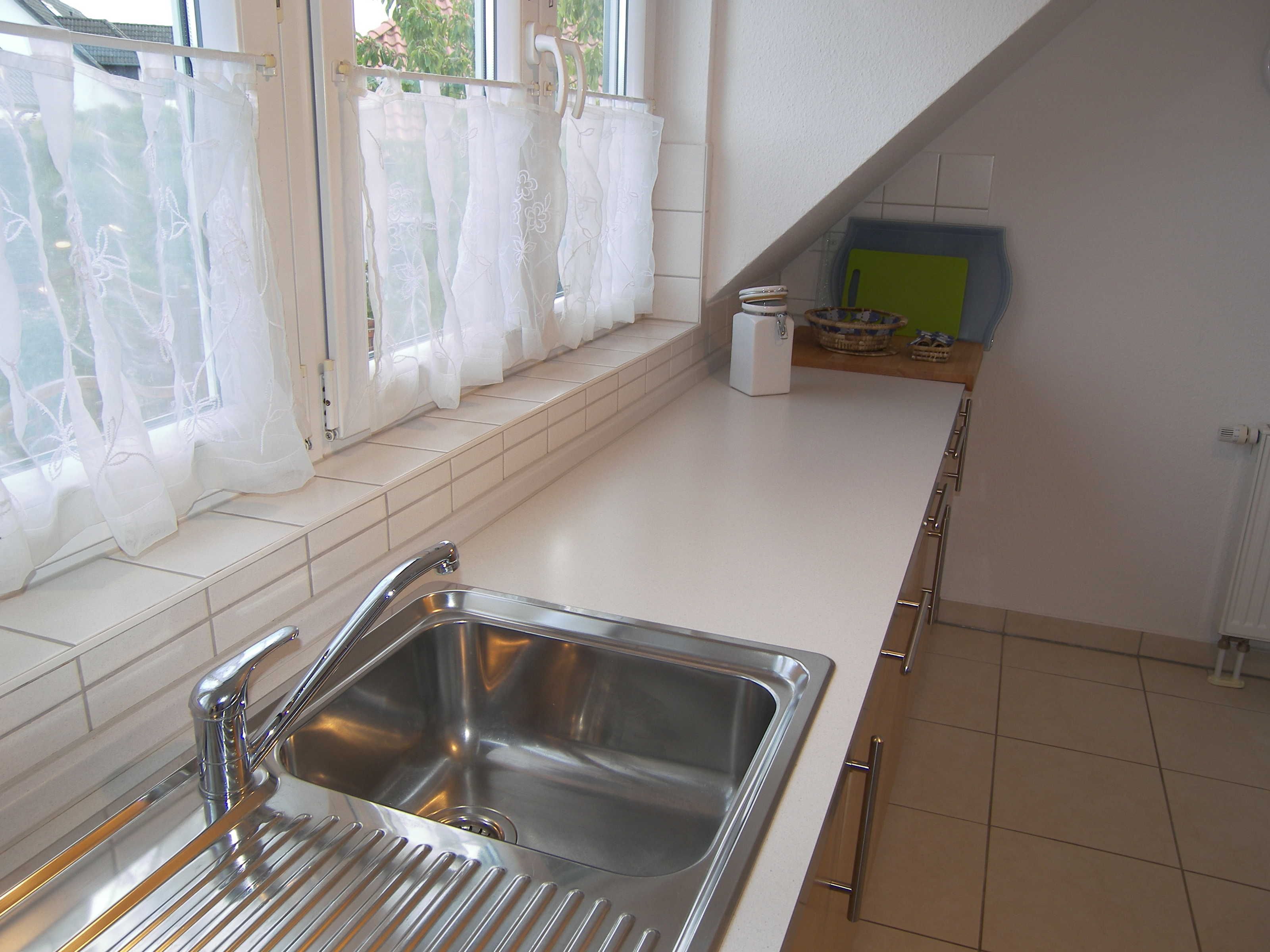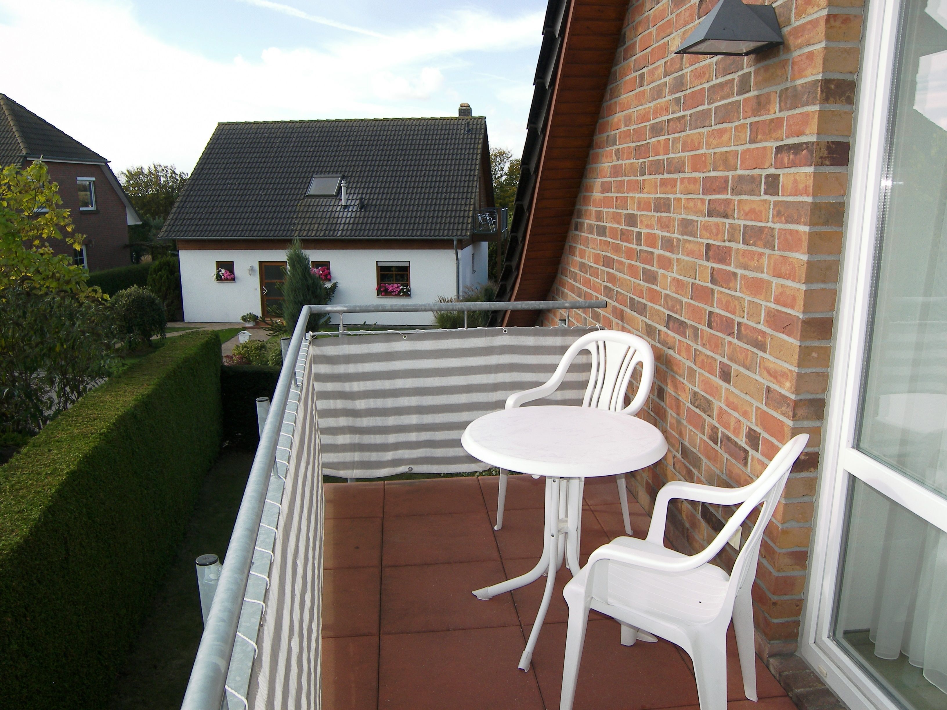 Die Wohnung befindet sich im 1. Obergeschoss/Dachgeschoss des Einfamilienhauses und hat teils Dachschrägen. Das Wohnzimmer ist ausgestattet mit einem Smart-TV, einer Sitzecke, Radio mit Kassetten-u. CD-Player, einem runden Holzesstisch mit weißer Lackplatte und 6 Rattan Stühlen.
