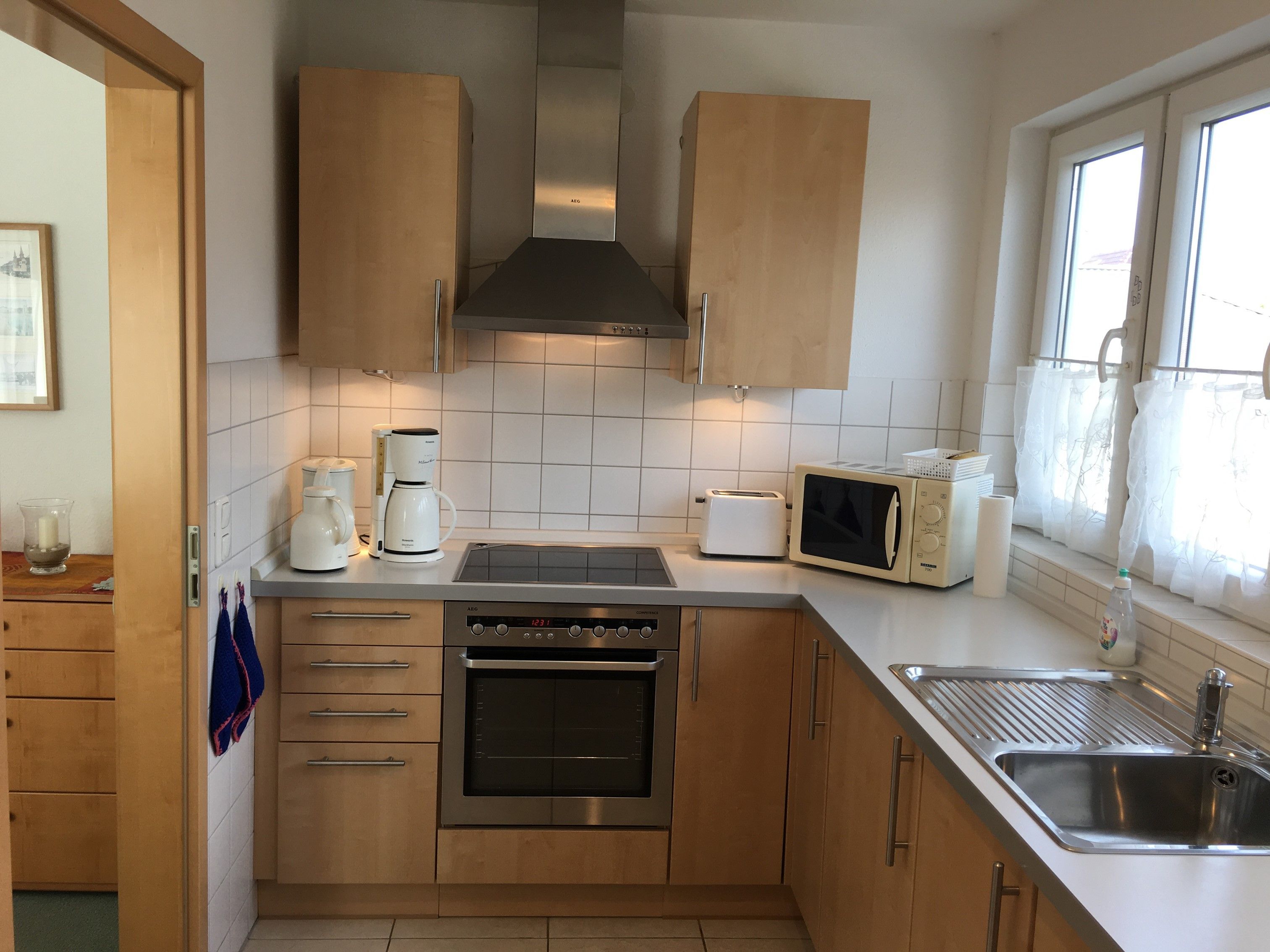 Vom Wohnzimmer aus gelangt man auf den möblierten Balkon, der zur Südostseite ausgerichtet ist. Die große separate Küche verfügt über einen 4 Platten Ceranherd, Backofen, Mikrowelle, Geschirrspüler, Toaster und Wasserkocher.