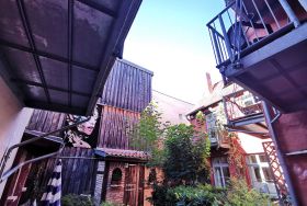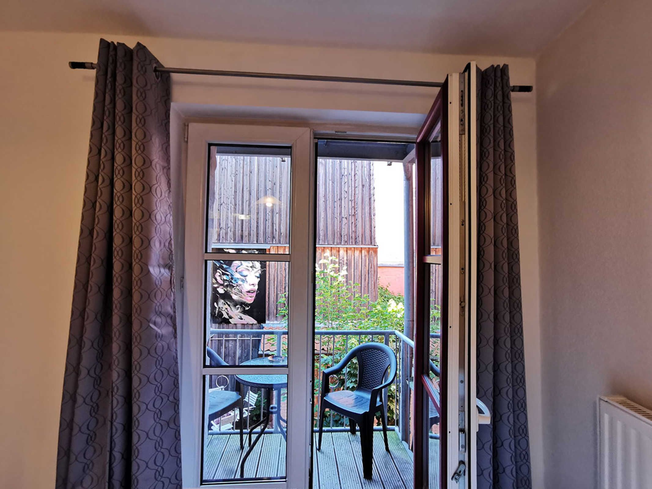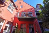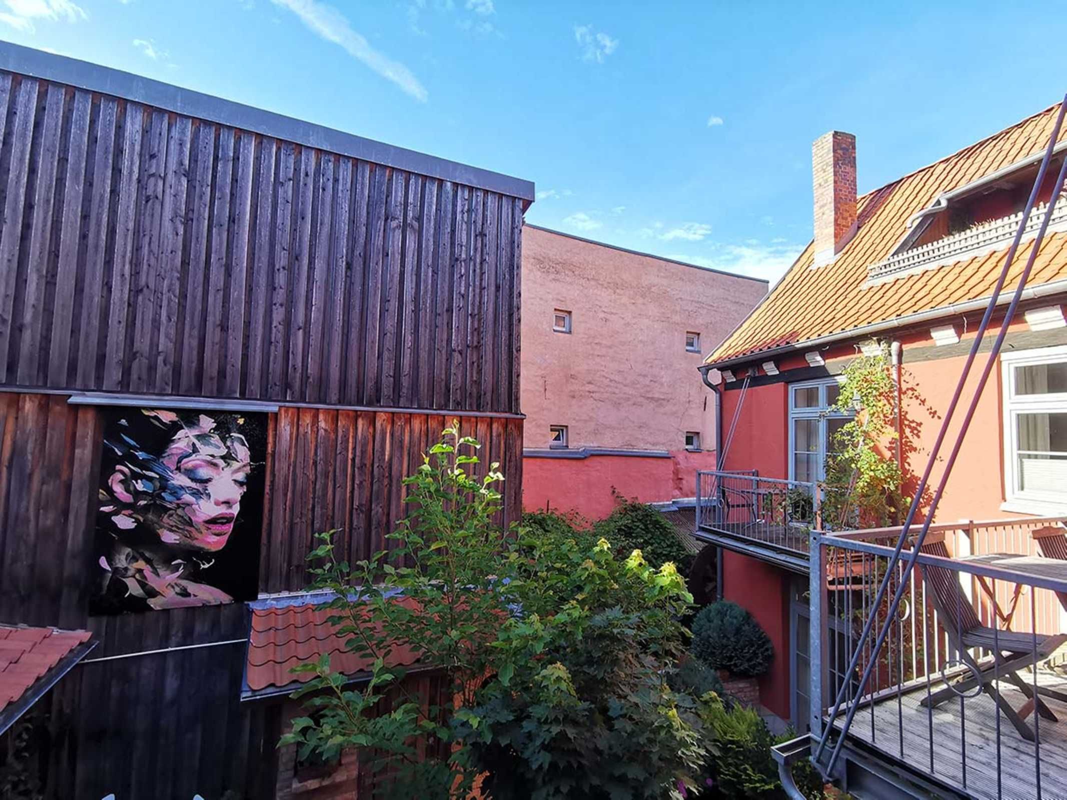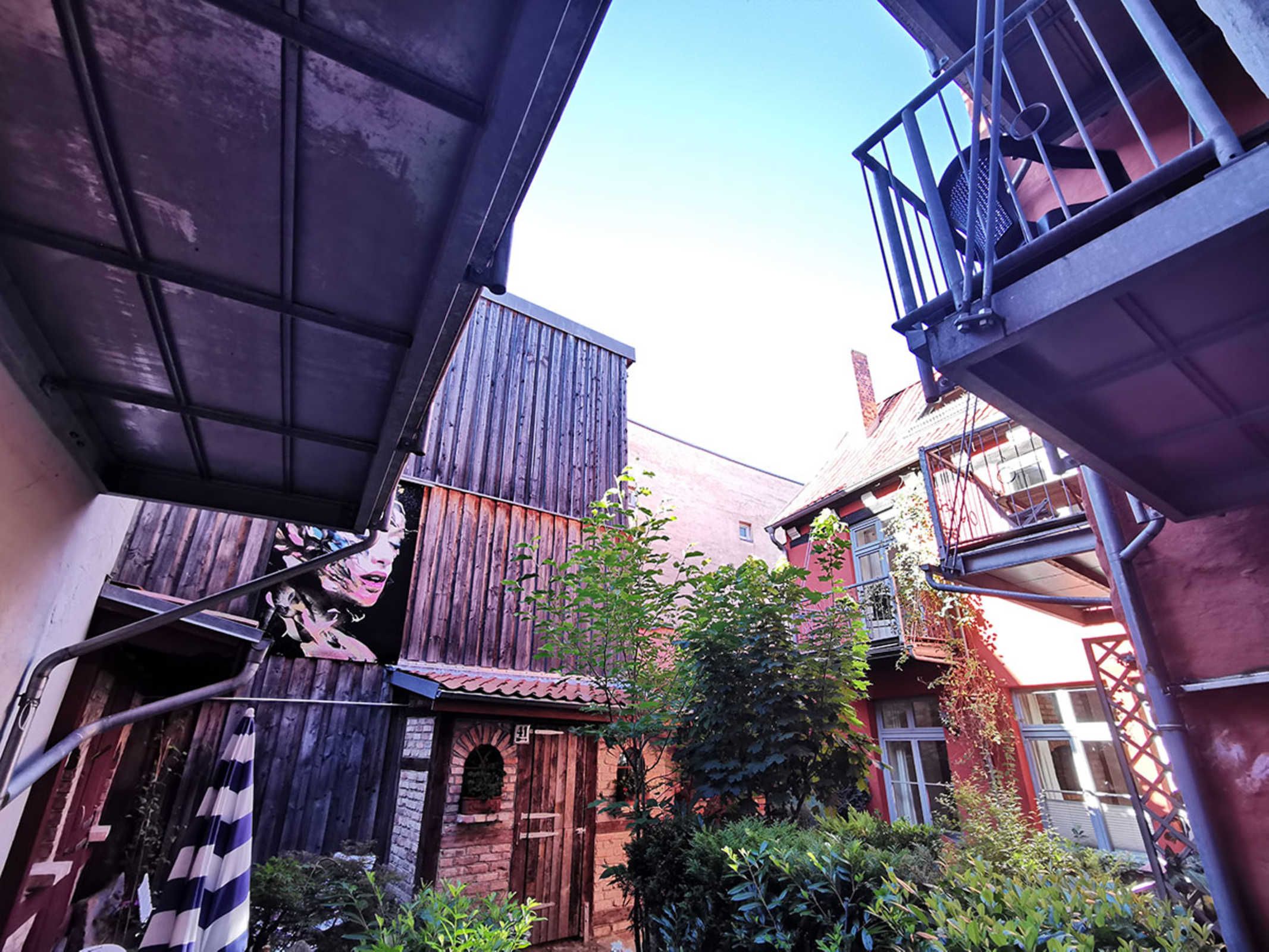 Unsere Ferienwohnung Achterdeck (ca 50 qm) ist ideal für 2 Personen, befindet sich in ruhiger Lage in der Frankenstraße 52 in Stralsund im 1. OG. Das Herzstück der Ferienwohnung ist die offene Küche und der Blick vom Balkon auf den historischen begrünten Innenhof.