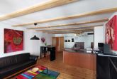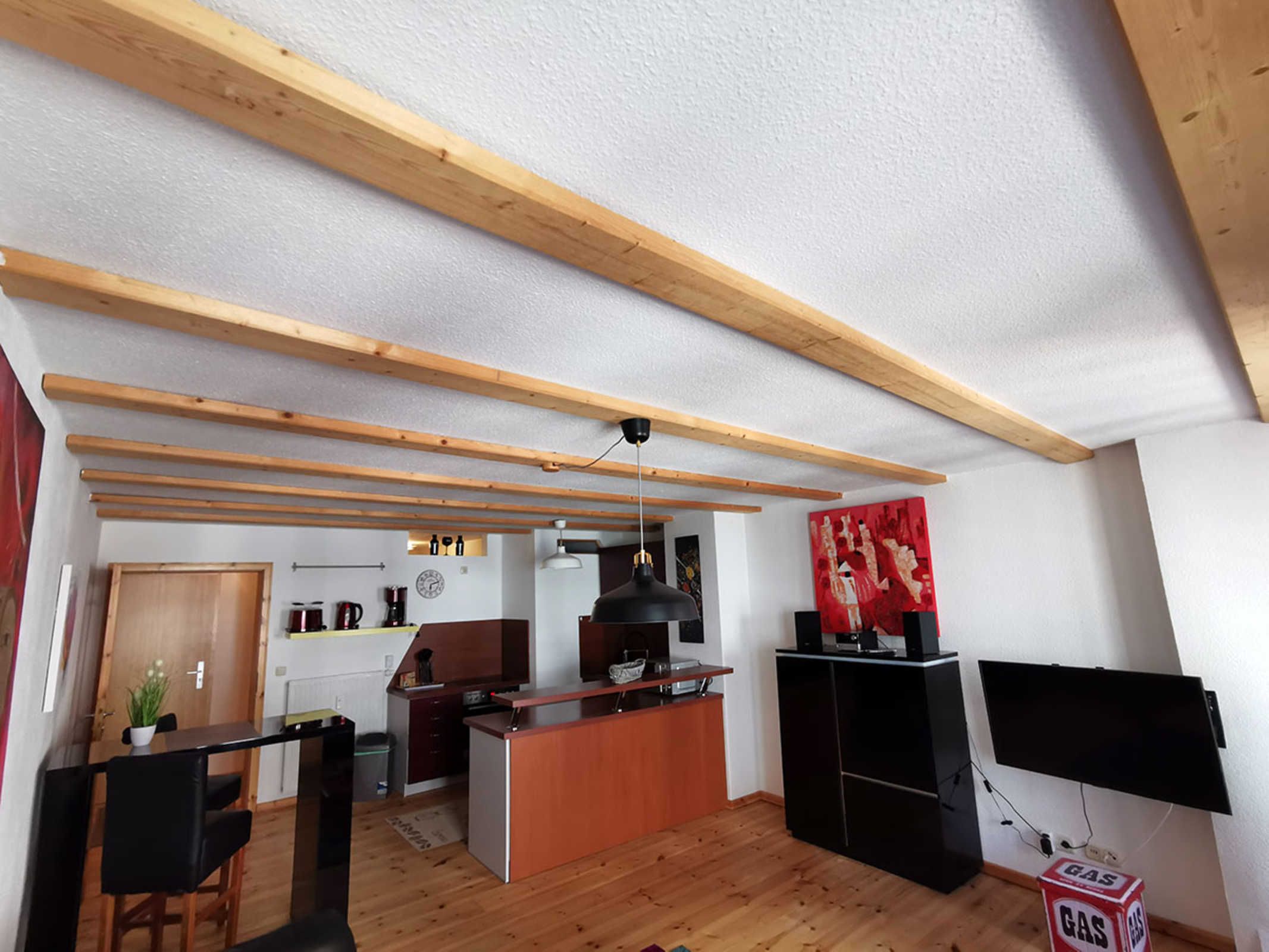 Wohnzimmer: großer Wohnraum mit offener Küche, Couch für 2 Personen, TV, erhöhte Sitzecke