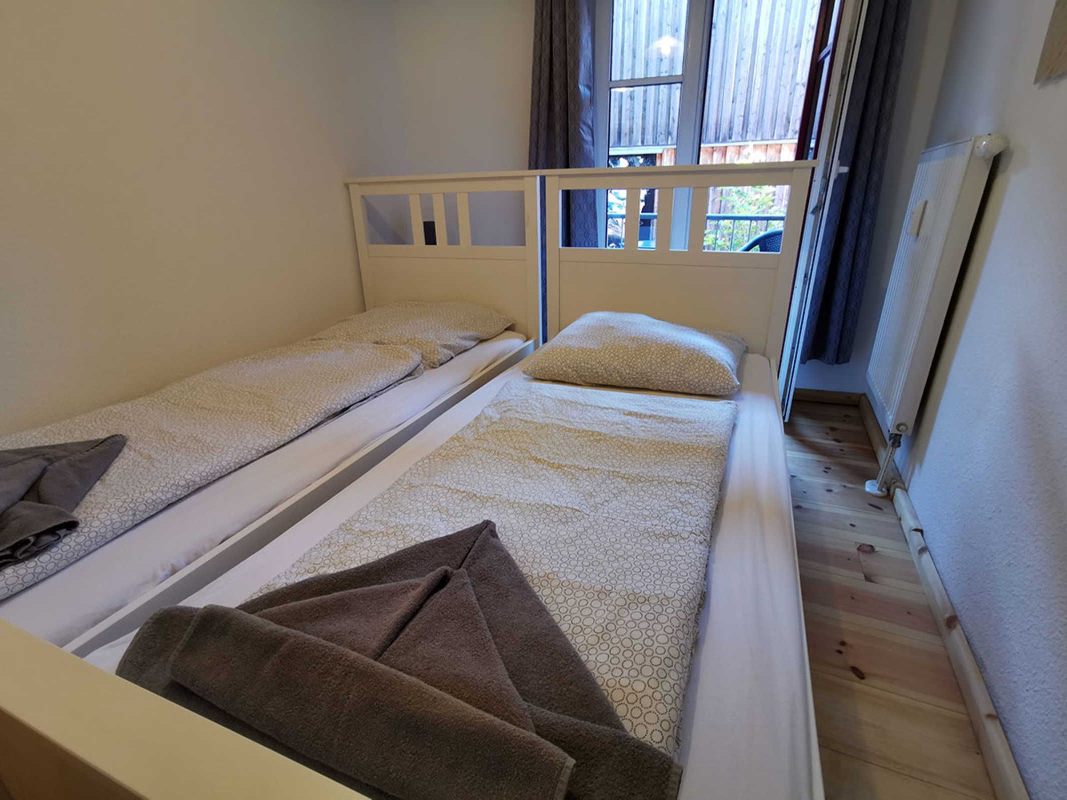 Schlafzimmer: 2 Einzelbetten, die man zusammenschieben kann, Balkon mit Blick auf begrünten historischen Innenhof, Schrank für 2 Personen