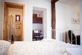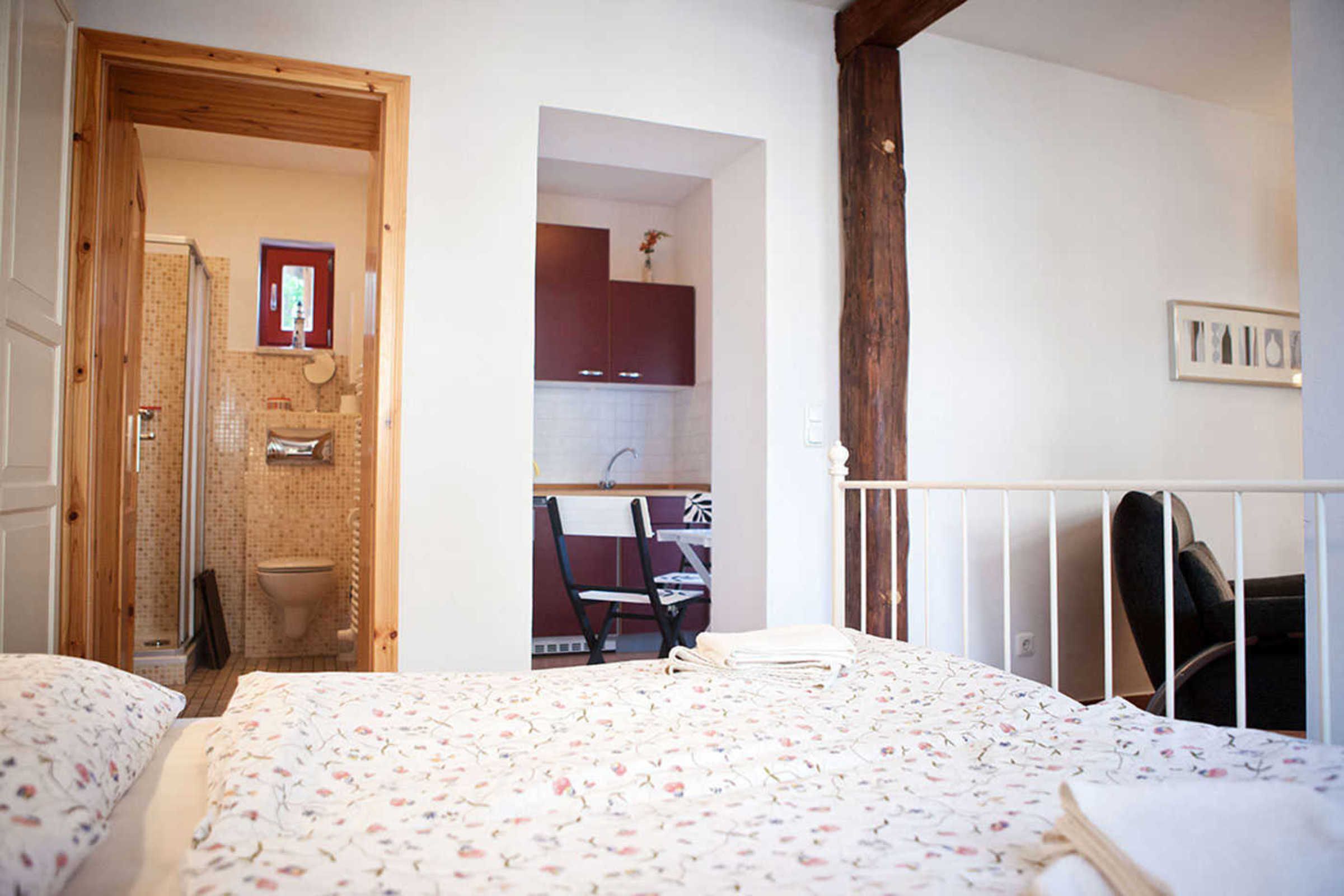 Sie verfügt über einen kombinierten Wohn-/ Schlafraum, mit kl. Couch und offener Küche.
