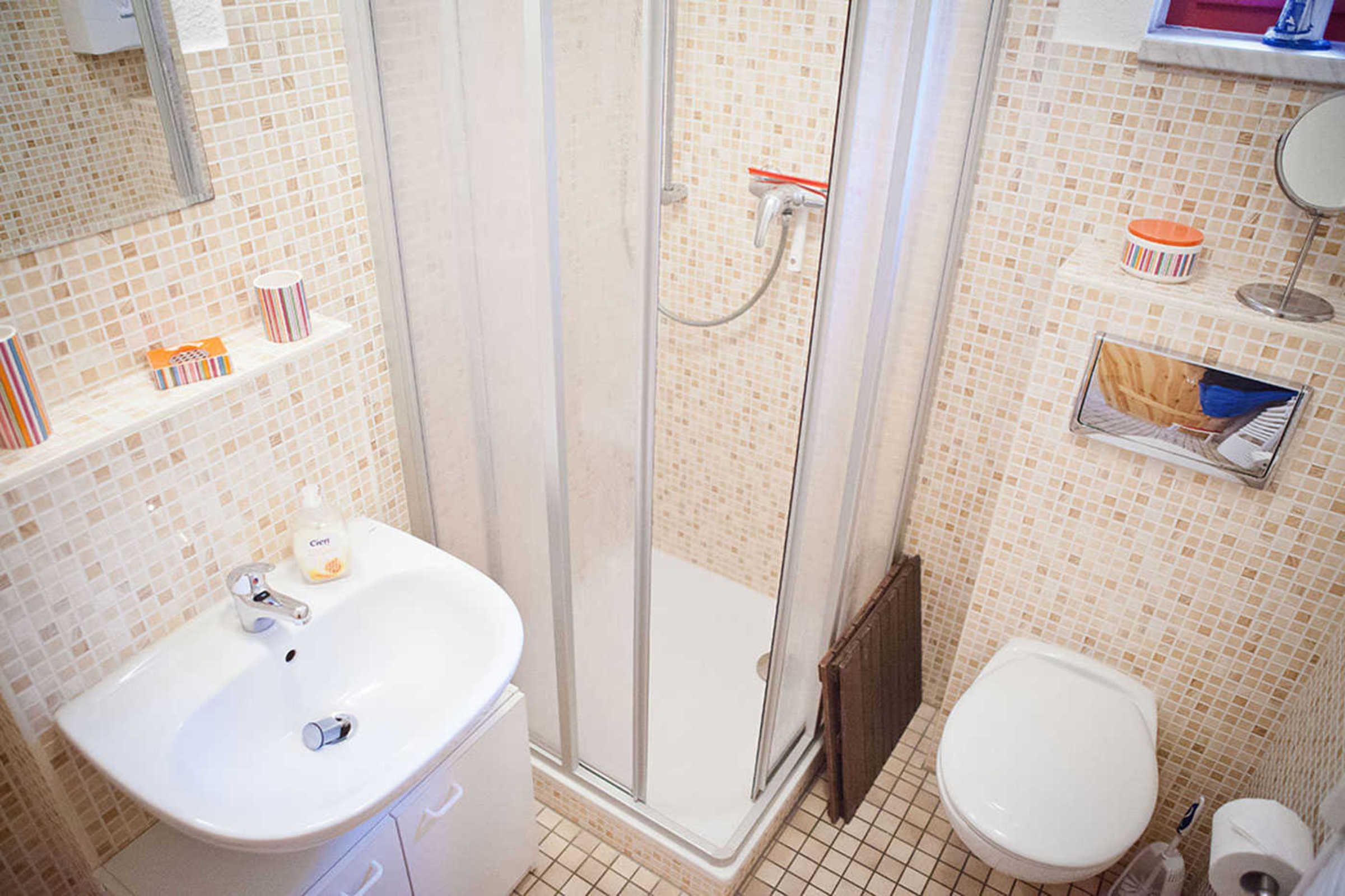 Das Bad ist gefliest, mit Dusche und Fenster.