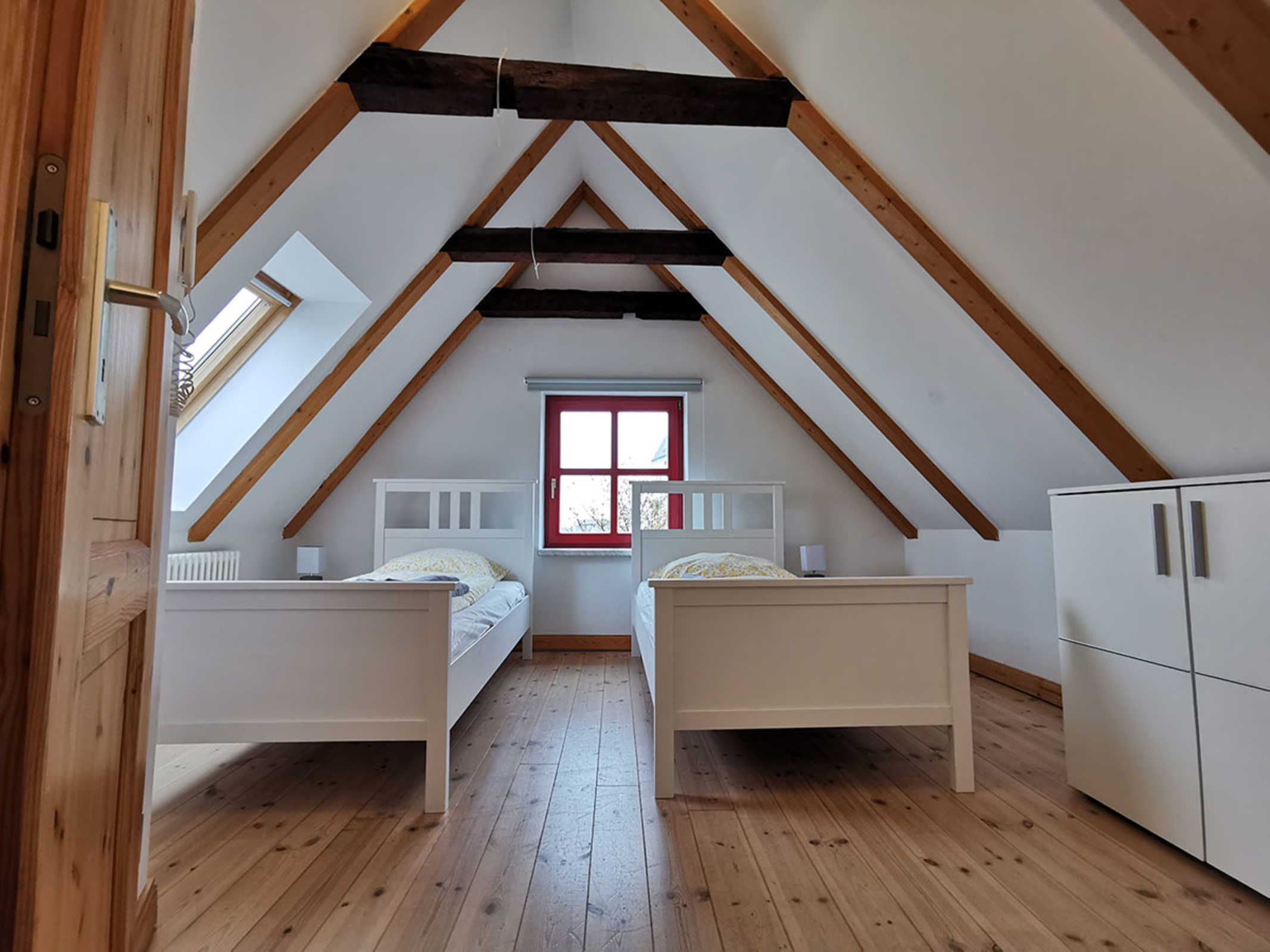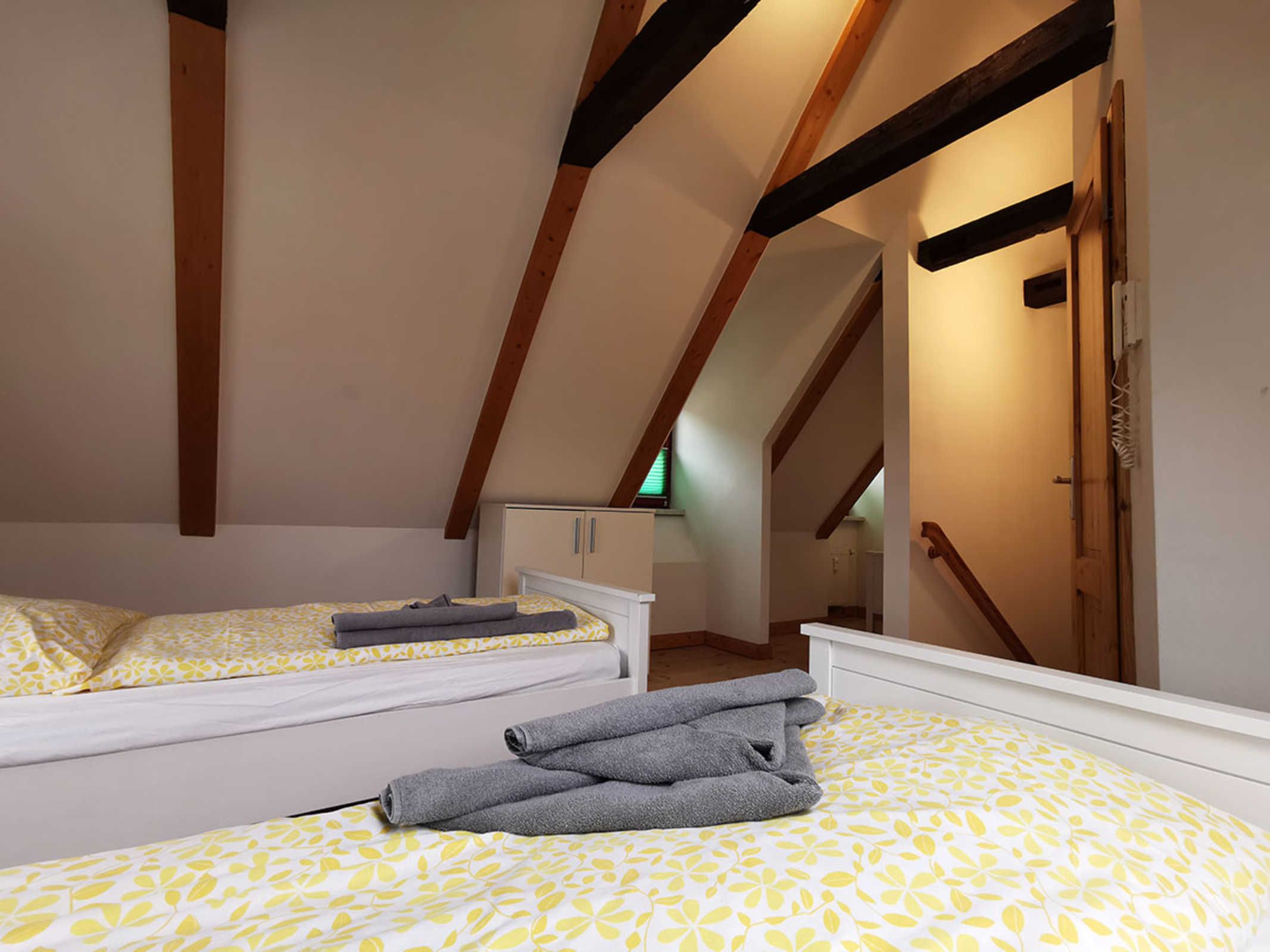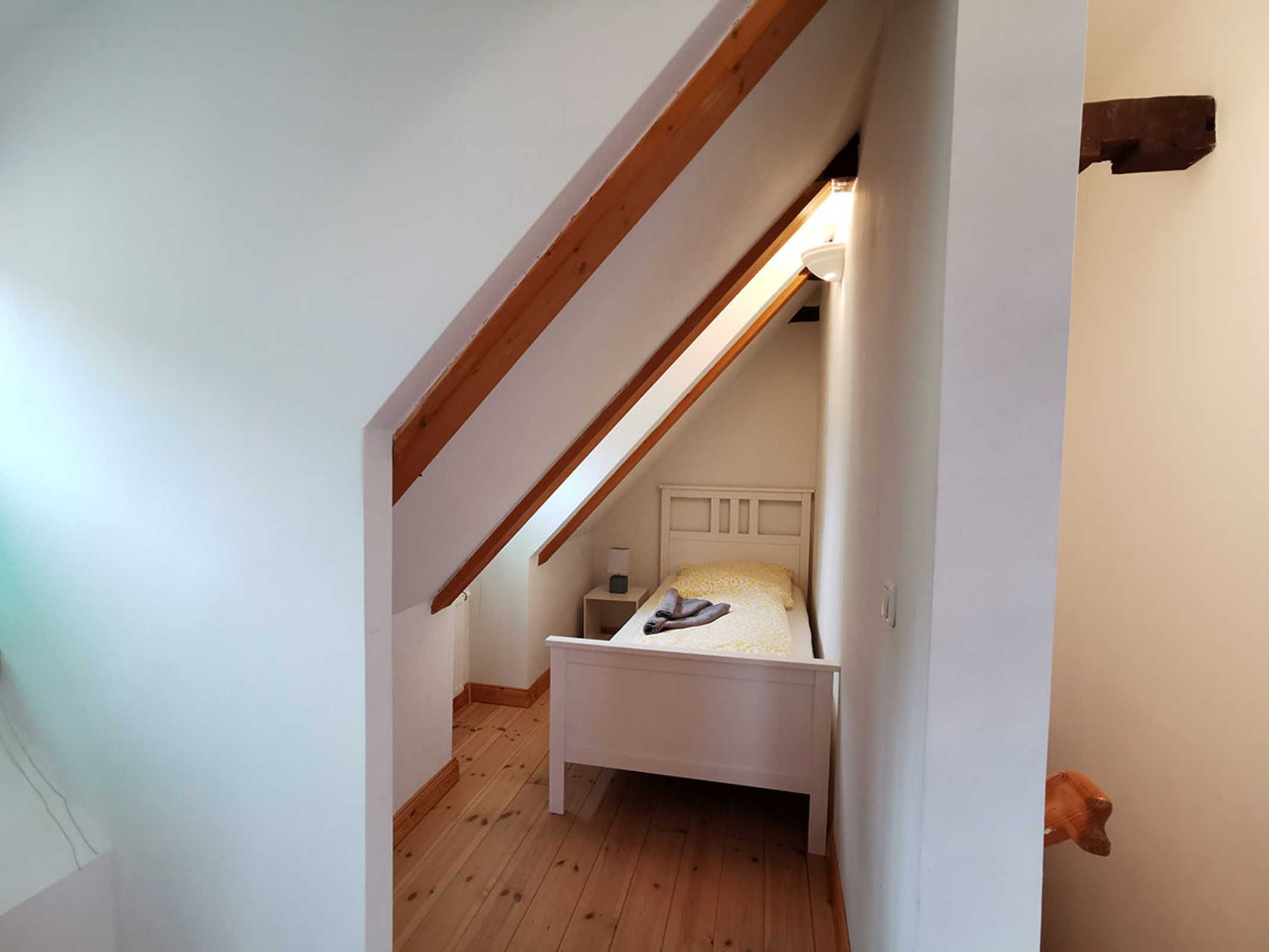 1 Schlafzimmer mit 2 Einzelbetten (können zusammen geschoben werden), 1 kleines Schlafzimmer (offen) mit 1 Bett, Bad mit Dusche
