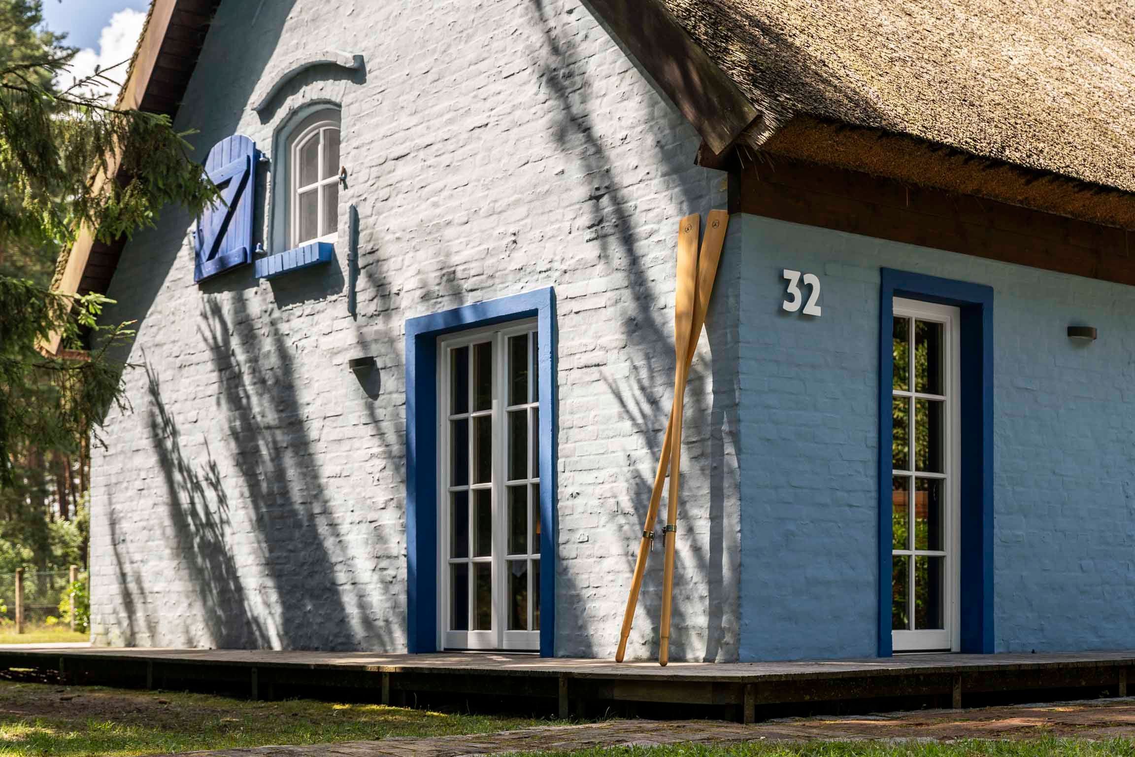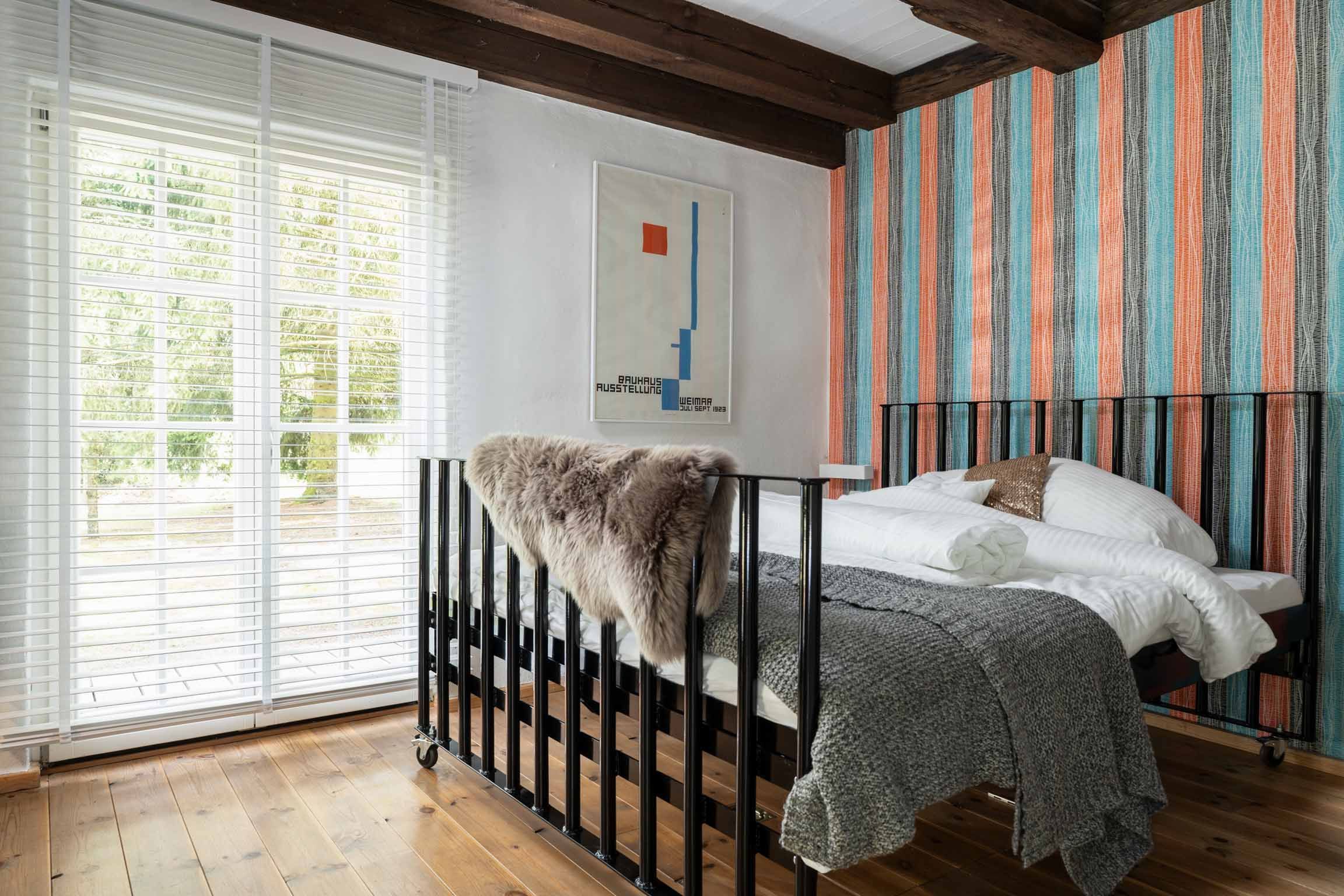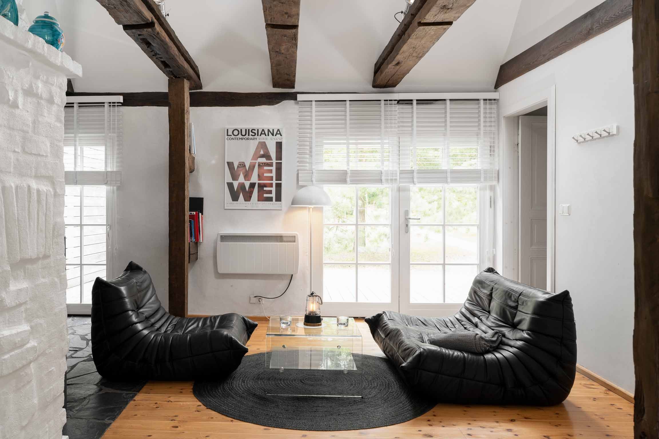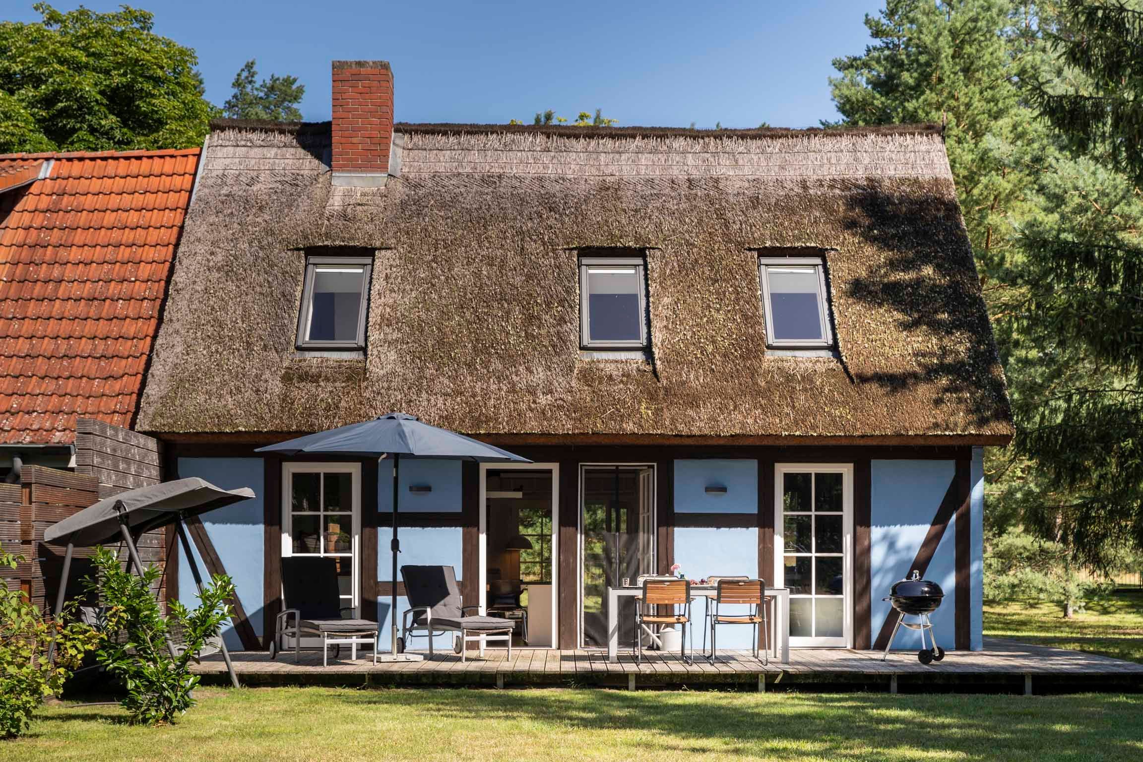 Das reetgedeckte Kolonistenhaus aus dem 18. Jahrhundert wurde 2013 aufwendig umgestaltet und modernisiert. Dabei lag der Fokus darauf, die markantesten historischen Elemente des Hauses zu erhalten und Ihnen moderne, zeitgenössische Ausstattungselemente gegenüberzustellen. In der Folge entstand durch das Freilegen der originalen Fachwerkbalken im Inneren ein großzügiger, luftiger und lichtdurchfluteter Wohnraum mit offener Galerie, in dessen Mitte der robust gemauerte Schornstein wie ein Monolith den Raum dominiert. Auf hellen Holzdielen sind nun mit vielen anderen liebevollen Details Möbelklassiker der früher 70er Jahre eingezogen, welche den modernen Stil des Hauses und gleichzeitig den Kontrast zu den historischen Stilelementen unterstreichen. Im vorderen Teil des Wohnraums empfängt Sie heute ein stylisches Sofa Set der Firma Ligne Roset mit Kamin und TV, im hinteren Bereich die offene, moderne Designerküche mit praktischer Kochinsel und langgezogenem Esstisch. Seitlich schließen sich eines der beiden Schlafzimmer mit gemütlichem Doppelbett und ein großzügiges Bad mit Wanne, Dusche und WC an. Sämtliche Fenster im Erdgeschoß sind bodentief und bilden Ausgänge auf die das Haus umgebende, weitläufige Holzterrasse. Die maßgeschneiderte Einbautreppe - geschickt hinter der Kücheneinbauwand versteckt - führt schließlich ins luftige Obergeschoss, welches hinter dem Bereich der offenen Galerie ein weiteres abgeschlossenes Schlafzimmer bietet.
