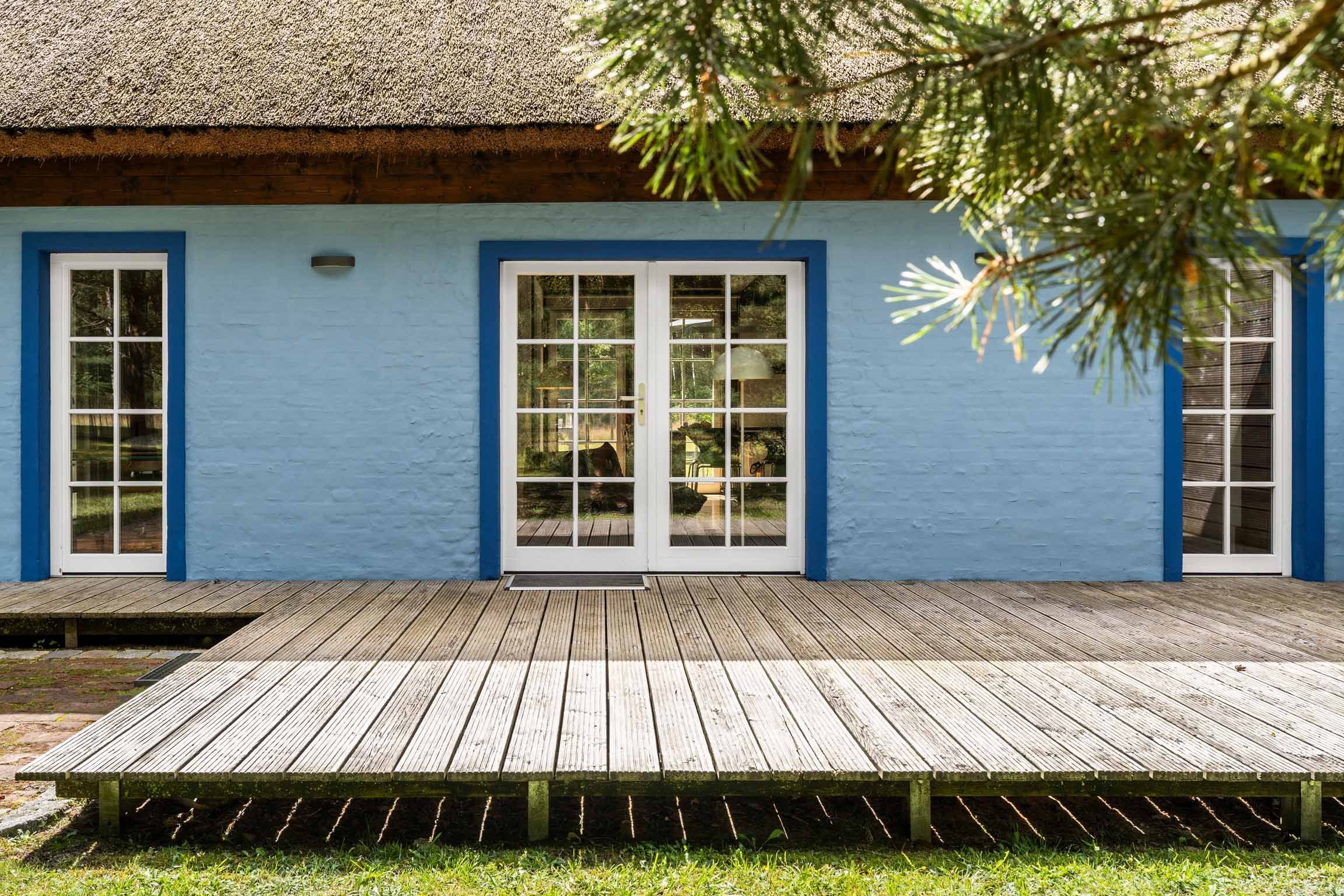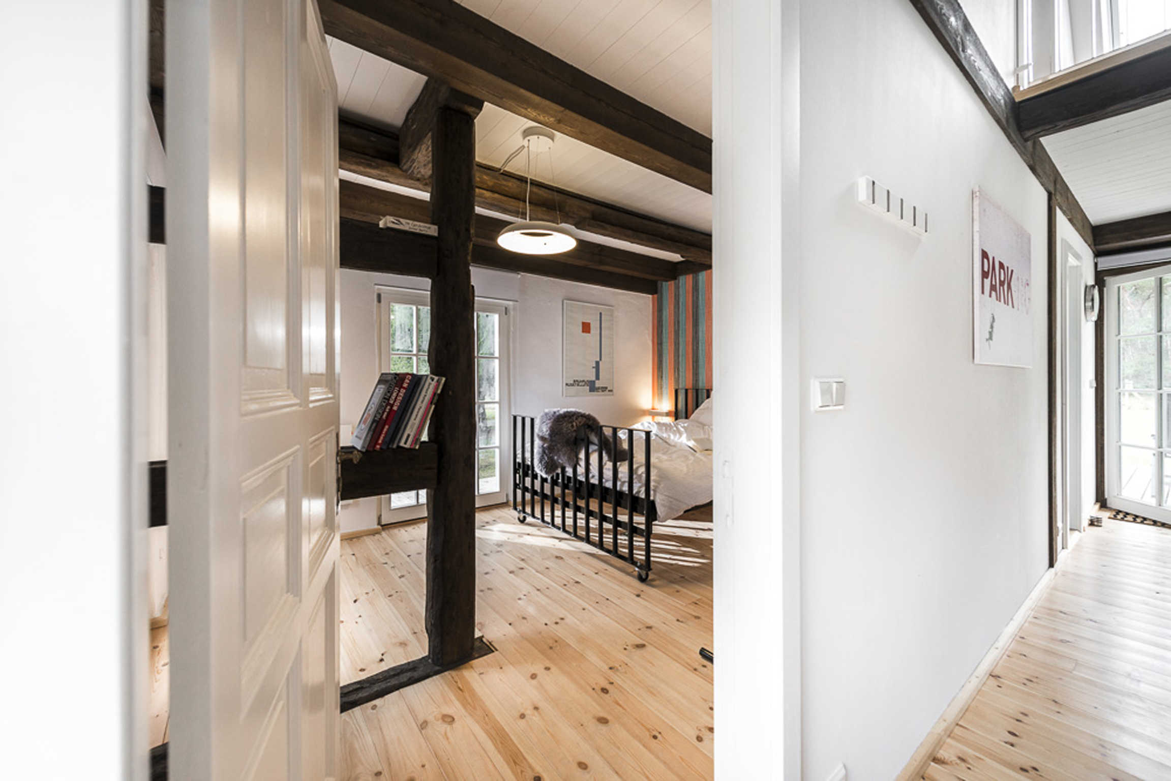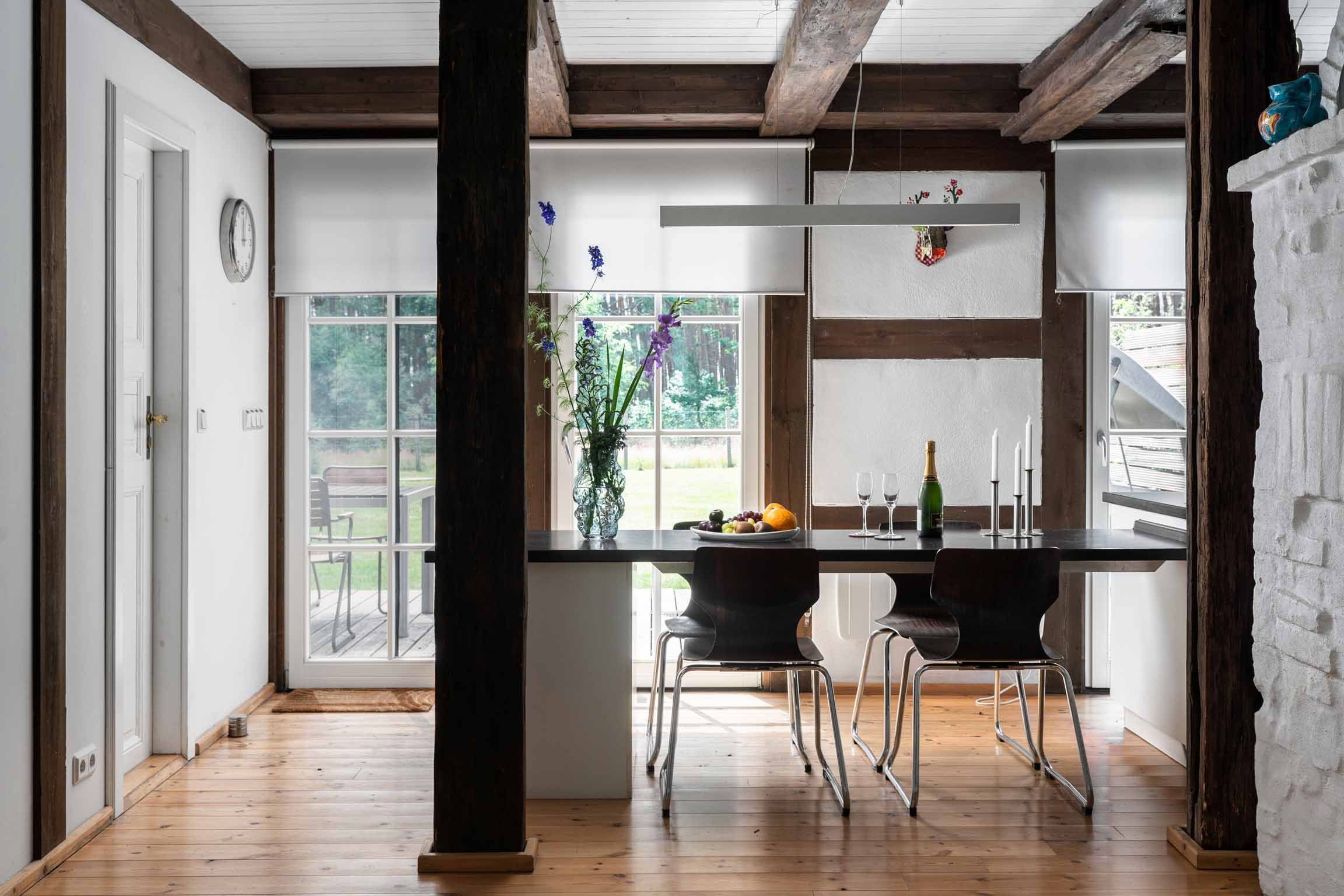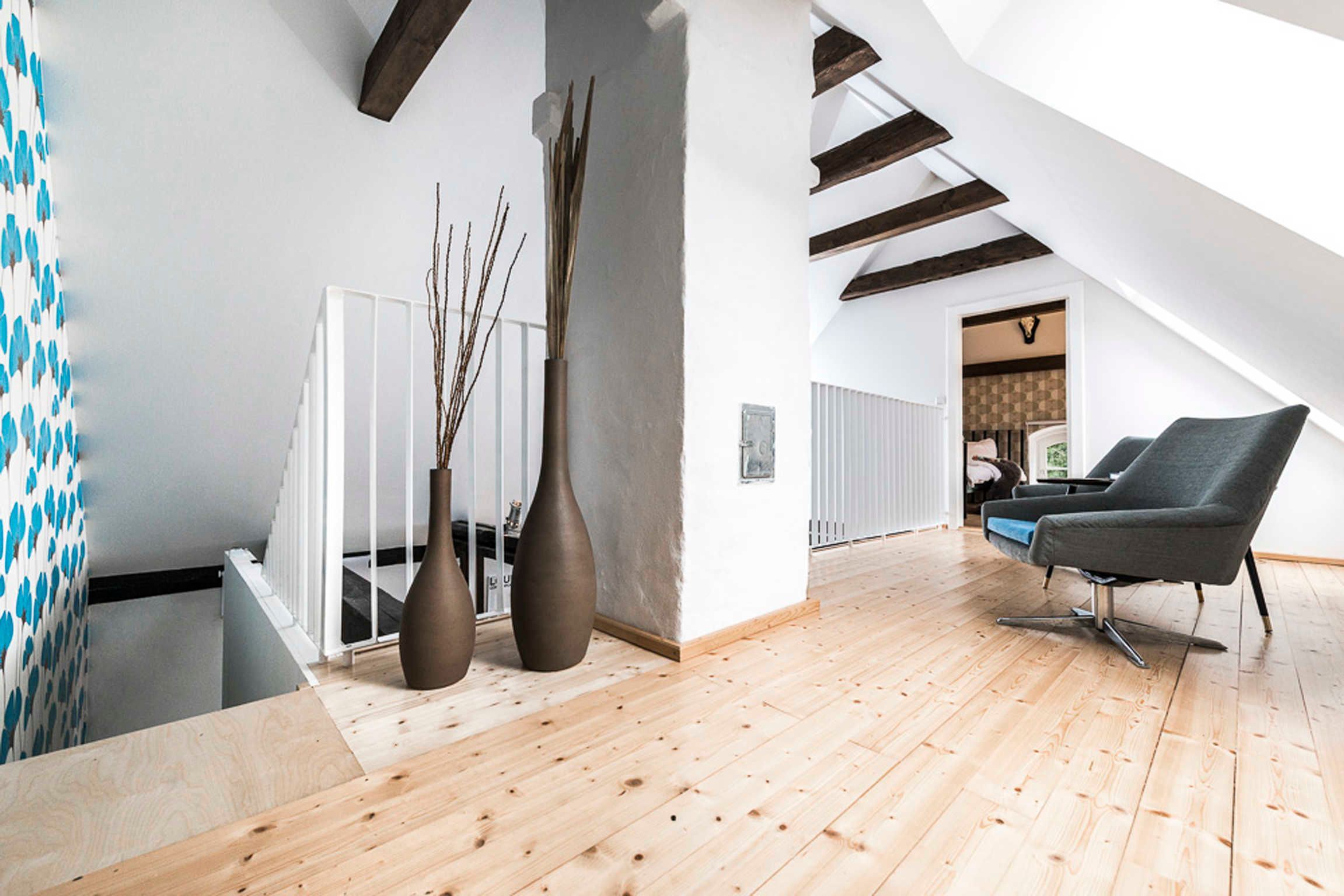 Das reetgedeckte Kolonistenhaus aus dem 18. Jahrhundert wurde 2013 aufwendig umgestaltet und modernisiert. Dabei lag der Fokus darauf, die markantesten historischen Elemente des Hauses zu erhalten und Ihnen moderne, zeitgenössische Ausstattungselemente gegenüberzustellen. In der Folge entstand durch das Freilegen der originalen Fachwerkbalken im Inneren ein großzügiger, luftiger und lichtdurchfluteter Wohnraum mit offener Galerie, in dessen Mitte der robust gemauerte Schornstein wie ein Monolith den Raum dominiert. Auf hellen Holzdielen sind nun mit vielen anderen liebevollen Details Möbelklassiker der früher 70er Jahre eingezogen, welche den modernen Stil des Hauses und gleichzeitig den Kontrast zu den historischen Stilelementen unterstreichen. Im vorderen Teil des Wohnraums empfängt Sie heute ein stylisches Sofa Set der Firma Ligne Roset mit Kamin und TV, im hinteren Bereich die offene, moderne Designerküche mit praktischer Kochinsel und langgezogenem Esstisch. Seitlich schließen sich eines der beiden Schlafzimmer mit gemütlichem Doppelbett und ein großzügiges Bad mit Wanne, Dusche und WC an. Sämtliche Fenster im Erdgeschoß sind bodentief und bilden Ausgänge auf die das Haus umgebende, weitläufige Holzterrasse. Die maßgeschneiderte Einbautreppe - geschickt hinter der Kücheneinbauwand versteckt - führt schließlich ins luftige Obergeschoss, welches hinter dem Bereich der offenen Galerie ein weiteres abgeschlossenes Schlafzimmer bietet.