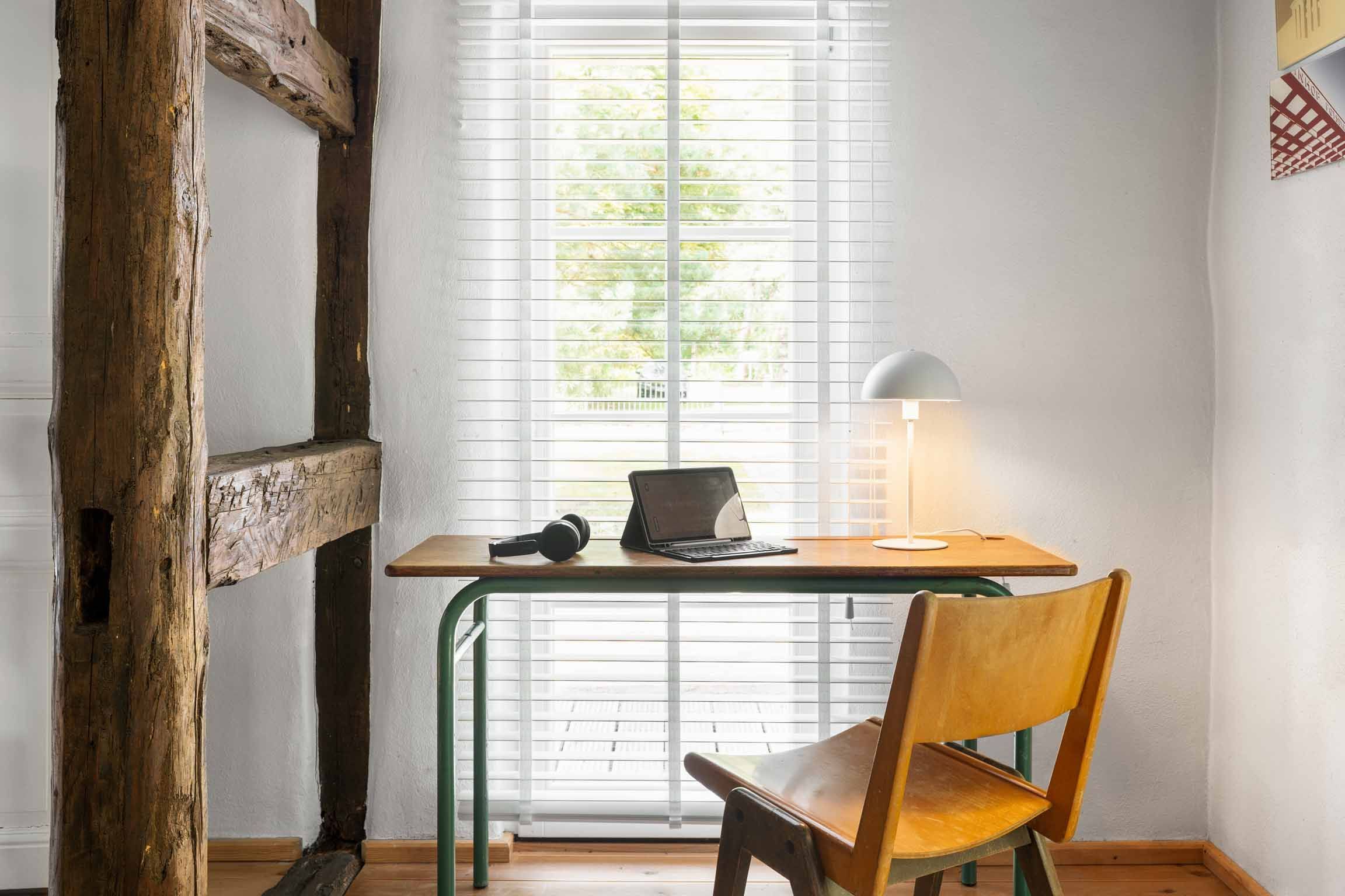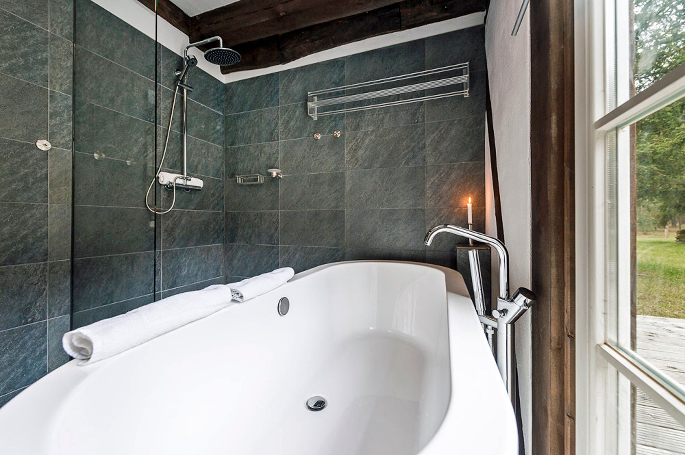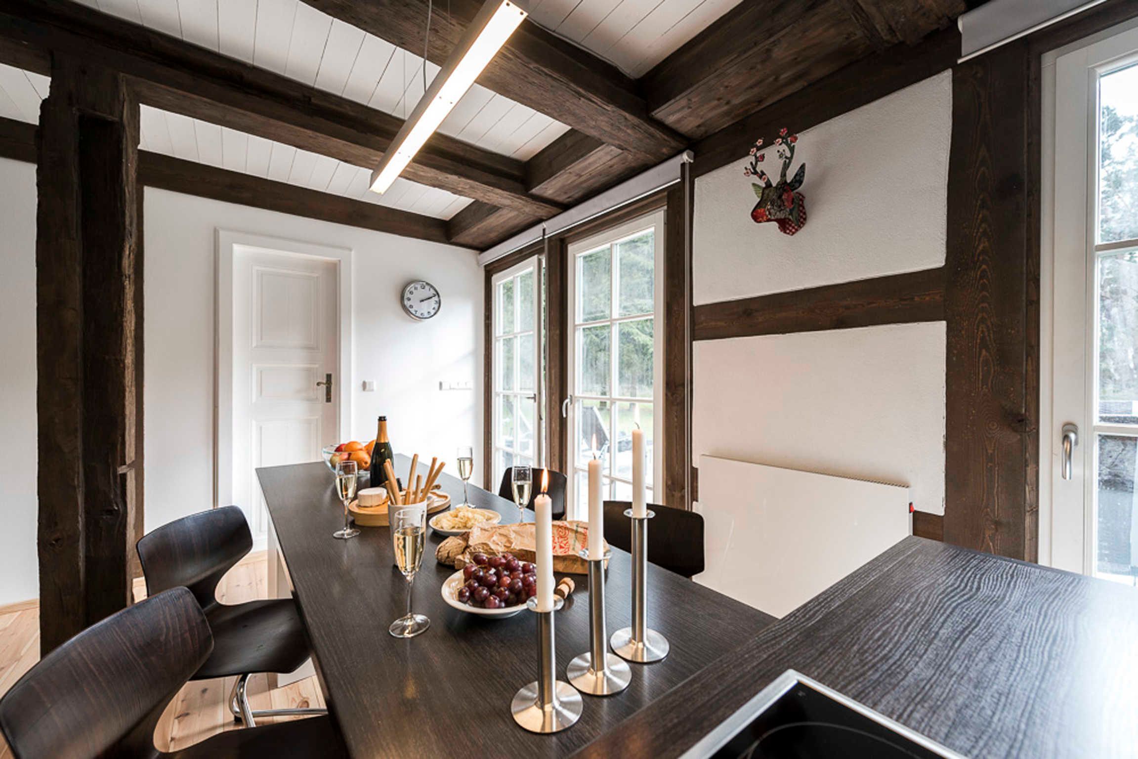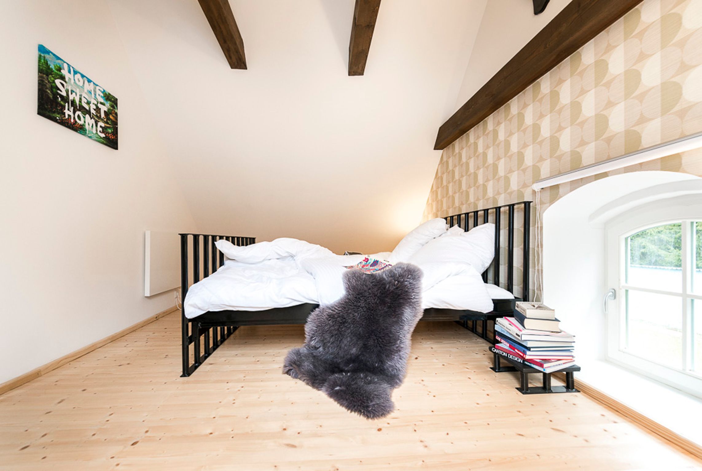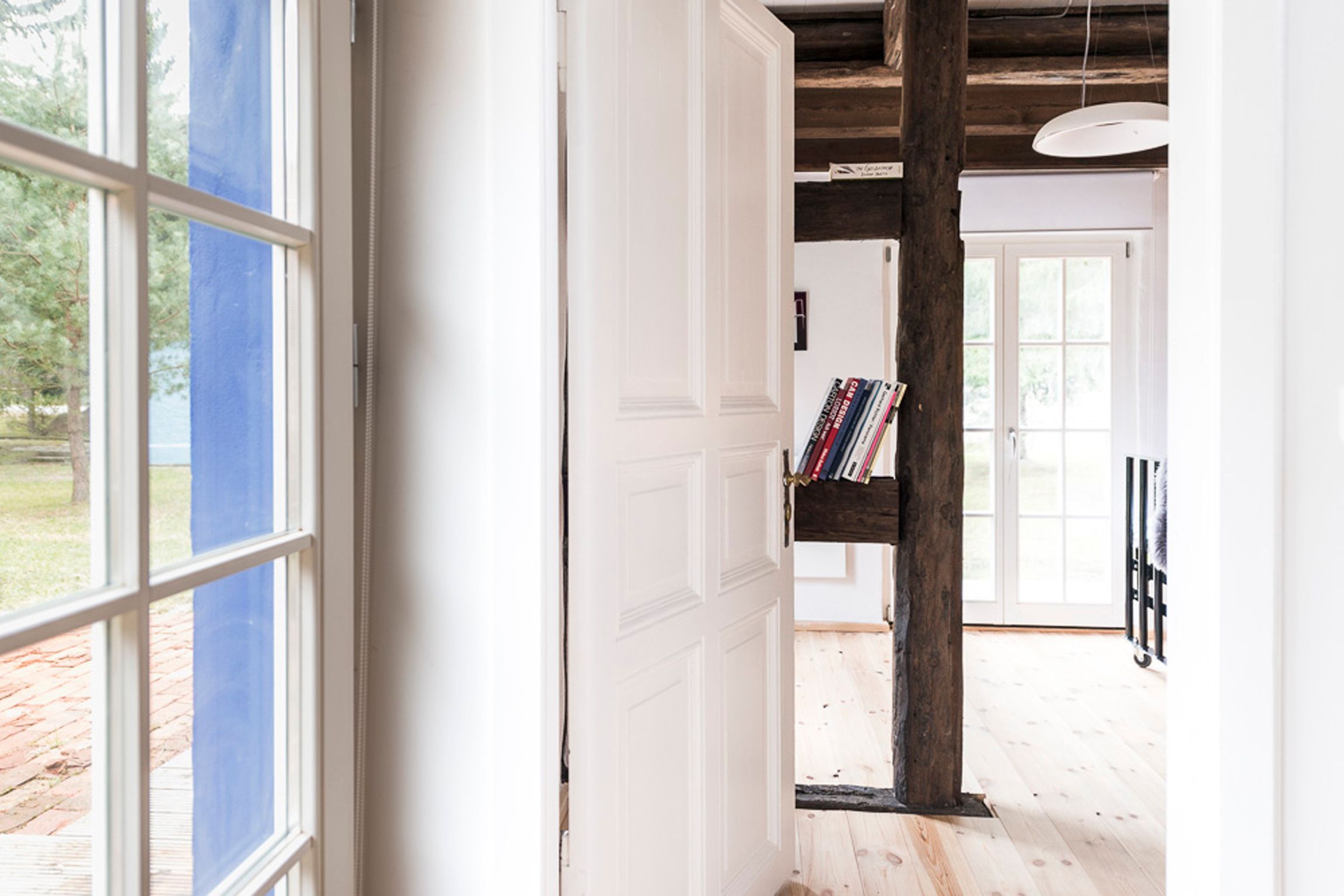 Das reetgedeckte Kolonistenhaus aus dem 18. Jahrhundert wurde 2013 aufwendig umgestaltet und modernisiert. Dabei lag der Fokus darauf, die markantesten historischen Elemente des Hauses zu erhalten und Ihnen moderne, zeitgenössische Ausstattungselemente gegenüberzustellen. In der Folge entstand durch das Freilegen der originalen Fachwerkbalken im Inneren ein großzügiger, luftiger und lichtdurchfluteter Wohnraum mit offener Galerie, in dessen Mitte der robust gemauerte Schornstein wie ein Monolith den Raum dominiert. Auf hellen Holzdielen sind nun mit vielen anderen liebevollen Details Möbelklassiker der früher 70er Jahre eingezogen, welche den modernen Stil des Hauses und gleichzeitig den Kontrast zu den historischen Stilelementen unterstreichen. Im vorderen Teil des Wohnraums empfängt Sie heute ein stylisches Sofa Set der Firma Ligne Roset mit Kamin und TV, im hinteren Bereich die offene, moderne Designerküche mit praktischer Kochinsel und langgezogenem Esstisch. Seitlich schließen sich eines der beiden Schlafzimmer mit gemütlichem Doppelbett und ein großzügiges Bad mit Wanne, Dusche und WC an. Sämtliche Fenster im Erdgeschoß sind bodentief und bilden Ausgänge auf die das Haus umgebende, weitläufige Holzterrasse. Die maßgeschneiderte Einbautreppe - geschickt hinter der Kücheneinbauwand versteckt - führt schließlich ins luftige Obergeschoss, welches hinter dem Bereich der offenen Galerie ein weiteres abgeschlossenes Schlafzimmer bietet.