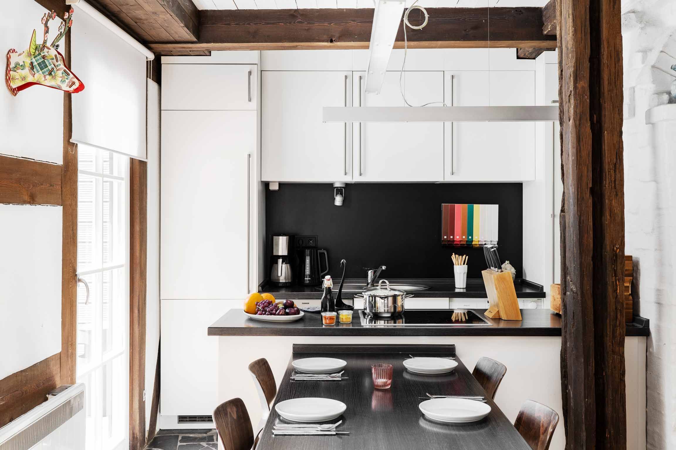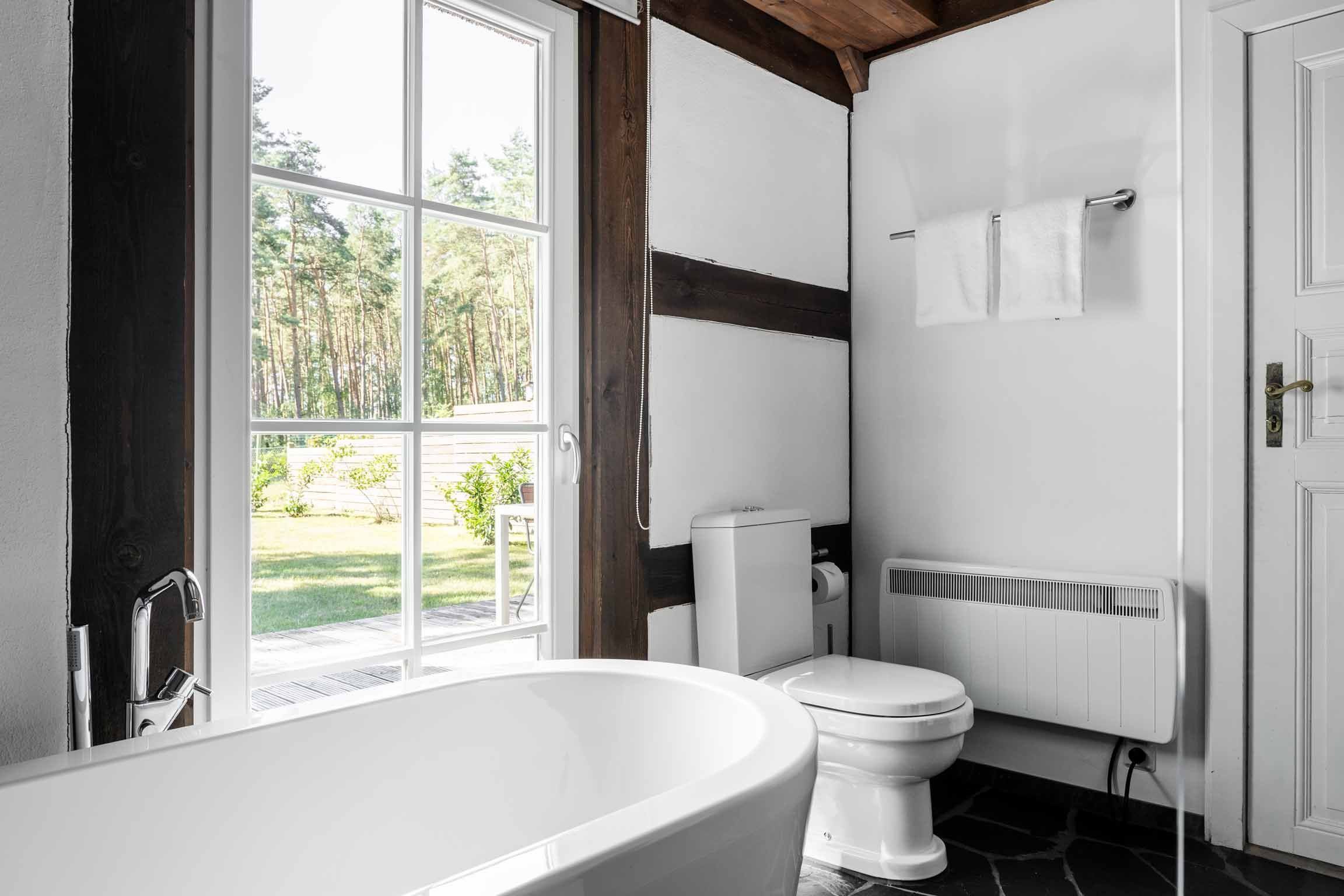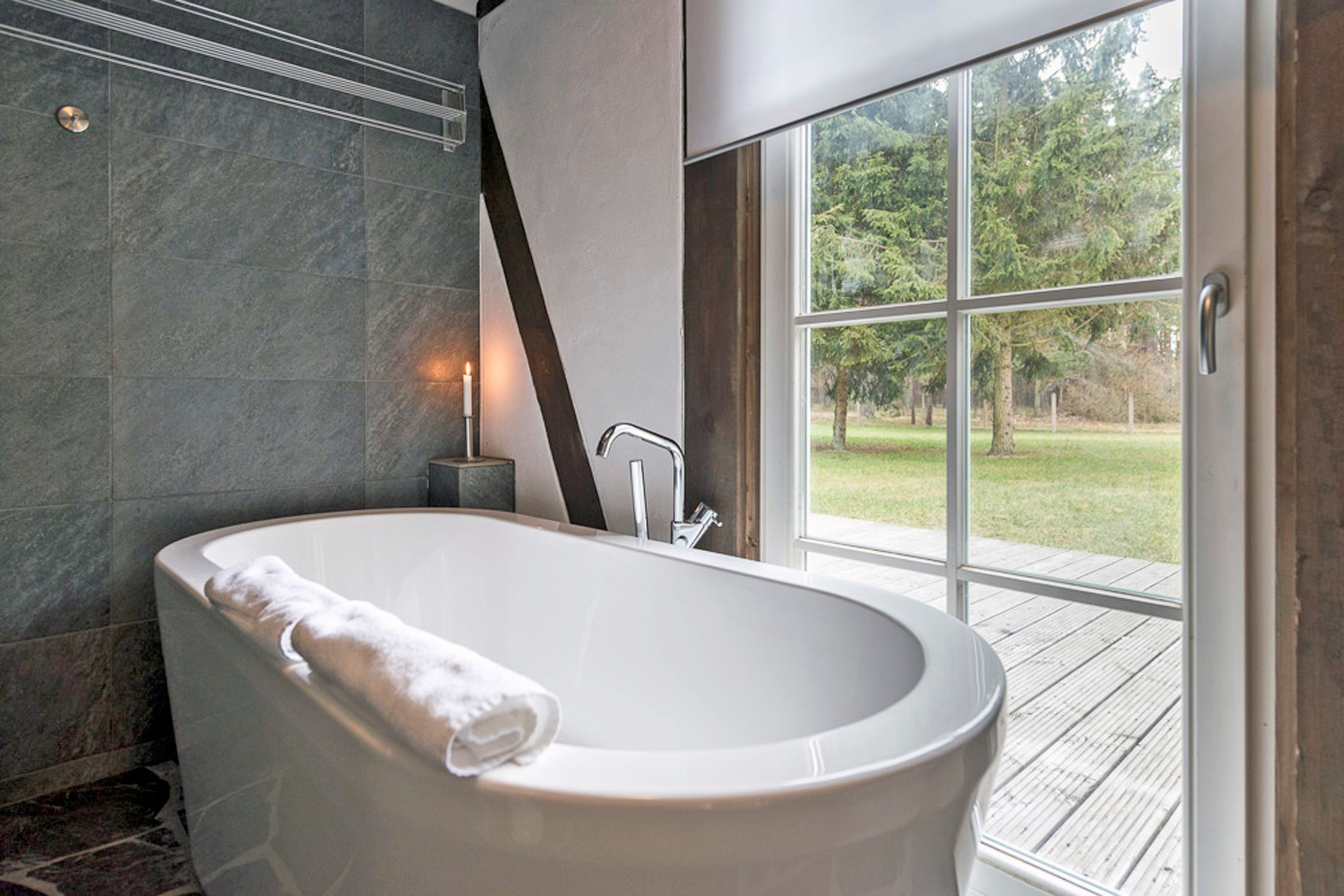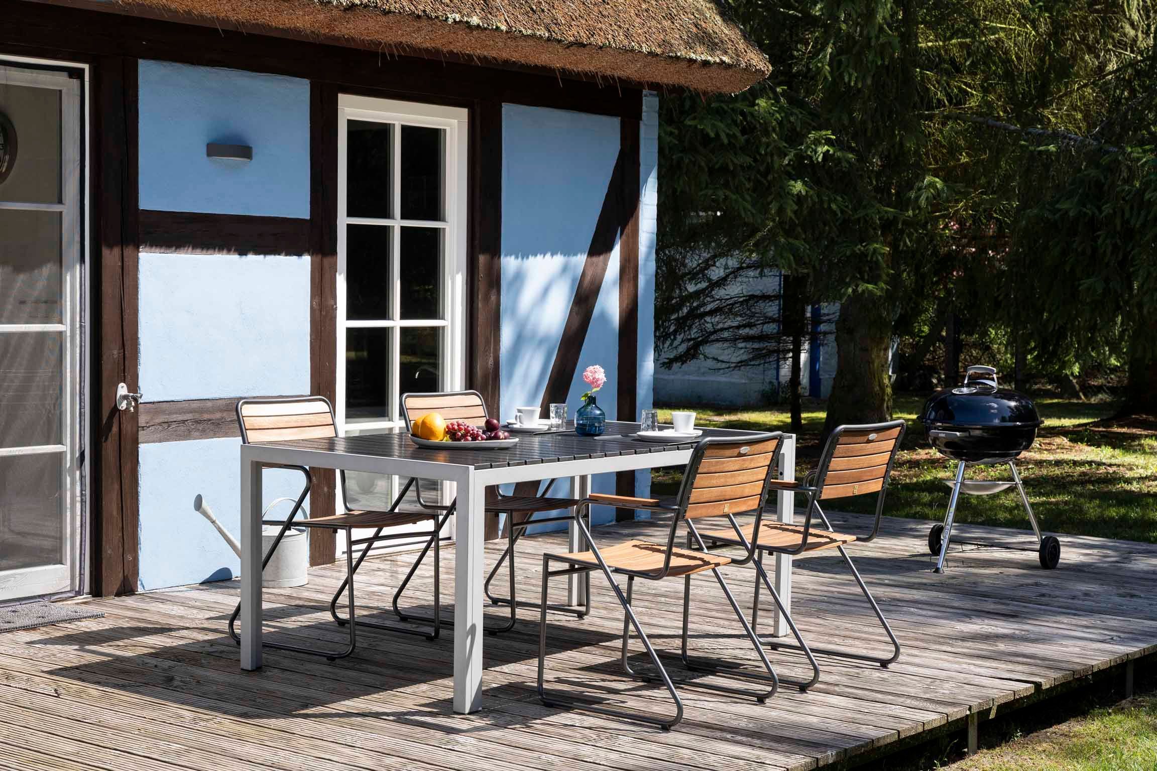 Das reetgedeckte Kolonistenhaus aus dem 18. Jahrhundert wurde 2013 aufwendig umgestaltet und modernisiert. Dabei lag der Fokus darauf, die markantesten historischen Elemente des Hauses zu erhalten und Ihnen moderne, zeitgenössische Ausstattungselemente gegenüberzustellen. In der Folge entstand durch das Freilegen der originalen Fachwerkbalken im Inneren ein großzügiger, luftiger und lichtdurchfluteter Wohnraum mit offener Galerie, in dessen Mitte der robust gemauerte Schornstein wie ein Monolith den Raum dominiert. Auf hellen Holzdielen sind nun mit vielen anderen liebevollen Details Möbelklassiker der früher 70er Jahre eingezogen, welche den modernen Stil des Hauses und gleichzeitig den Kontrast zu den historischen Stilelementen unterstreichen. Im vorderen Teil des Wohnraums empfängt Sie heute ein stylisches Sofa Set der Firma Ligne Roset mit Kamin und TV, im hinteren Bereich die offene, moderne Designerküche mit praktischer Kochinsel und langgezogenem Esstisch. Seitlich schließen sich eines der beiden Schlafzimmer mit gemütlichem Doppelbett und ein großzügiges Bad mit Wanne, Dusche und WC an. Sämtliche Fenster im Erdgeschoß sind bodentief und bilden Ausgänge auf die das Haus umgebende, weitläufige Holzterrasse. Die maßgeschneiderte Einbautreppe - geschickt hinter der Kücheneinbauwand versteckt - führt schließlich ins luftige Obergeschoss, welches hinter dem Bereich der offenen Galerie ein weiteres abgeschlossenes Schlafzimmer bietet.
