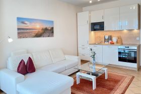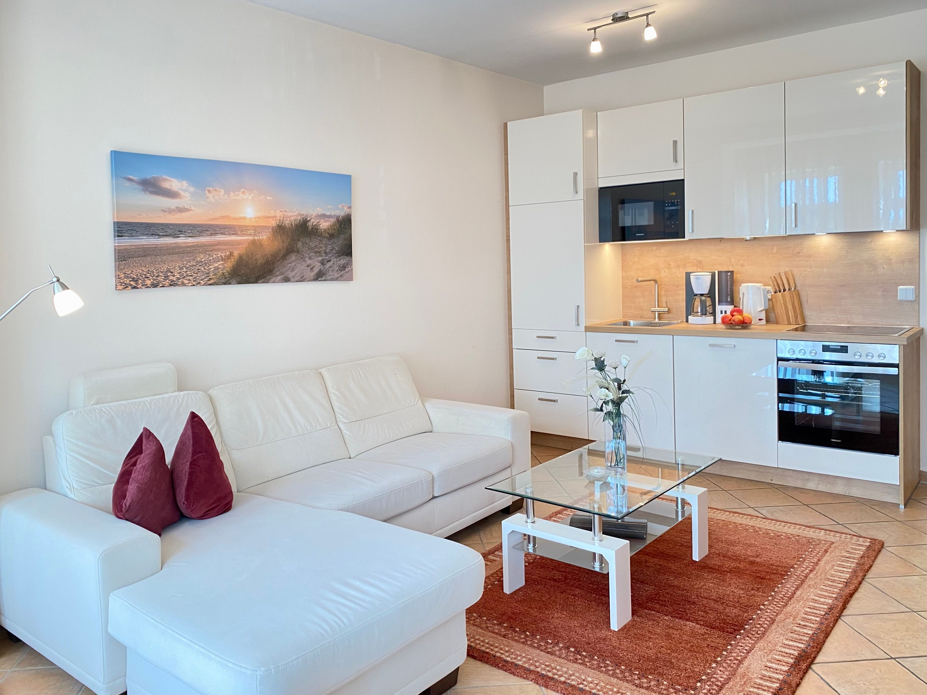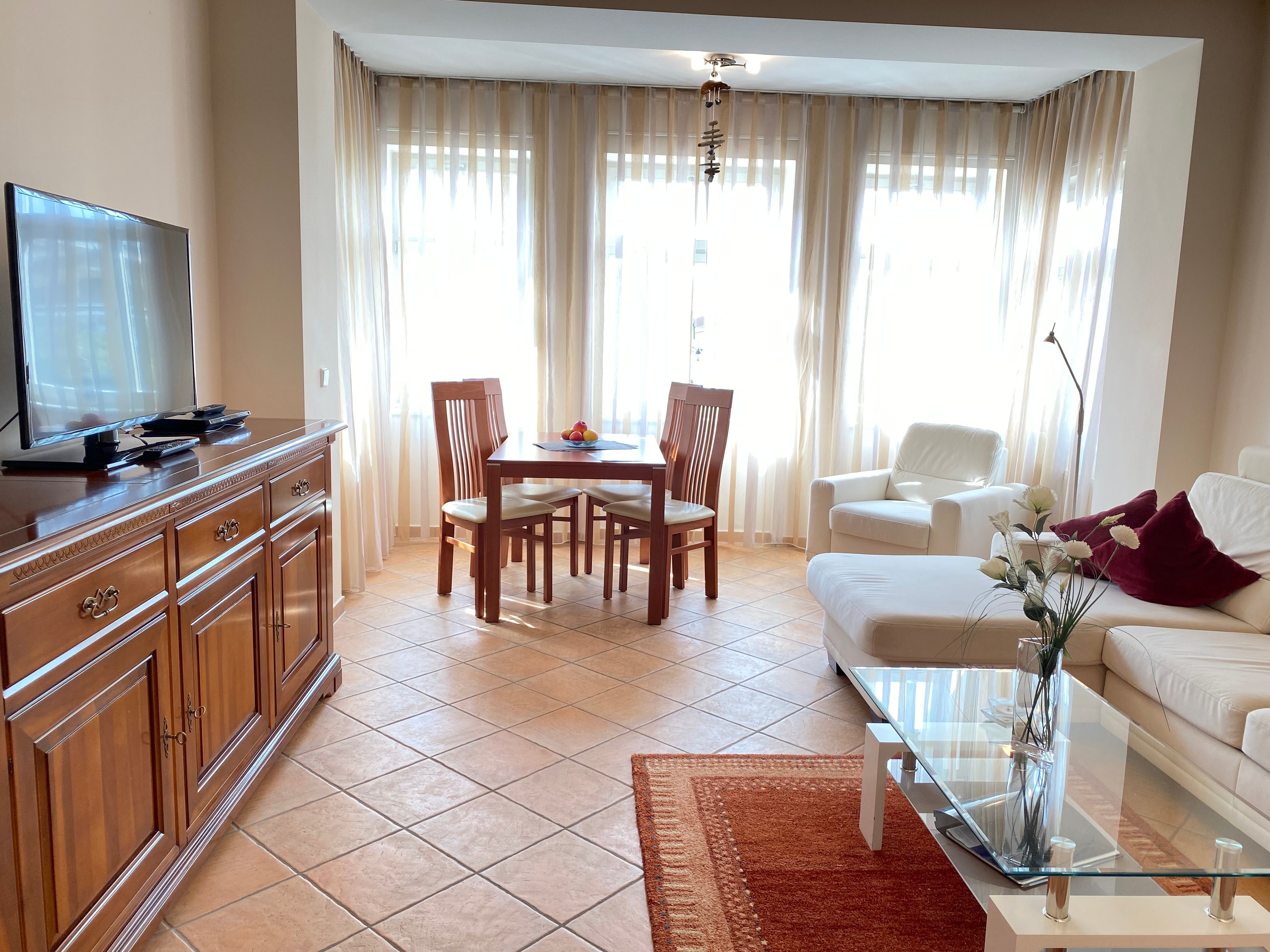 Die Ferienwohnung 1 befindet sich im Erdgeschoss der Bäderstilvilla und hat eine überdachte Terrasse auf der Rückseite des Hauses, auf der Sie das Leben im Freien genießen können. Zur Wohnung gehören ein großes Badezimmer mit Doppelwaschtisch, Dusche und Badewanne. In dem gemütliches Wohnzimmer, in das die Komplettküche klug integriert wurdevund ein Schlafzimmer mit Doppelbett. Die Ferienwohnung ist komplett  gefliest. Selbstverständlich gibt es moderne Unterhaltungstechnik und freies Internet  für die wenigen Regenstunden auf Usedom.