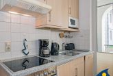 Der Küchenbereich ist ausgestattet mit einem Esstisch und verfügt über einen Herd mit Backofen, Kühlschrank, Mikrowelle, Geschirrspüler, Toaster, Kaffeemaschine ect.