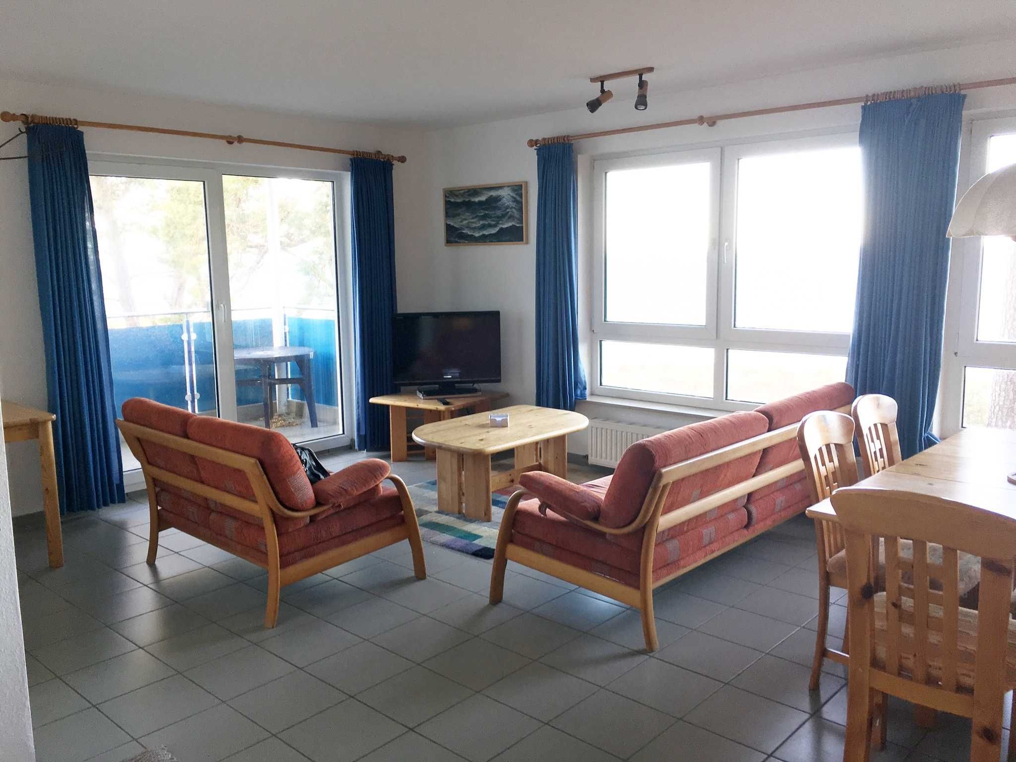 Die im ersten Obergeschoss an der Nord- und Westseite des Hauses gelegene, durch große Glasfenster freie Blicke auf das Meer bietende, ca. 70 qm große Wohnung Nr. 35 verfügt über Bad/WC mit Dusche und Waschmaschine, zwei Schlafzimmer sowie einen geräumigen Wohnraum mit Sitzgruppe, Essplatz für bis zu 6 Personen und einer Küchenzeile (4 Kochplatten, Backofen, Mikrowelle, Kühlschrank, Geschirrspüler, Kaffeemaschine, Toaster). Der größere Wohnraum sowie das eine Schlafzimmer haben Zugang zum südwestlich gelegenen Balkon und sind oftmals Schauplatz schöner Sonnenuntergänge.
