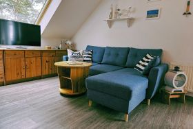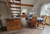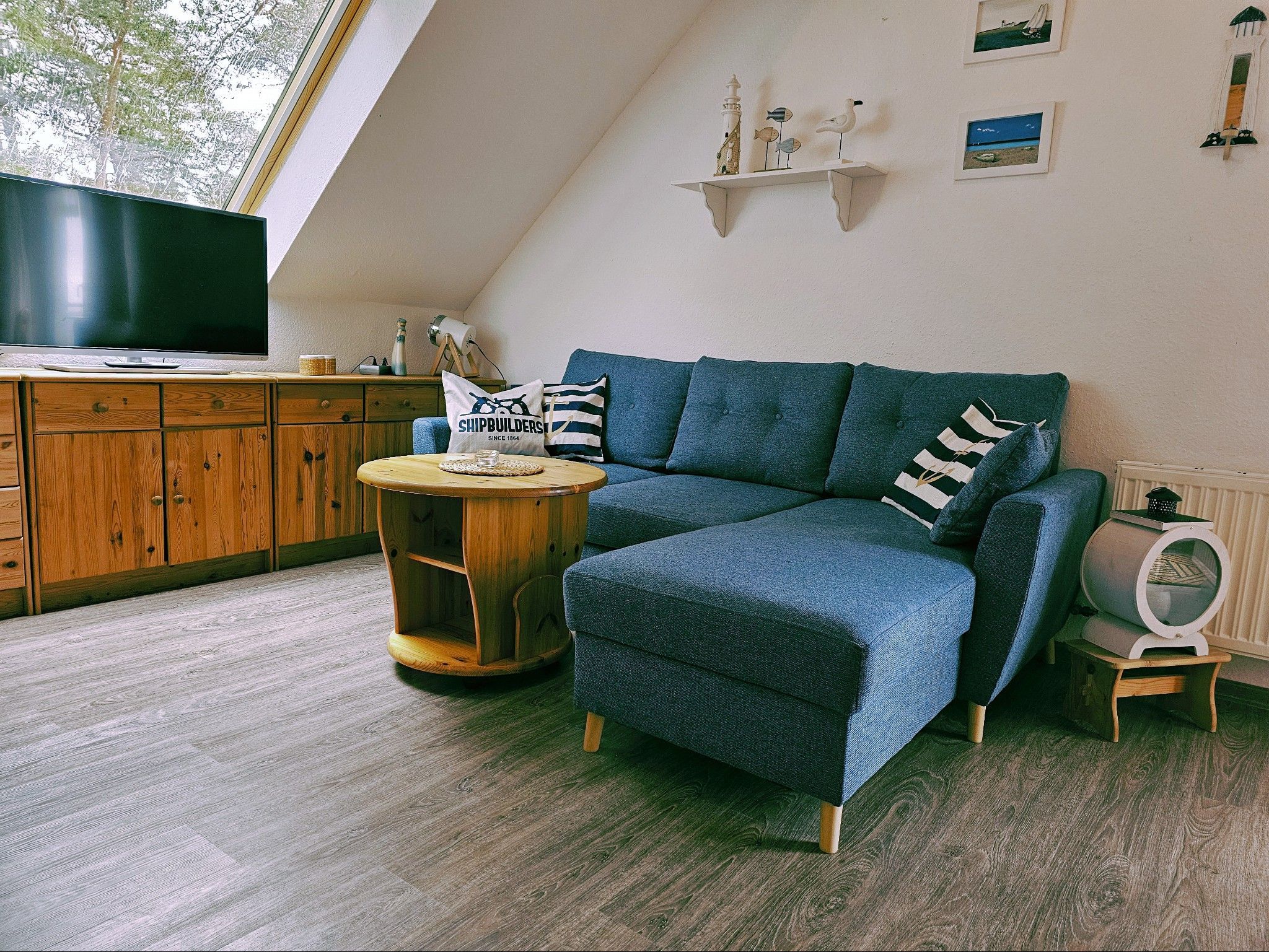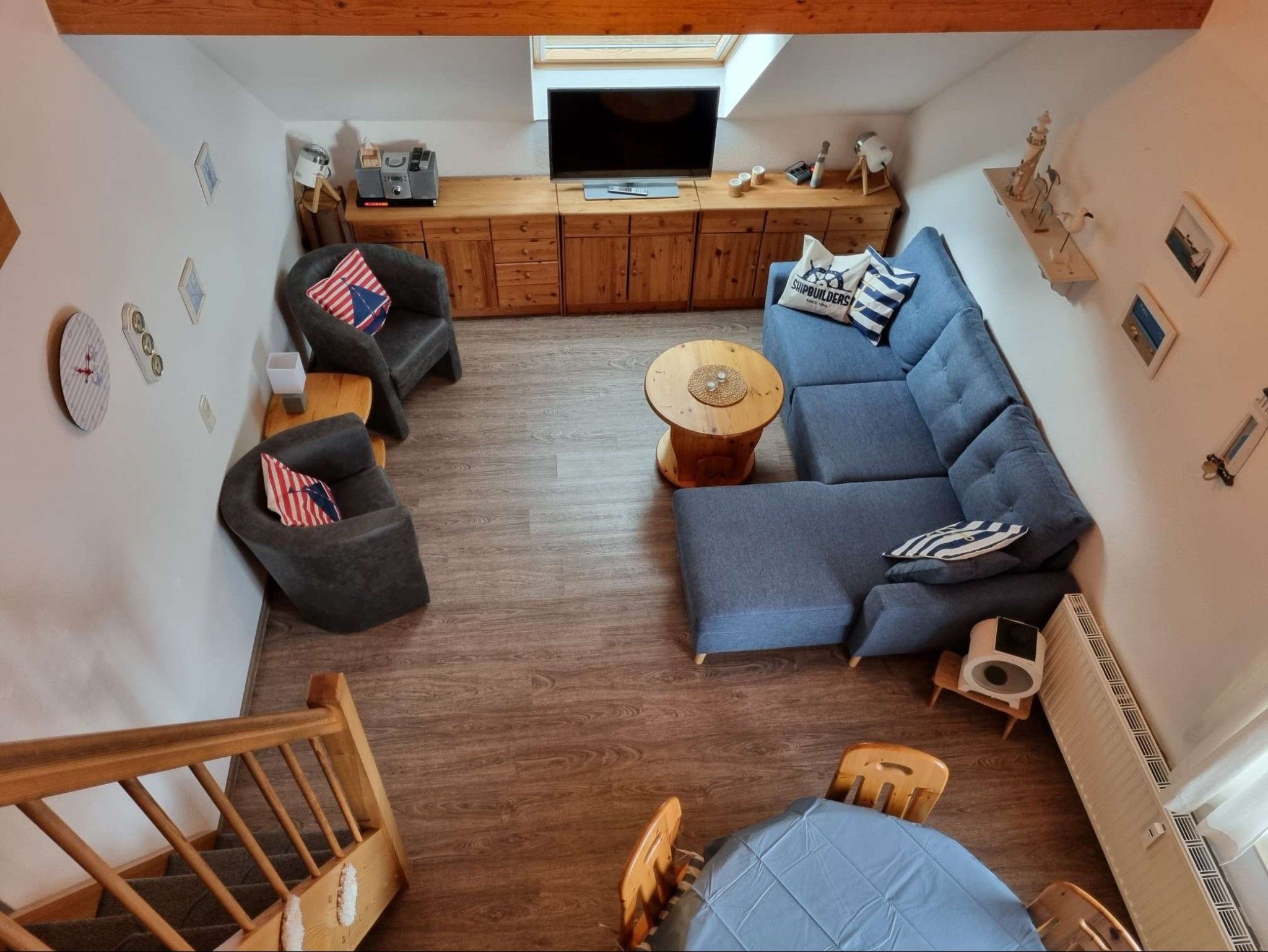 Die im zweiten Obergeschoss an der Nord- und Westseite des Hauses gelegene 64 qm große Wohnung Nr. 24 verfügt über einen geräumigen Wohnraum mit Sitzgruppe, Essplatz für bis zu 5 Personen und einer Küchenzeile (Herd mit Backofen und Ceranfeld, Mikrowelle, Kühlschrank, Geschirrspüler, Kaffeemaschine, Toaster), Bad/WC mit Badewanne, zwei Schlafzimmer ( 1 davon als Maisonette offen mit steiler Treppe ins Obergeschoss ).