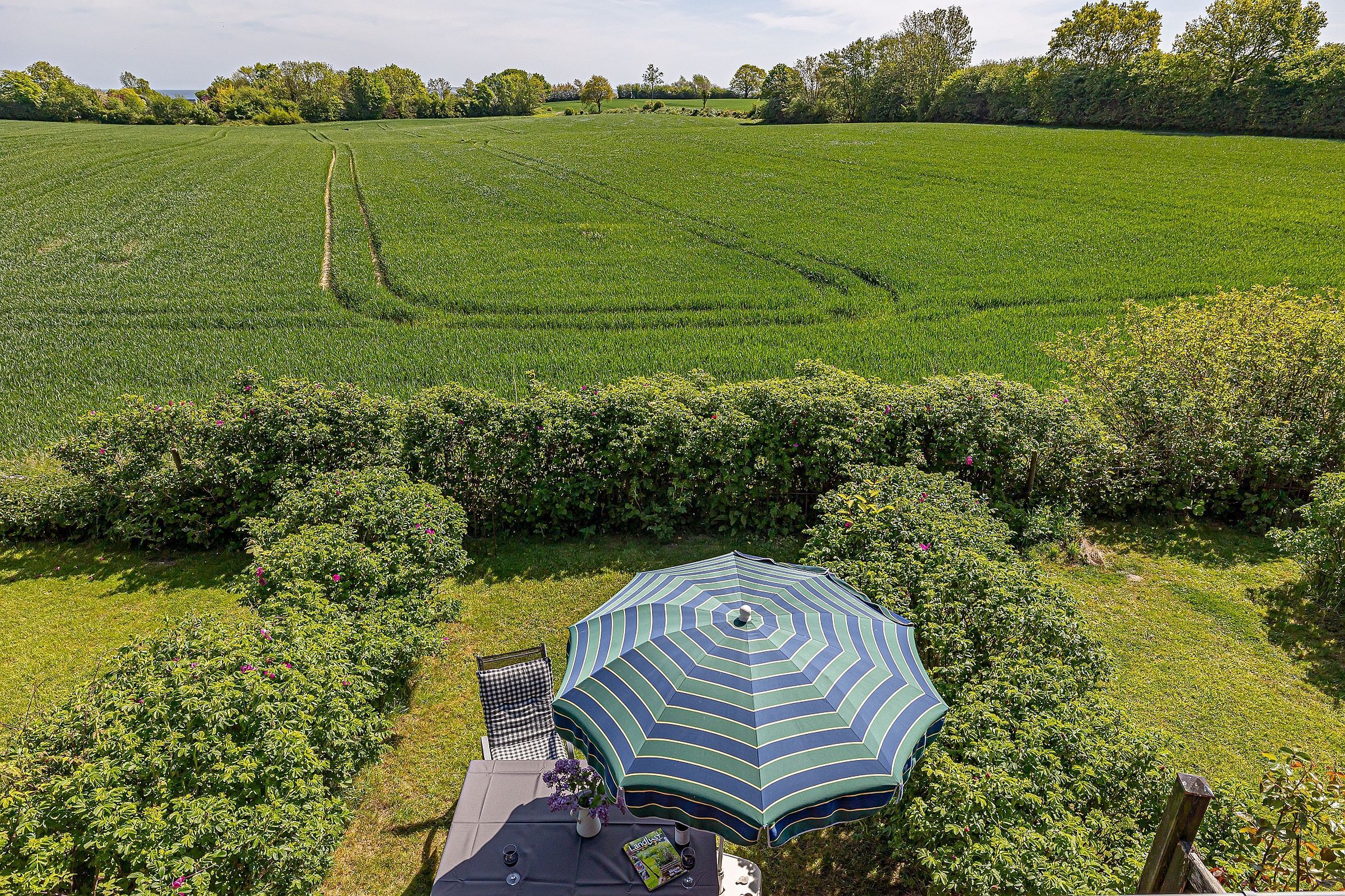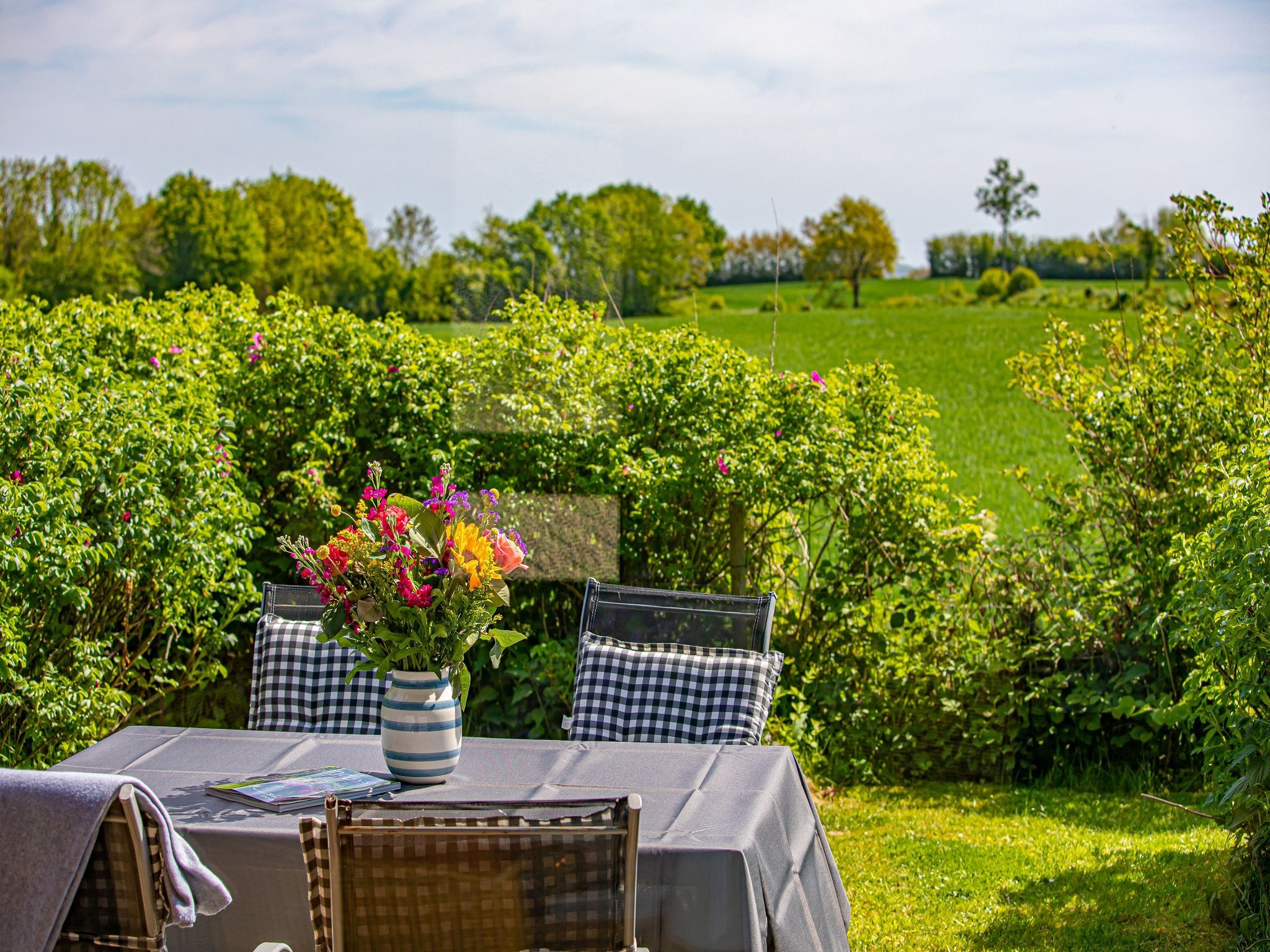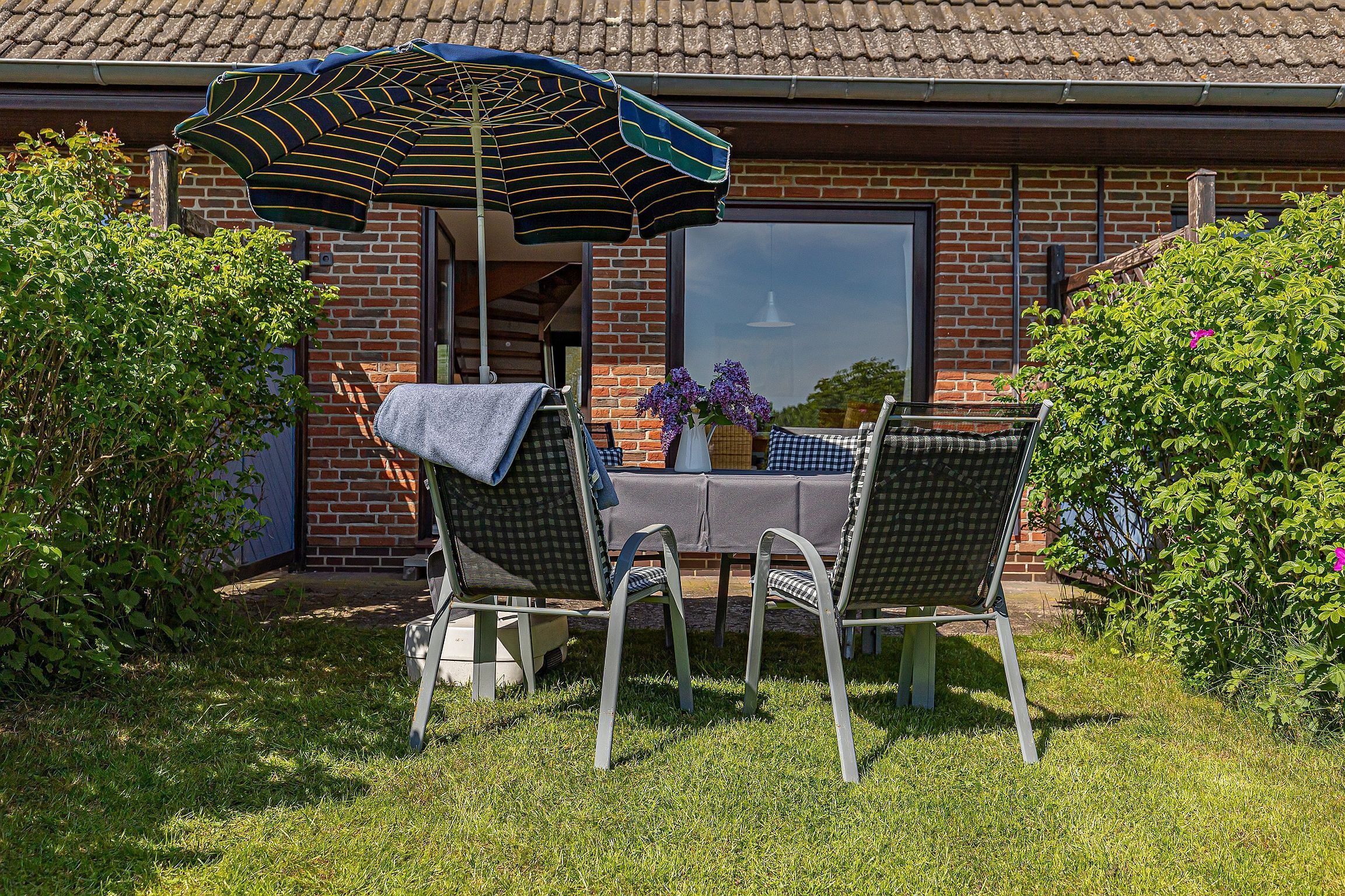Fünf Ferienwohnungen reihen sich nahtlos aneinander. Jede hat einen separaten Eingang und eine eigene Terrasse mit Gartenmöbeln und Grill. Der Panoramablick zeigt Ihnen die Wiesen und Weiden Richtung Meer.
