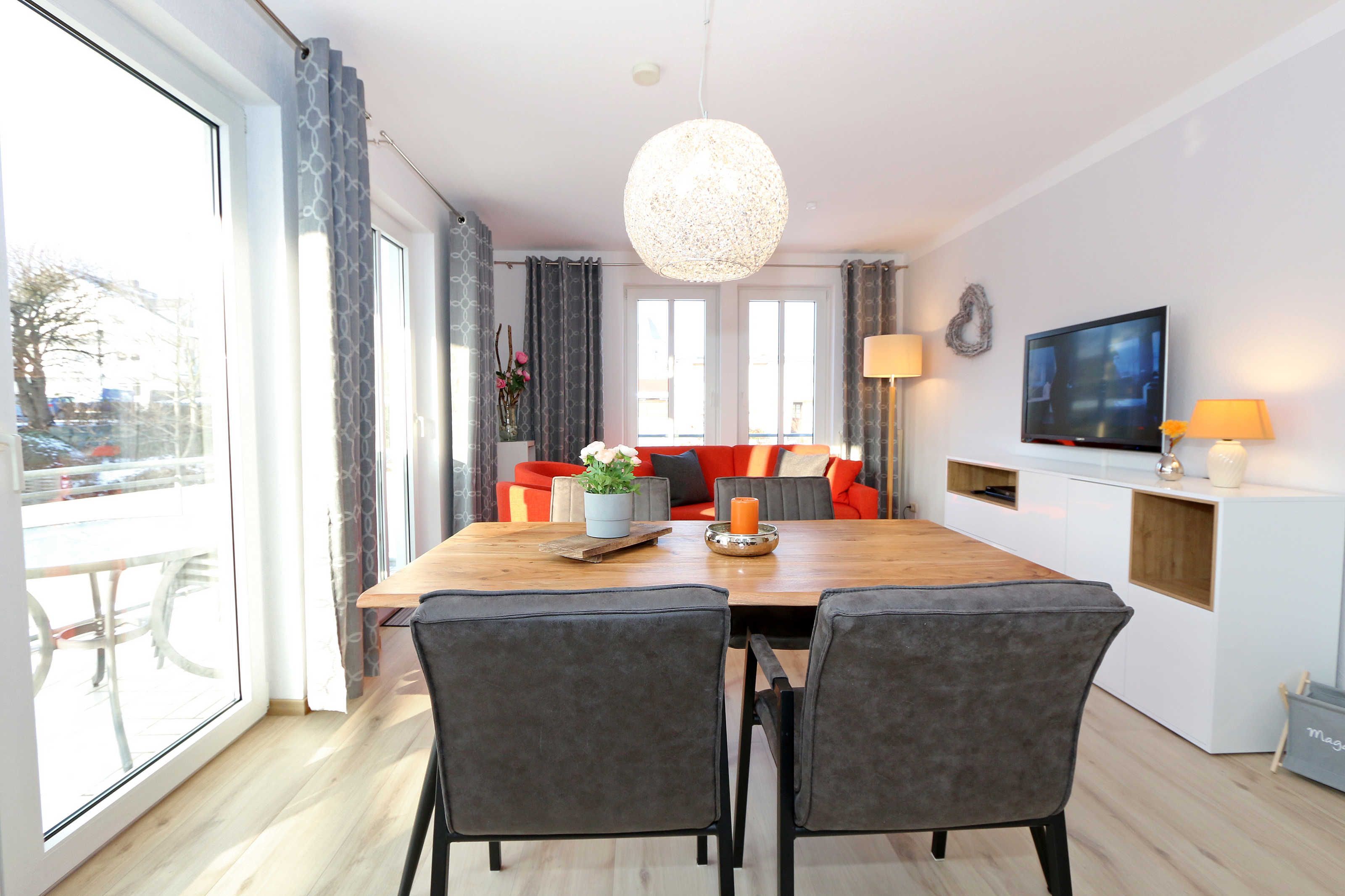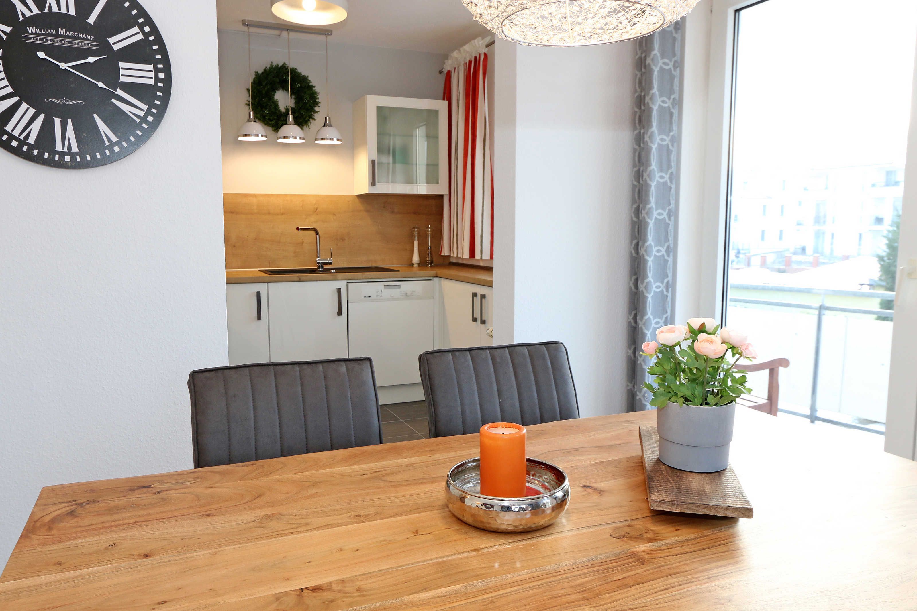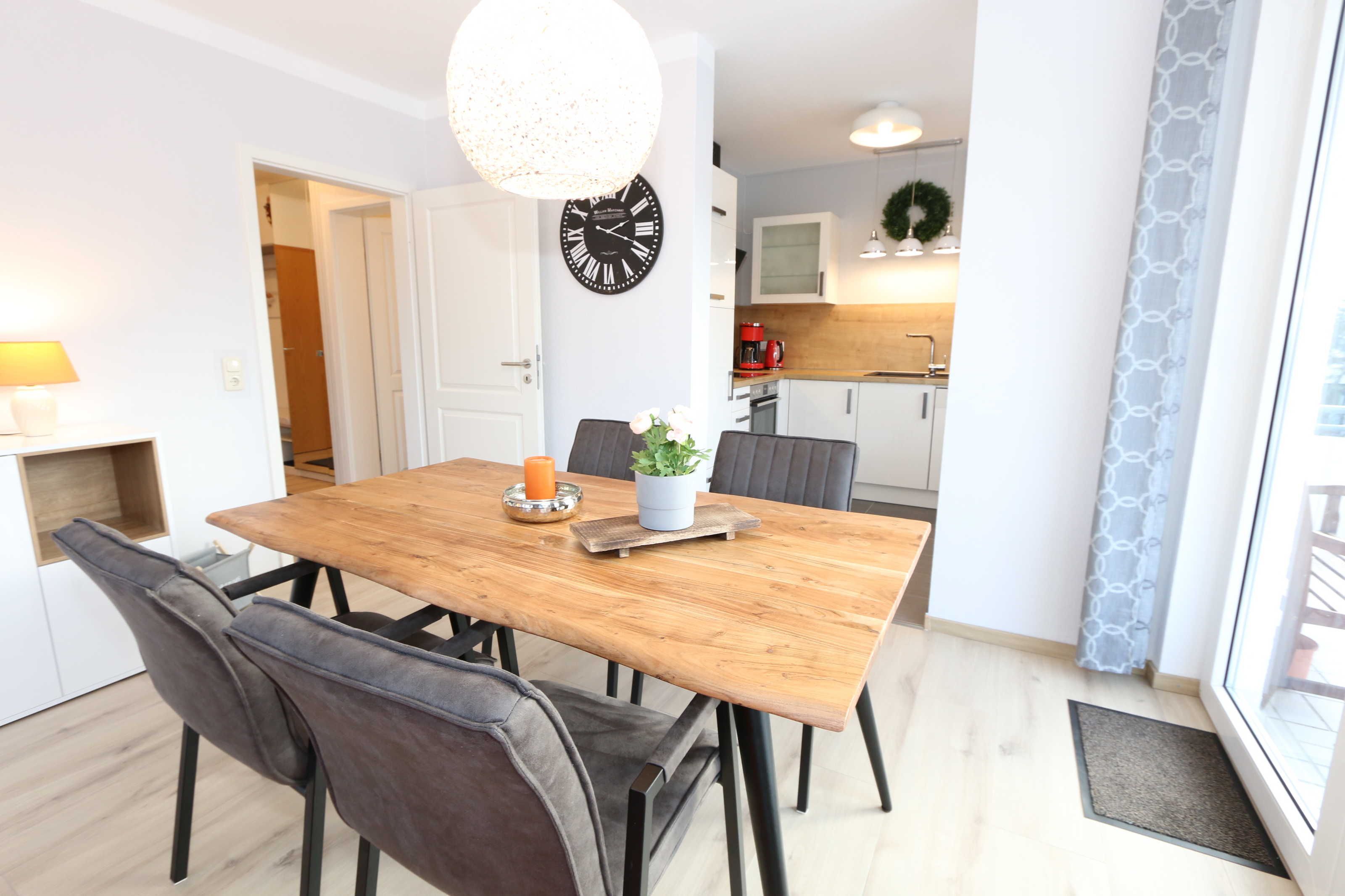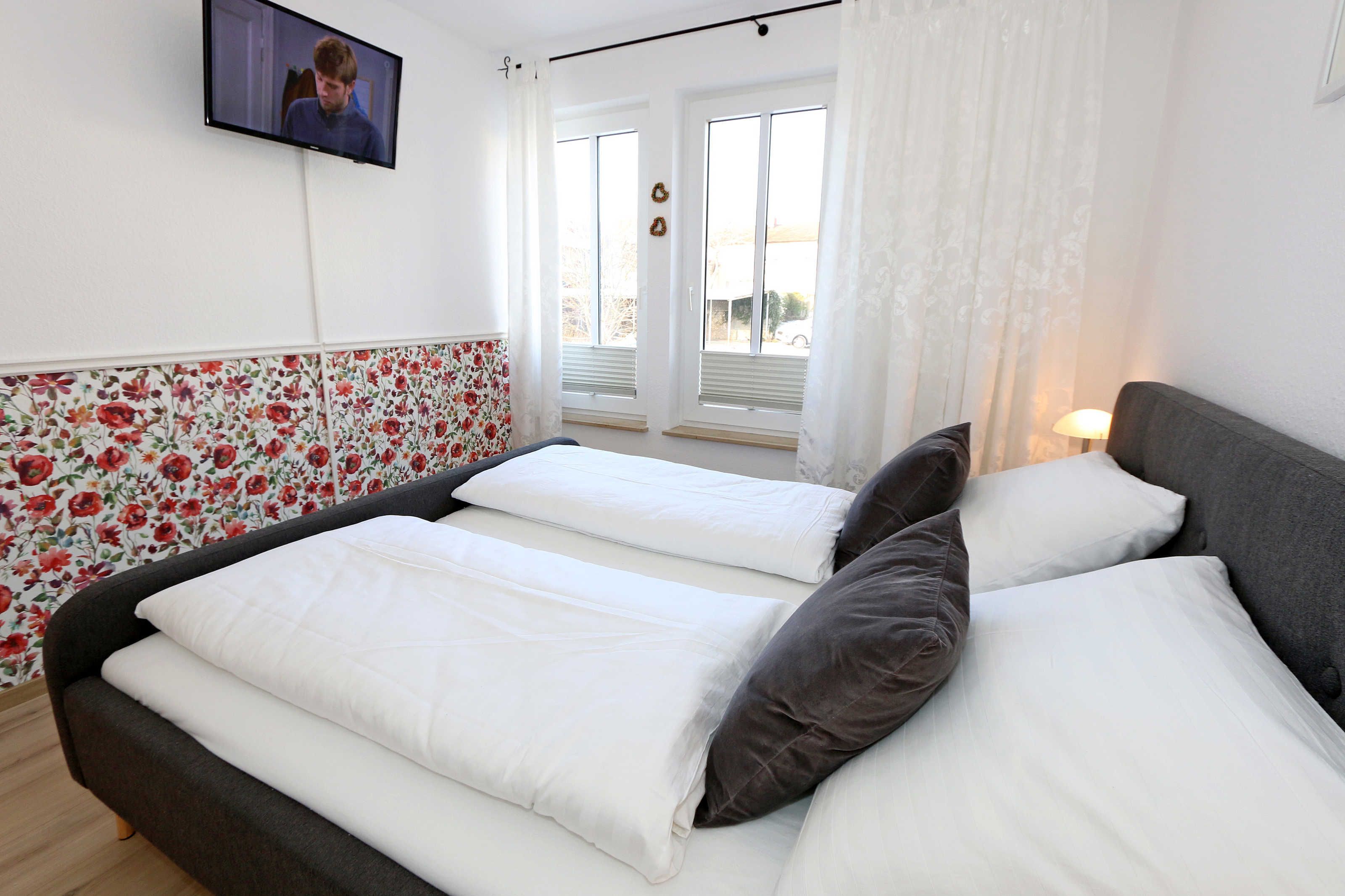Die Nichtraucherferienwohnung des Hauses Eintracht ist eine komfortable 2-Raumwohnung in der 1. Etage und umfasst etwa 56m², somit bietet sie Platz für bis zu 4 Personen. Sie setzt sich zusammen aus einem Wohnzimmer mit Zugang zum Balkon, einem Schlafzimmer, einer Küchenzeile, einem Flur und einem Badezimmer. Der Wohnbereich ist liebevoll und detailreich eingerichtet. In dem lichtdurchfluteten Raum finden sie, neben zwei Sessel, einen Couchtisch, eine Schlafcouch (1,60m x 2,00m), welches als Schlafmöglichkeit für 2 Personen geeignet ist. Ein Smart-TV sowie ein DVD-Player ermöglichen es ihnen, nach einem eindrucksvollen Tag einen gemütlichen Filmabend mit den Liebsten zu verbringen. Auch ein Radio mit CD-Player und verschiedene Lektüren für die Bücherwürmer unter Ihnen sind vorzufinden. Auf einen Internetzugang (WLAN) brauchen Sie nicht zu verzichten. Des Weiteren befindet sich hier auch ein schöner Esstisch mit vier bequemen Stühlen, die sich direkt am Balkon Fenster befinden. Auf diesem zu Süd gerichteten Balkon befindet sich ein Tisch mit vier Stühlen, einen Sonnenschirm sowie einer Gartenbank. Die neu moderne Küchenzeile ist ausgestattet mit einem Ceranfeld, Backofen und einem Kühlschrank mit Eisfach, Geschirrspüler, Mikrowelle, Wasserkocher, Toaster, Kaffeemaschine und diverse Kochutensilien. Das Schlafzimmer ist mit einem Doppelbett (1,80m x 2,00m), verstellbare Lattenroste, Nachttischablagen und einem geräumigen Kleiderschrank ausgestattet. Wie im Wohnzimmer ist das Schlafzimmer angenehm hell, auch hier befindet sich ein TV-Gerät. Bei Bedarf können sie jedoch einfach die Raffrollos zuziehen und dunkeln den Raum somit komplett ab. Sollten sie feststellen, dass ihre Kleidung im Koffer zerknittert ist, so finden sie im Schlafzimmer sowohl ein kleines Bügelbrett als auch ein Bügeleisen vor. Das Badezimmer setzt sich zusammen aus einer modernen Regendusche, einem großen Waschtisch mit einem geräumigen Unterschrank, einem WC, einem großen beleuchteten Spiegel sowie einem Handtuchheizkörper. Auch ein Fön steht Ihnen zur Verfügung. Natürlich ist auch an die kleinen Gäste gedacht, so dass Sie sich an verschiedenen Spielzeuge, Gesellschaftsspielen und Kinderbüchern erfreuen können. Ihr PKW-Stellplatz (Nr.16) befindet sich direkt am Haus. Zu der Villa Eintracht gehört auch ein kleiner Kinderspielplatz. Leider sind bei uns keine Haustiere erlaubt. Die Erstausstattung eines Wäschepaketes (komplette Bettwäsche, 1 Duschhandtuch, 2 kleine Handtücher, 2 Geschirrhandtücher) können Sie bis 14 Tage vor Anreise gegen einen Aufpreis dazu buchen oder durch eigene ergänzen.