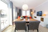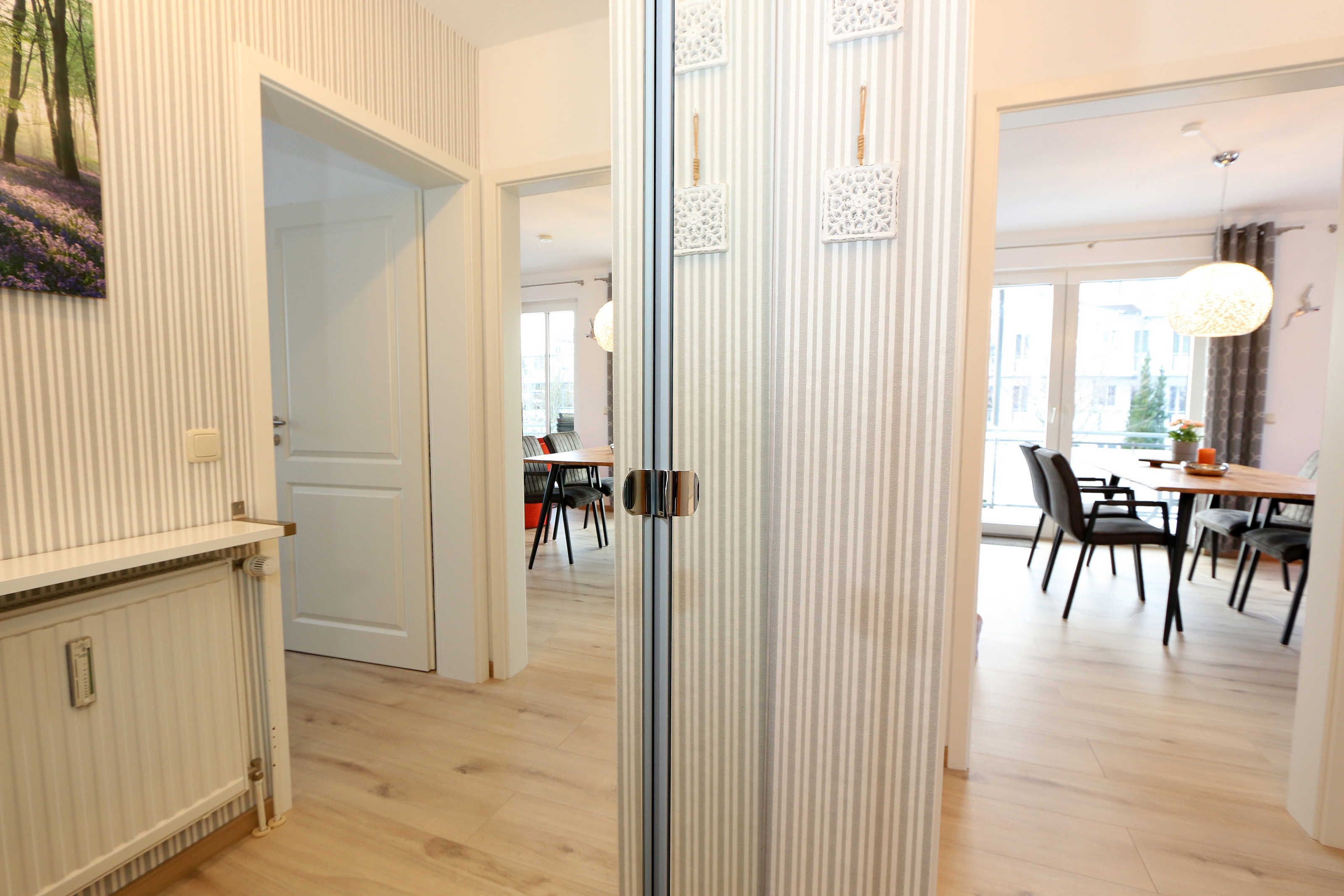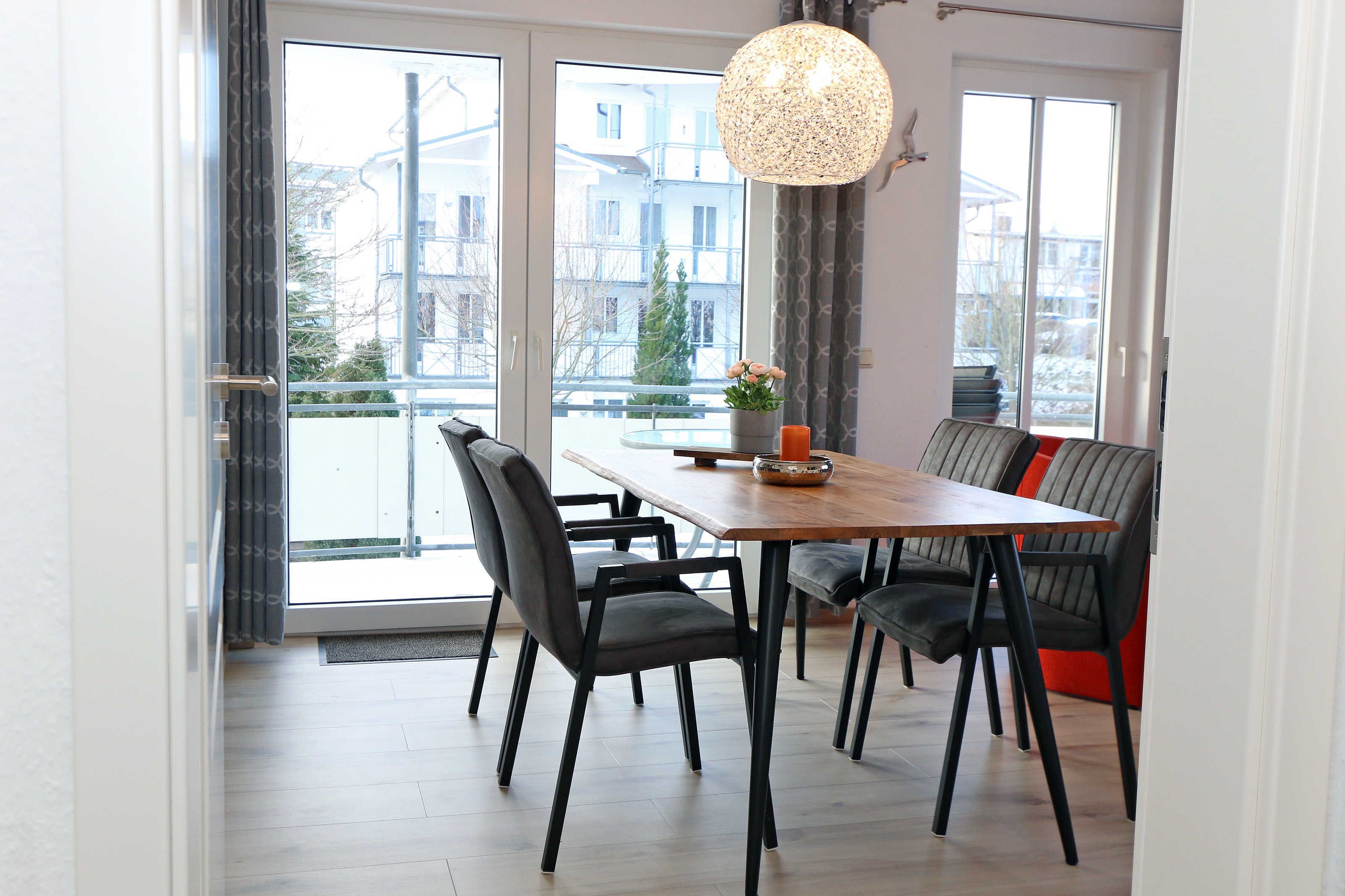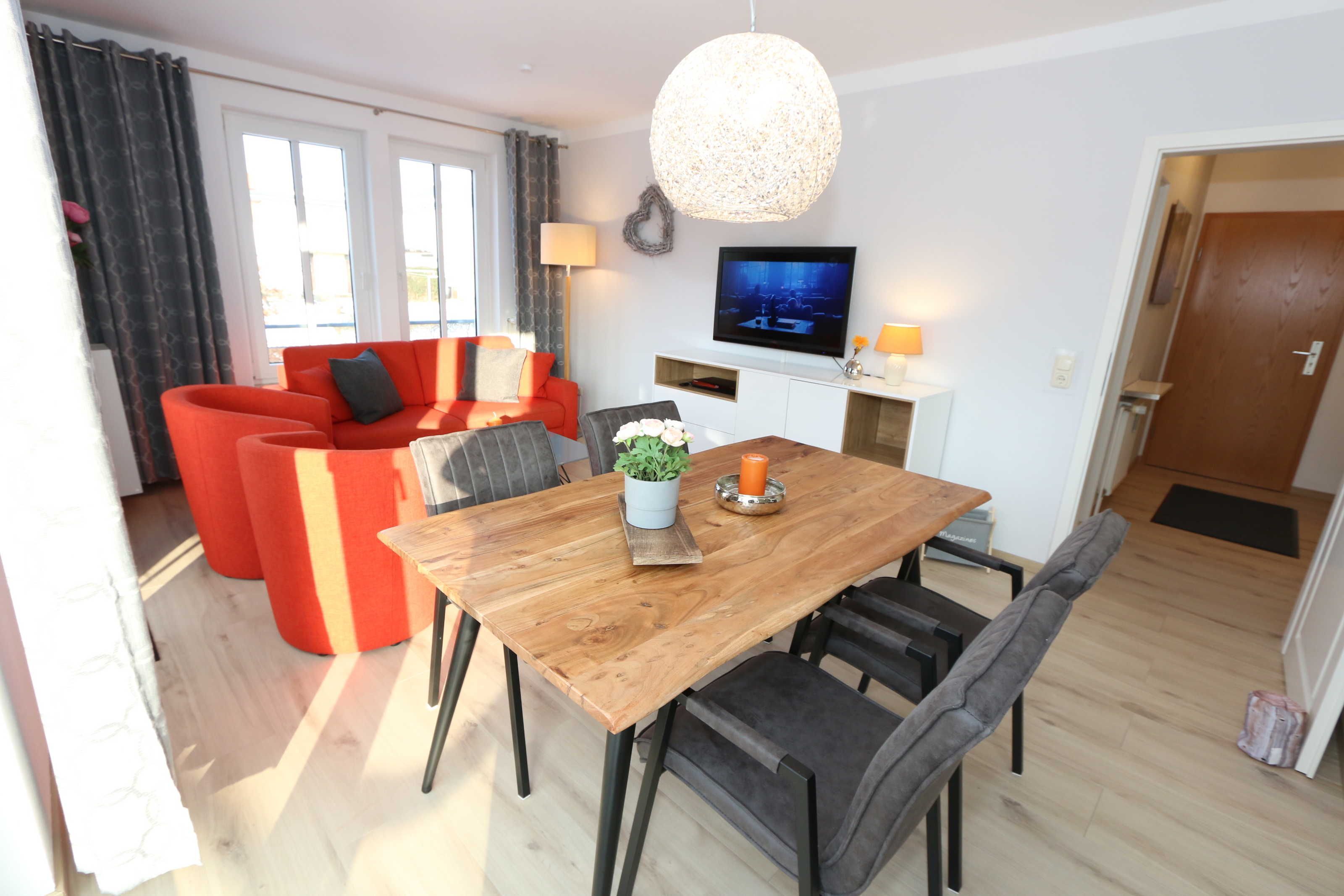 Die Nichtraucherferienwohnung des Hauses Eintracht ist eine komfortable 2-Raumwohnung in der 1. Etage und umfasst etwa 56m², somit bietet sie Platz für bis zu 4 Personen. Sie setzt sich zusammen aus einem Wohnzimmer mit Zugang zum Balkon, einem Schlafzimmer, einer Küchenzeile, einem Flur und einem Badezimmer. Der Wohnbereich ist liebevoll und detailreich eingerichtet. In dem lichtdurchfluteten Raum finden sie, neben zwei Sessel, einen Couchtisch, eine Schlafcouch (1,60m x 2,00m), welches als Schlafmöglichkeit für 2 Personen geeignet ist. Ein Smart-TV sowie ein DVD-Player ermöglichen es ihnen, nach einem eindrucksvollen Tag einen gemütlichen Filmabend mit den Liebsten zu verbringen. Auch ein Radio mit CD-Player und verschiedene Lektüren für die Bücherwürmer unter Ihnen sind vorzufinden. Auf einen Internetzugang (WLAN) brauchen Sie nicht zu verzichten. Des Weiteren befindet sich hier auch ein schöner Esstisch mit vier bequemen Stühlen, die sich direkt am Balkon Fenster befinden. Auf diesem zu Süd gerichteten Balkon befindet sich ein Tisch mit vier Stühlen, einen Sonnenschirm sowie einer Gartenbank. Die neu moderne Küchenzeile ist ausgestattet mit einem Ceranfeld, Backofen und einem Kühlschrank mit Eisfach, Geschirrspüler, Mikrowelle, Wasserkocher, Toaster, Kaffeemaschine und diverse Kochutensilien. Das Schlafzimmer ist mit einem Doppelbett (1,80m x 2,00m), verstellbare Lattenroste, Nachttischablagen und einem geräumigen Kleiderschrank ausgestattet. Wie im Wohnzimmer ist das Schlafzimmer angenehm hell, auch hier befindet sich ein TV-Gerät. Bei Bedarf können sie jedoch einfach die Raffrollos zuziehen und dunkeln den Raum somit komplett ab. Sollten sie feststellen, dass ihre Kleidung im Koffer zerknittert ist, so finden sie im Schlafzimmer sowohl ein kleines Bügelbrett als auch ein Bügeleisen vor. Das Badezimmer setzt sich zusammen aus einer modernen Regendusche, einem großen Waschtisch mit einem geräumigen Unterschrank, einem WC, einem großen beleuchteten Spiegel sowie einem Handtuchheizkörper. Auch ein Fön steht Ihnen zur Verfügung. Natürlich ist auch an die kleinen Gäste gedacht, so dass Sie sich an verschiedenen Spielzeuge, Gesellschaftsspielen und Kinderbüchern erfreuen können. Ihr PKW-Stellplatz (Nr.16) befindet sich direkt am Haus. Zu der Villa Eintracht gehört auch ein kleiner Kinderspielplatz. Leider sind bei uns keine Haustiere erlaubt. Die Erstausstattung eines Wäschepaketes (komplette Bettwäsche, 1 Duschhandtuch, 2 kleine Handtücher, 2 Geschirrhandtücher) können Sie bis 14 Tage vor Anreise gegen einen Aufpreis dazu buchen oder durch eigene ergänzen.