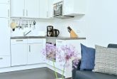 Auch aus der Unterkunft genießen Sie die Nähe zum Strand und den weiten Blick über das Meer. KALA verfügt über einen Nord-Balkon und eine Süd-Dachterrasse, ein Schlafzimmer mit Doppelbett und einen großzügigen Wohnbereich mit Ethanol-Kamin und integrieter Küche und Essbereich.