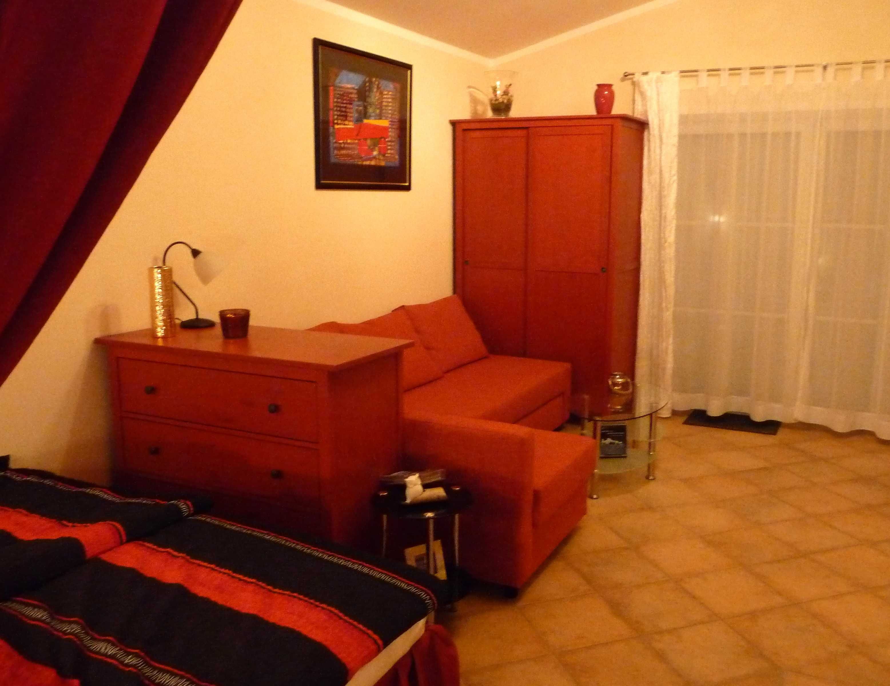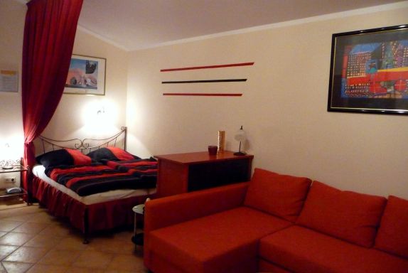Wohn/Schlafraum mit Doppelbett und Sitzgruppe im Appartement Leuchtturm.