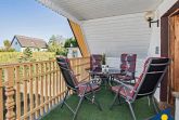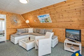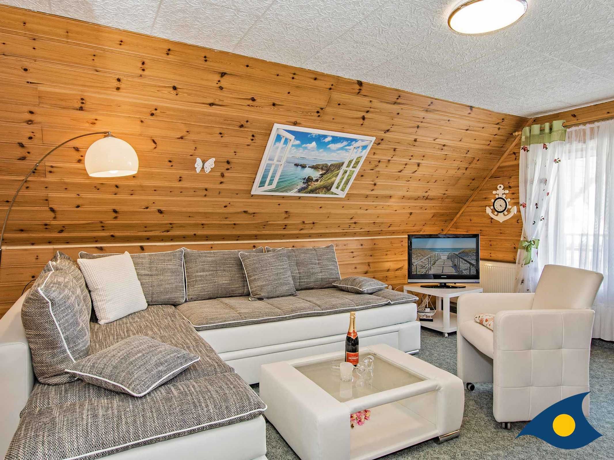 Der große, lichtdurchflutete Wohnraum hält neben der gemütlichen Sitzlandschaft und dem Essplatz am Fenster 2 Komfortbettliegen als Aufbettung für die 3. und 4. Person bereit (3.+4. Person nur auf Anfrage). Von hier aus haben Sie Zugang zum sonnigen Balkon.