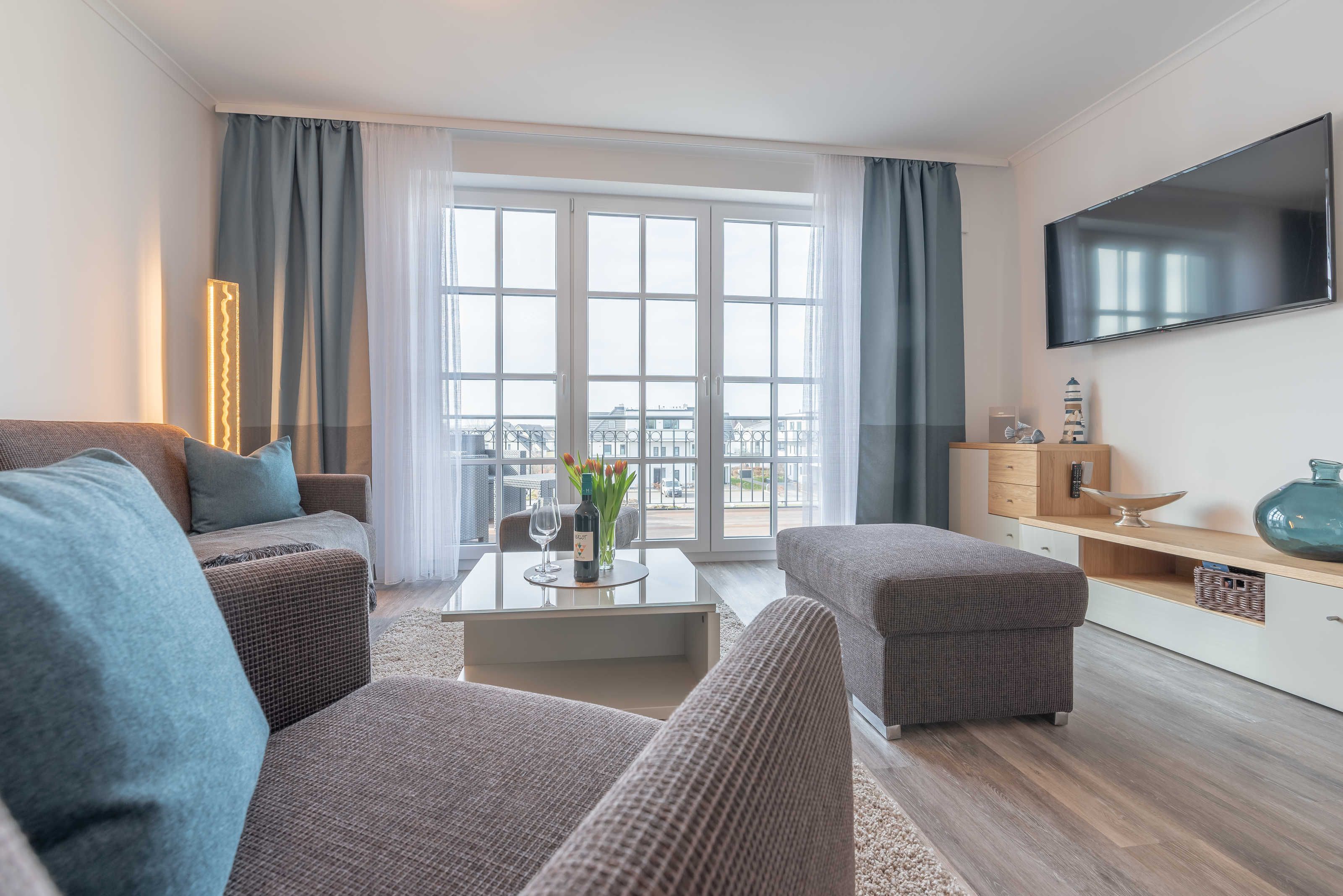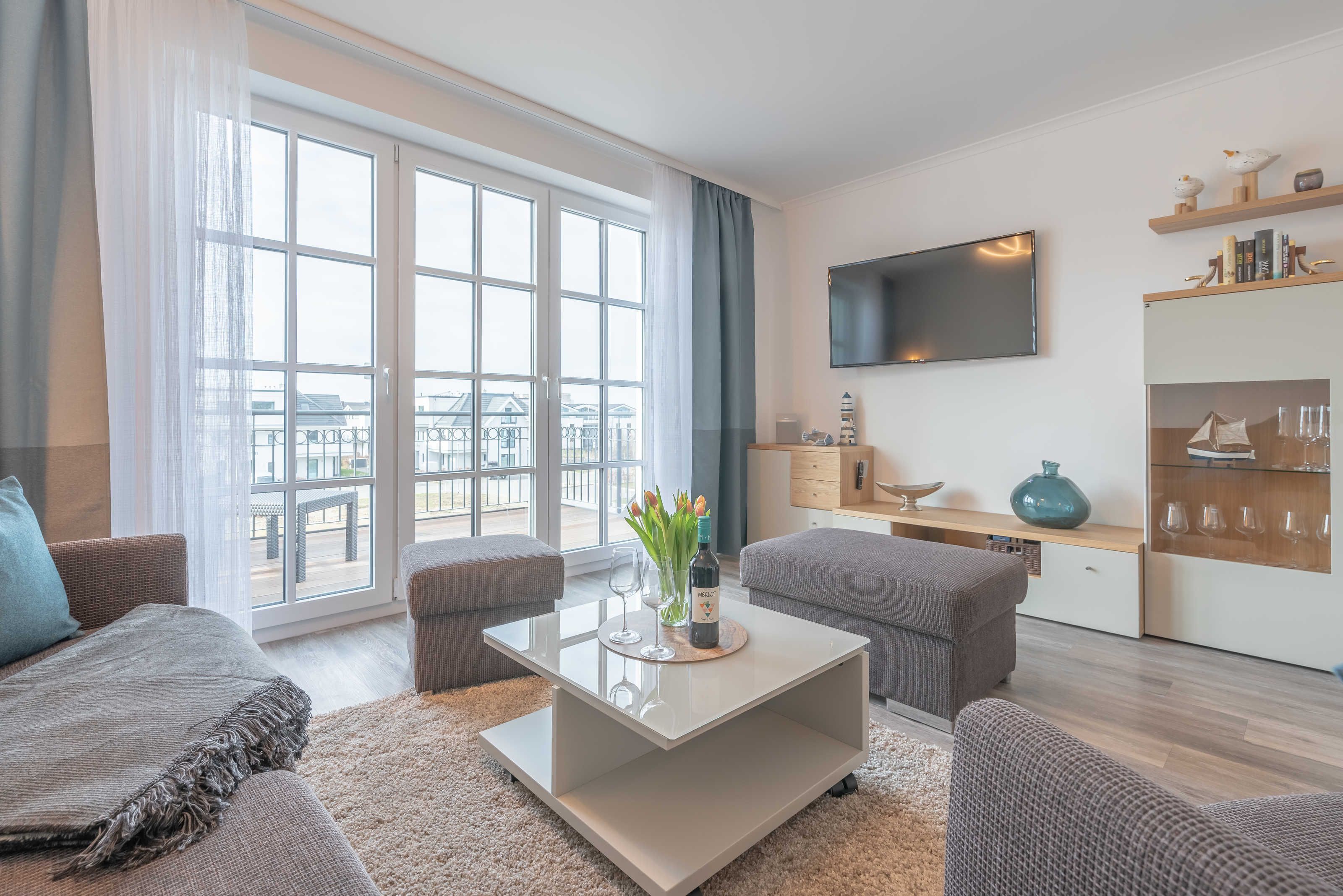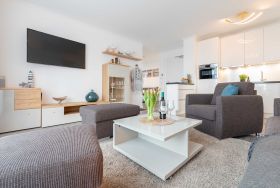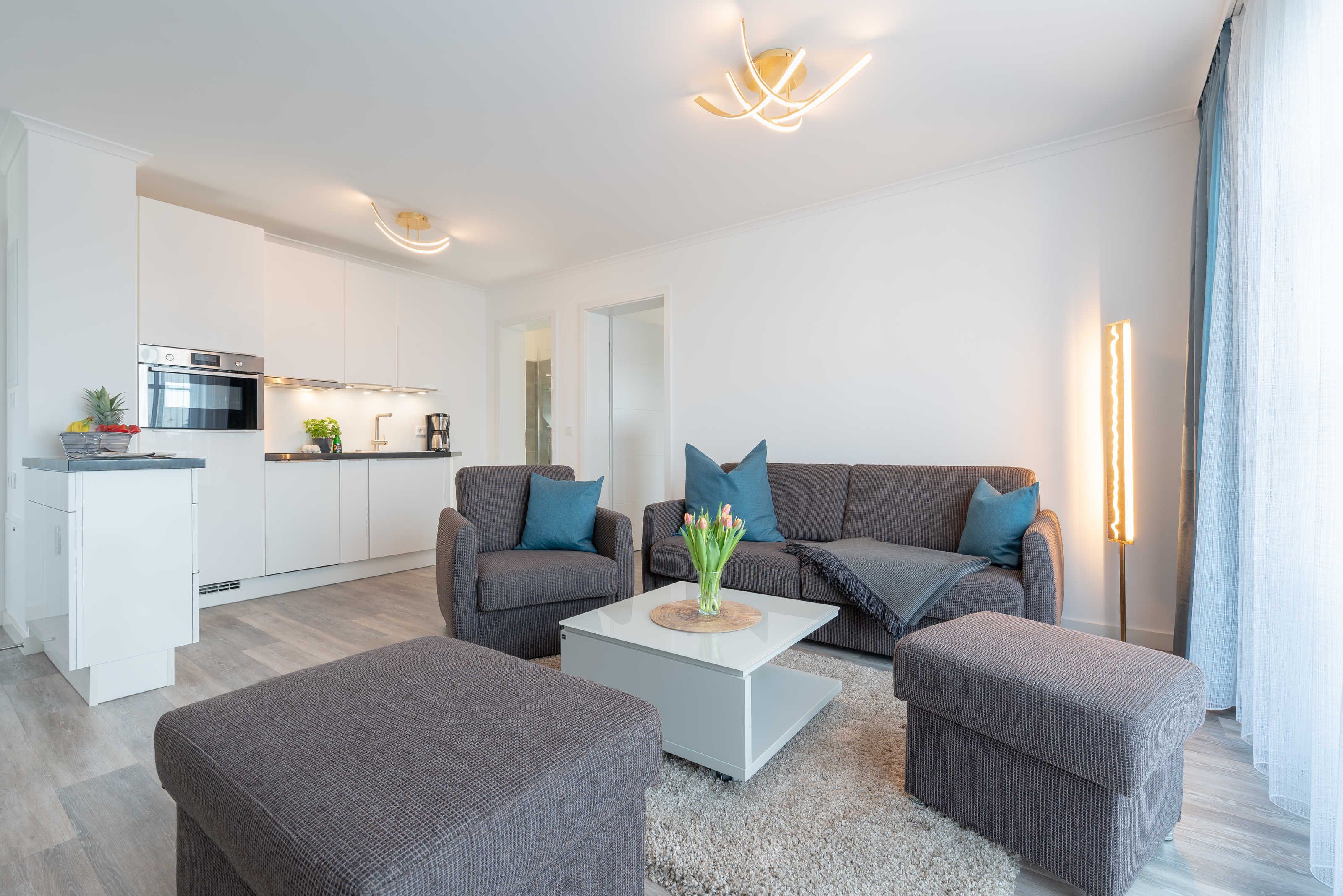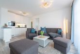 Die Wohnung verfügt über zwei separate Schlafzimmer, ein Wohn- / Esszimmer inkl. offener Einbauküche, ein Duschbad mit ebenerdiger Dusche, zwei Balkone mit direktem Ostseeblick sowie