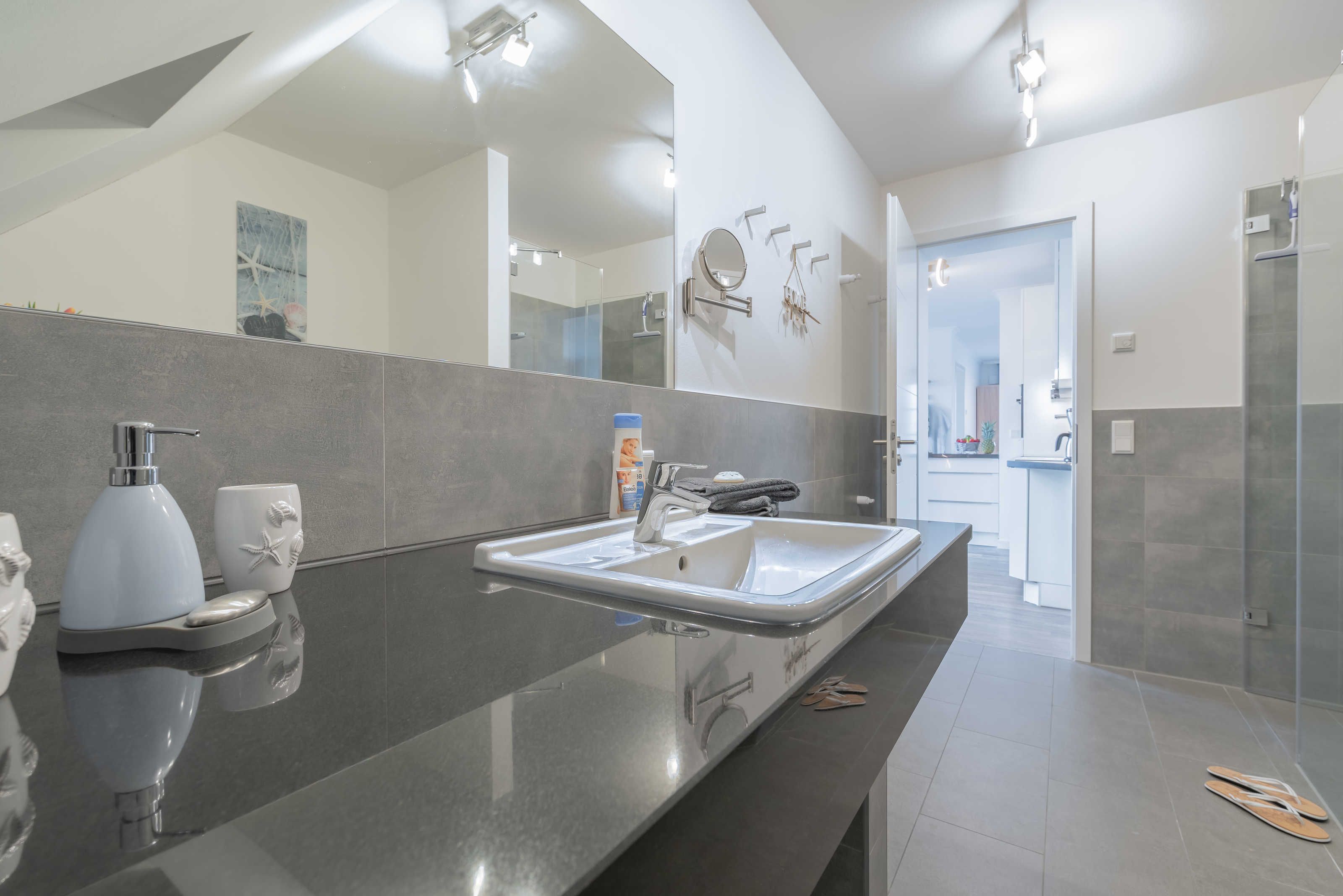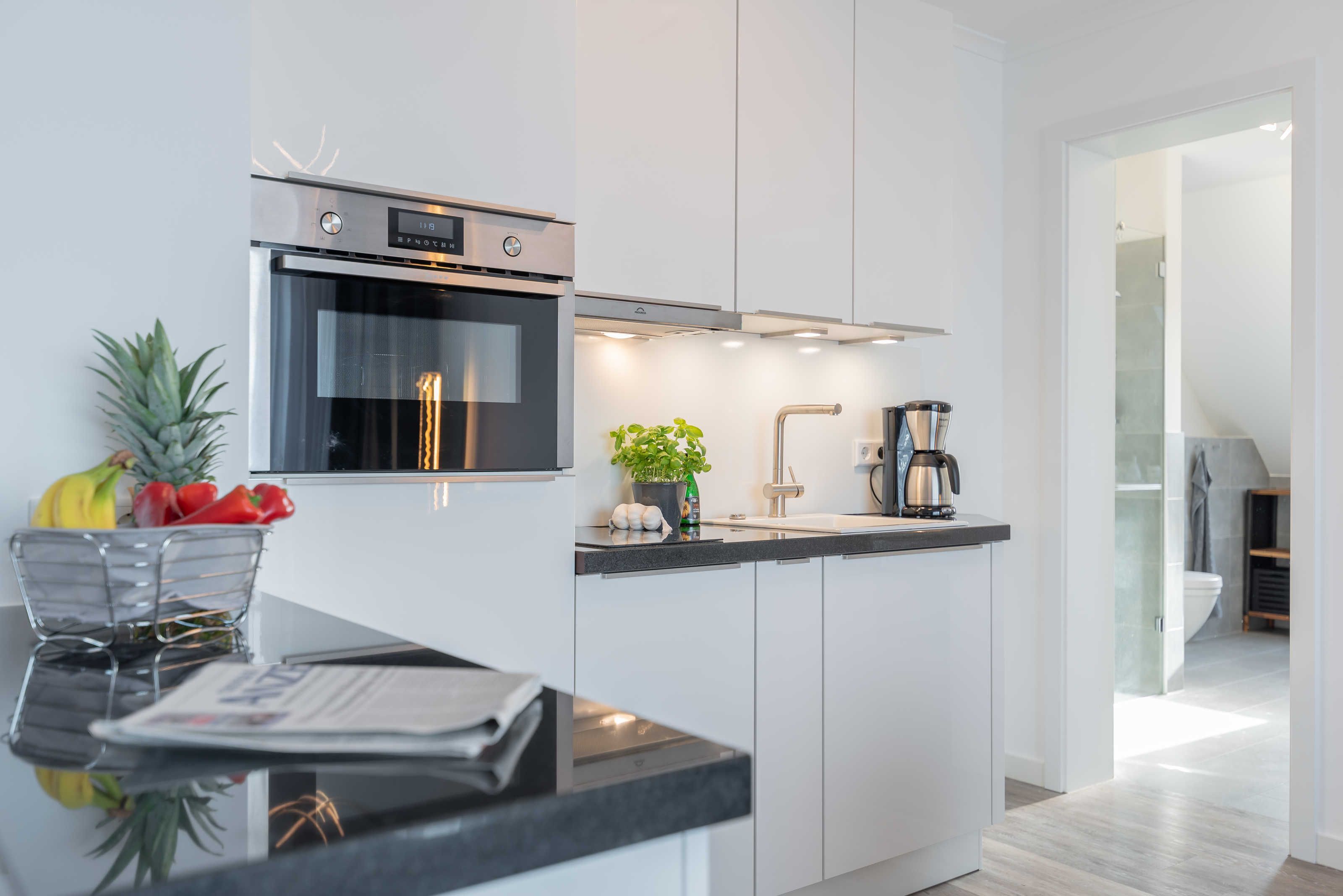 In der voll ausgestatteten Küchenzeile finden Sie alles, was Sie für einen angenehmen Aufenthalt benötigen: Backofen mit integrierter Mikrowelle, 2-Platten-Induktionskochfeld, Kühlschrank mit Tiefkühlfach, Geschirrspüler, Filterkaffeemaschine, Nespressomaschine, Toaster, Wasserkocher usw.