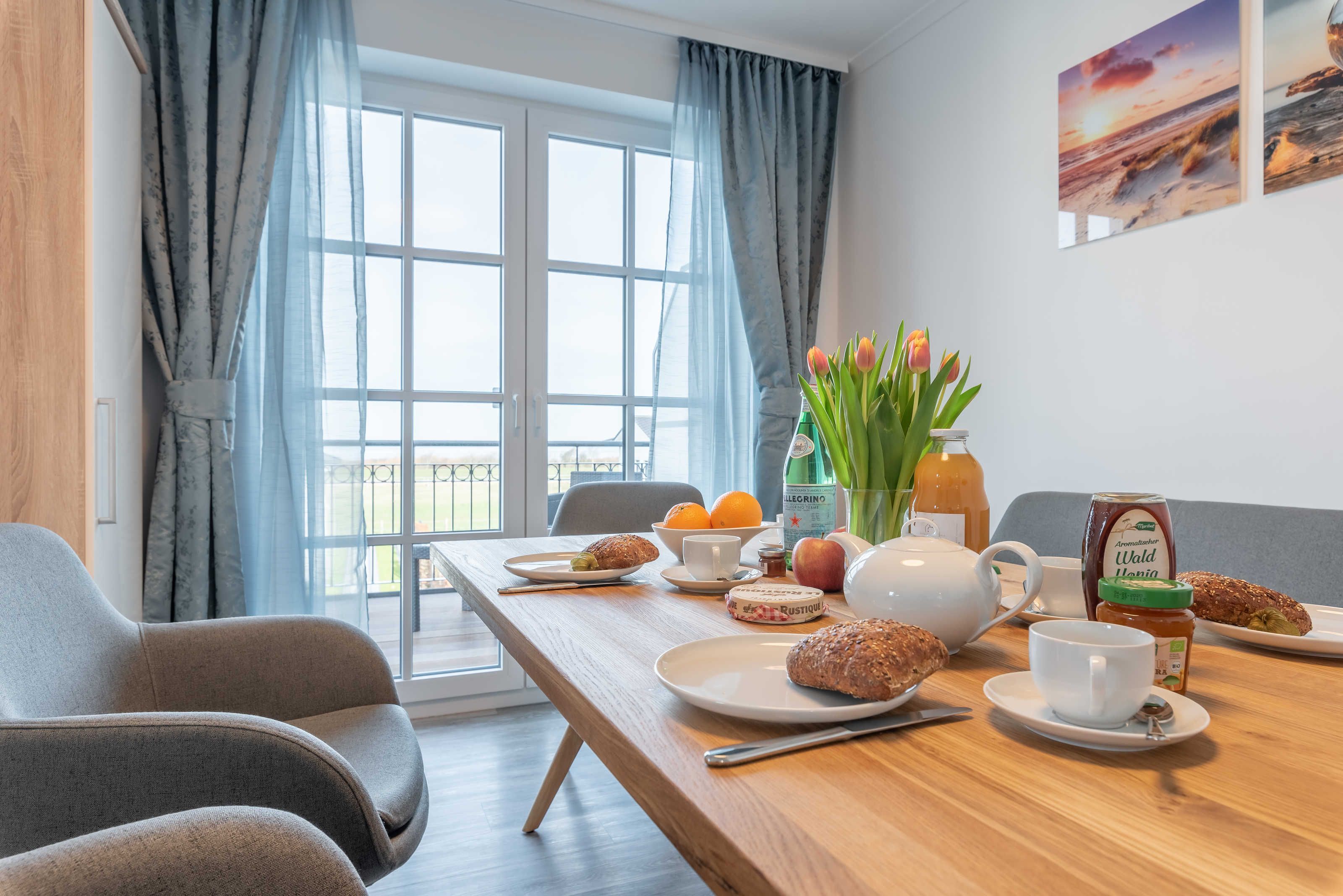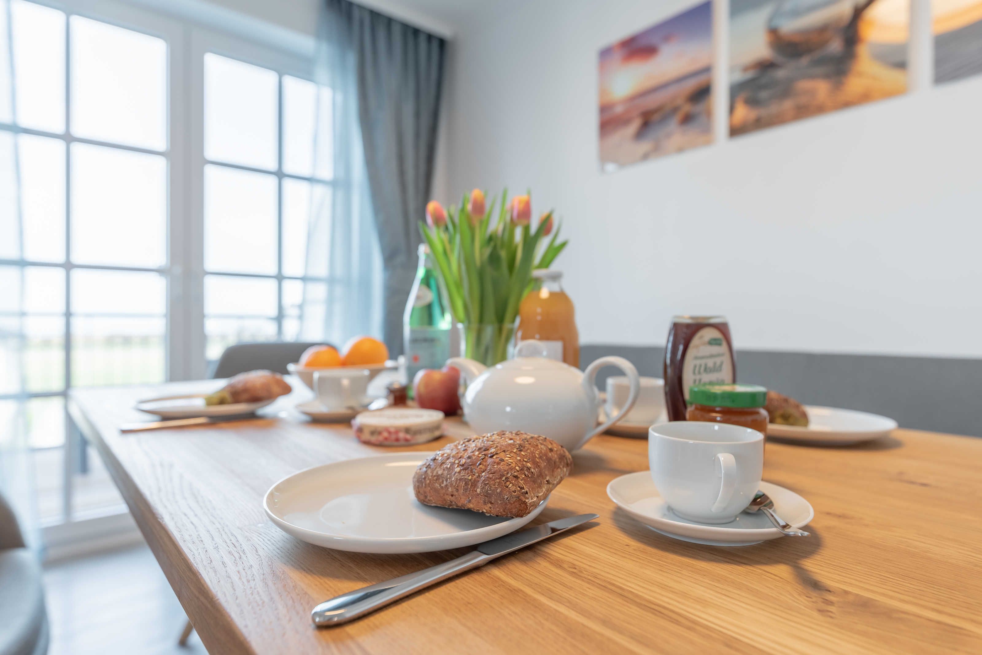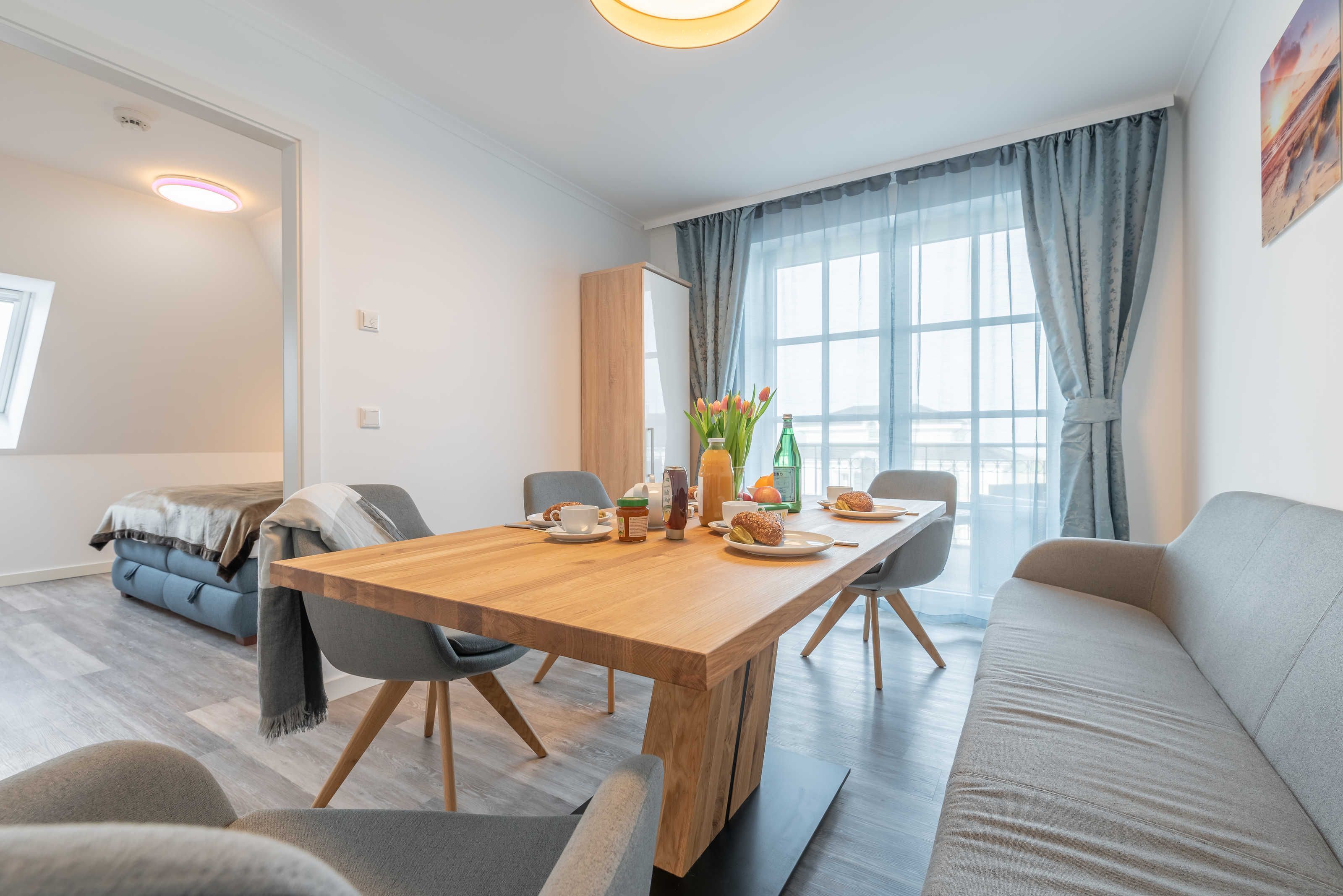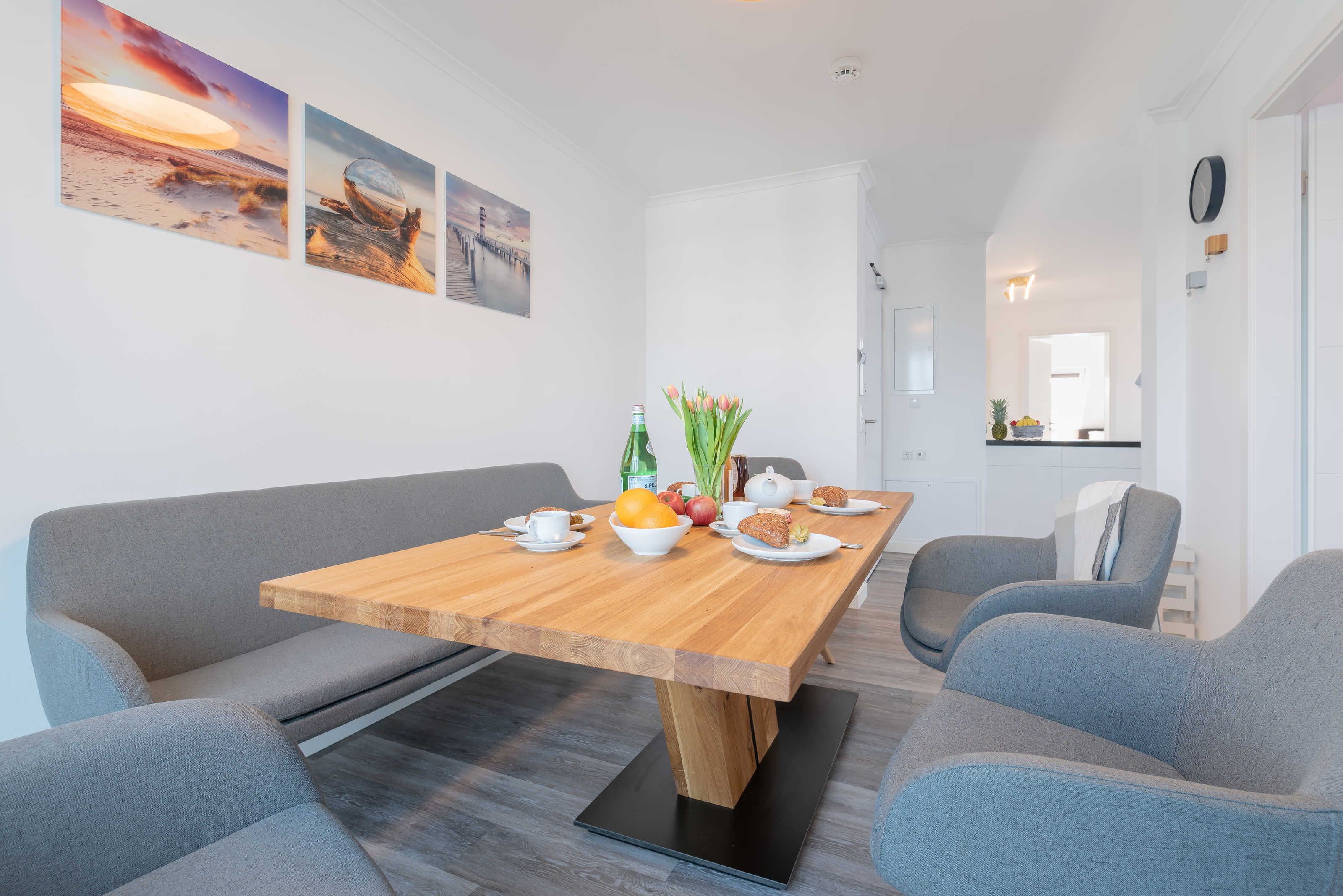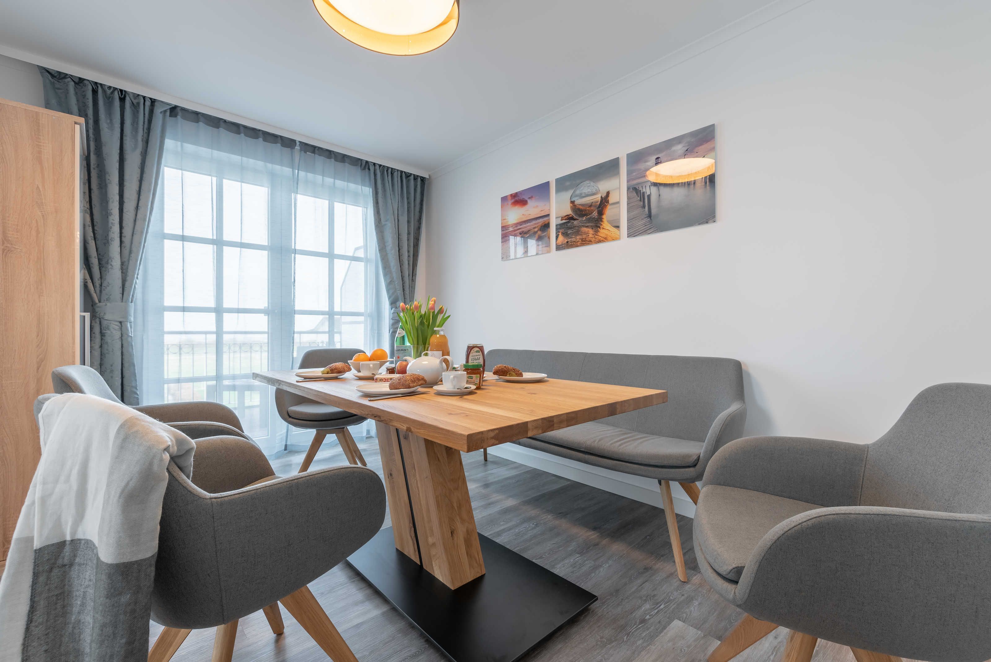 Das Esszimmer ist mit einem großen Esstisch sowie vier Stühlen und einer großen Sitzbank ausgestattet. Hier können Sie bereits beim Frühstück einen direkten Blick auf die Ostsee genießen oder beim Lesen eines Buches Ihre Blicke in die Ferne schweifen lassen.