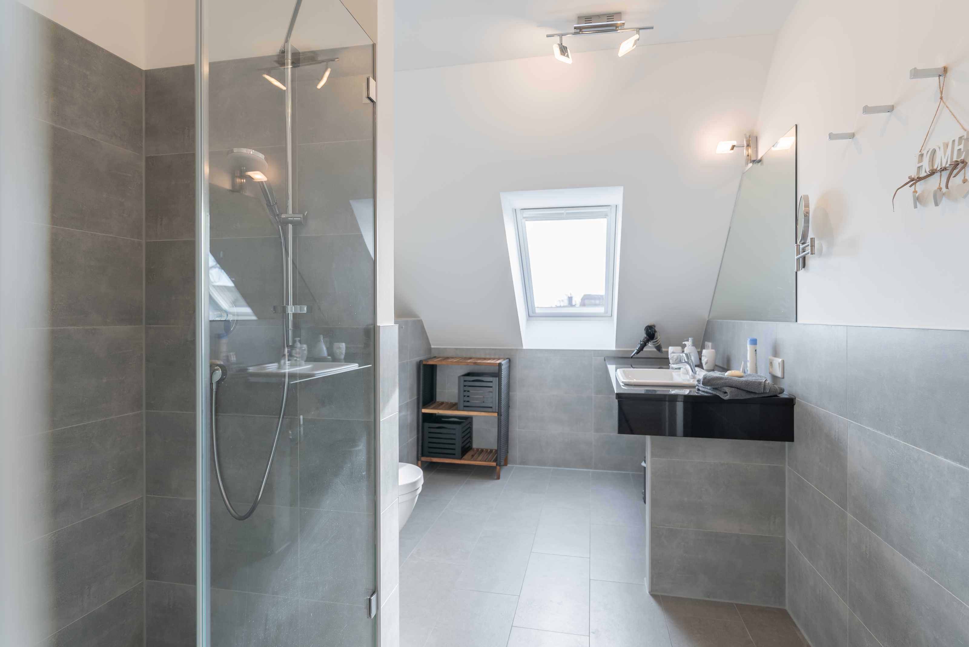 Das elegante Bad ist mit einer bodengleichen Dusche, einem Waschtisch mit großem Spiegel, einem zusätzlichen Kosmetikspiegel, einem Fön sowie einem elektrischen Handtuchheizkörper ausgestattet. Die gesamte Wohnung ist mit einer komfortablen Fußbodenheizung ausgerüstet.