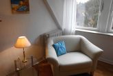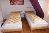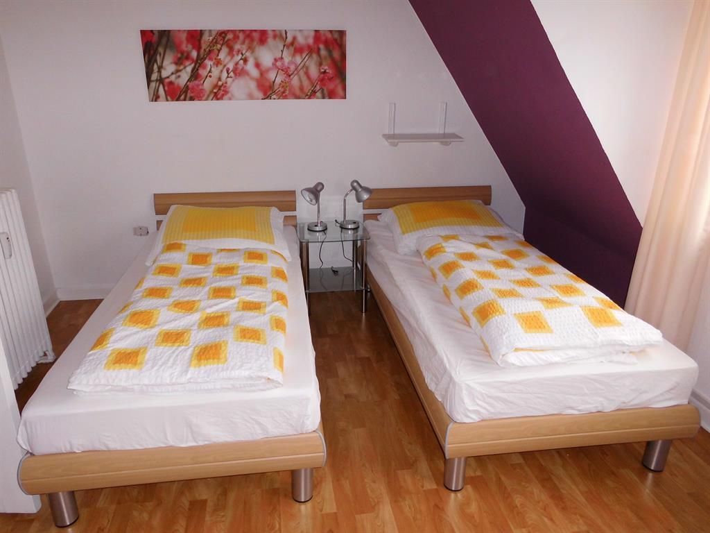 Die Ferienwohnung liegt im 2. OG eines kleinen Mehrfamilienhauses. Sowohl das Wohnzimmer, als auch das Schlafzimmer sind lichtdurchflutet. Das Schlafzimmer ist mit 2 Einzelbetten (90 x 200 cm, verstellbares Lattenrost, Federkernmatratze), Nachtschränken und einem großen Kleiderschrank ausgestattet.