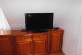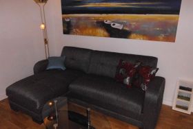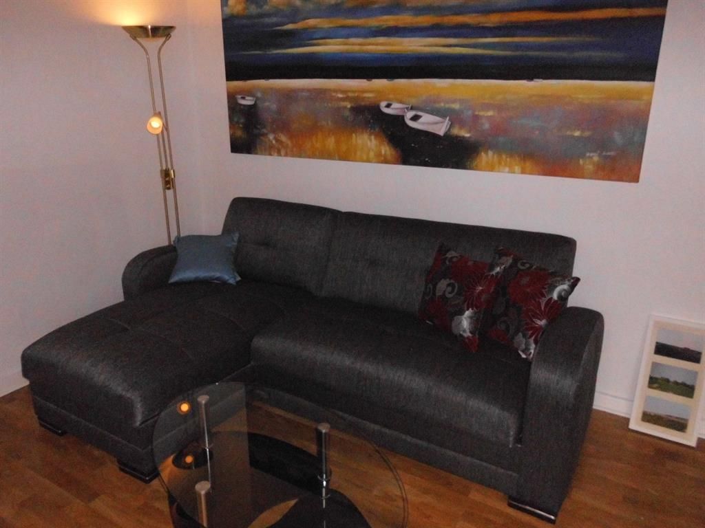 Im Wohnzimmer befindet sich ein Ecksofa mit Schlaffunktion, Couchtisch, Anrichte, LED-Fernseher (DVB-T), Musikanlage und einem gemütlichen Sessel mit kleinem Tisch.