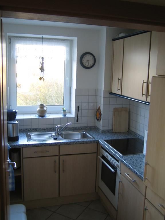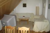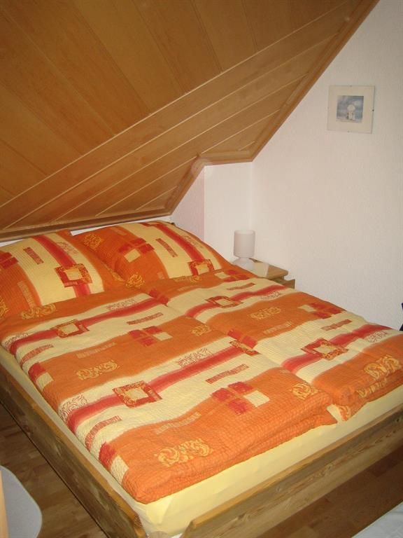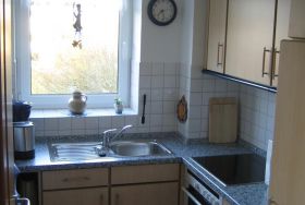 Ferienwohnung 1 Die 54 m²-Wohnung ist eingerichtet für 4 Personen und in 3 Zimmer aufgeteilt, Wohn-/ und Esszimmer mit Sofa und Esstisch mit 4 Stühlen, Schlafzimmer mit Bett (140X200), Studio (DG) mit einem Schlafzimmer mit zwei einzelnen Betten (100X200), die zusammengestellt werden können sowie einer gemütlichen Sitzecke, Einbauküche mit Geschirr und Kochutensilien, Duschbad. Im Keller stehen Ihnen eine Waschmaschine und Wäschetrockner zur Verfügung.