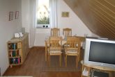 Im Untergeschoss der Ferienwohnung befinden sich ein im nordischen Stil sehr gemütlich eingerichteter Wohnraum mit TV, DVD und Radio sowie ein großer Esstisch mit vier Stühlen.