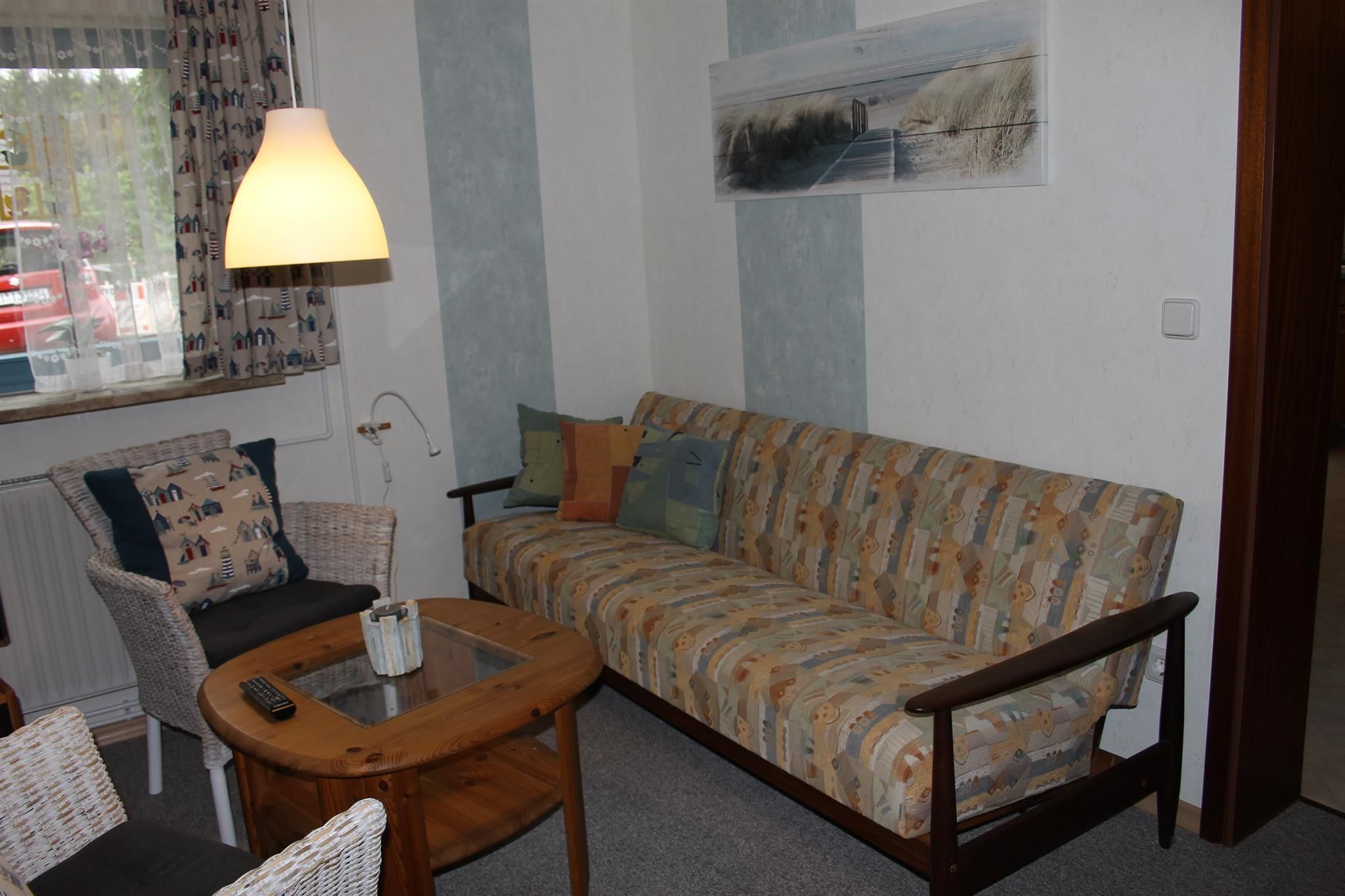 Sie besteht aus einem Wohn-/Schlafzimmer, einer separaten Küche mit Essecke und einem Duschbad. TV, Radio, CD und Internet sind vorhanden. Waschmaschine und Trockner der Vermieter können für einen Anschlag von 5,- € mitgenutzt werden.