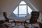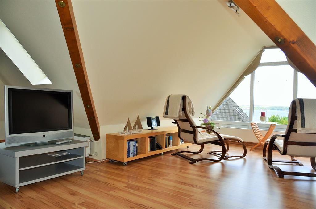 Ein Schlafzimmer mit großem Kleiderschrank bietet 2 Betten, die zusammen oder auseinander gestellt werden können. Im Dachstudio befinden sich ein weiteres Doppelbett und Wäschekommoden sowie ein zweiter Fernseher und 2 Sessel mit tollem Blick auf das Wasser aus dem großen Giebelfenster.