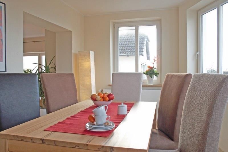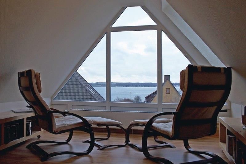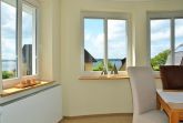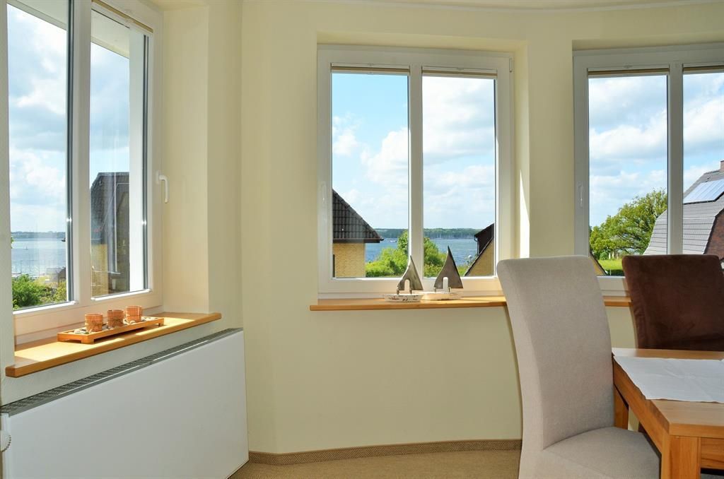 Vom Essplatz im Erker mit einem großen Esstisch mit 6 Stühlen haben Sie einen schönen Blick auf die Förde. Die voll ausgestattete, hochwertige Einbauküche mit Kühl-Gefrierkombination, vierflammigem Ceran-Kochfeld, Backofen, Geschirrspüler, Mikrowelle, Toaster, Kaffee-Pad-Automat, Wasserkocher, Mixer, Durchreiche zum Essbereich.