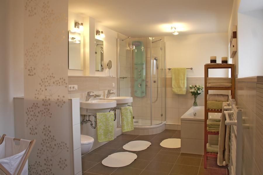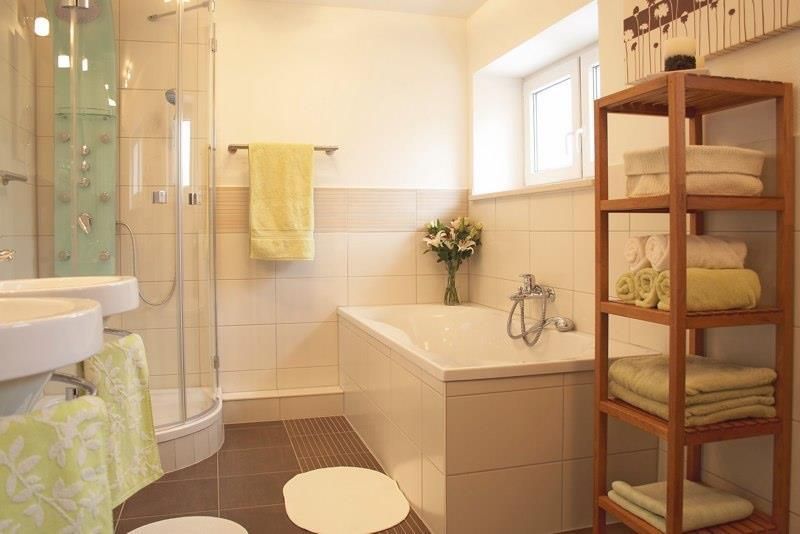 Vollbad mit Wanne und Dusche, zwei Waschbecken, WC, Fön, Waschmaschine, Trockner, Wäscheständer, Bügeleisen und Bügelbrett.