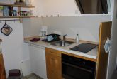 Sie besteht aus einem großen Wohnraum mit einer Bettnische mit einem Doppelbett, einer Kochnische mit Essecke und einem Duschbad. Der Ausblick aus dem Fenster geht auf einen großen Lichtschacht.