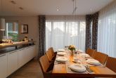Die Häuser sind zweigeschossig mit einem barrierefreien Erdgeschoss. Die hochwertige Ausstattung mit Fußbodenheizung, elektrischen Rollläden in allen Schlafzimmern, Internetzugang und Flachbildfernsehern bietet einen hohen Komfort. Im Erdgeschoss liegt ein großes lichtdurchflutetes Wohn-/ Esszimmer mit offener Küche und Kamin.